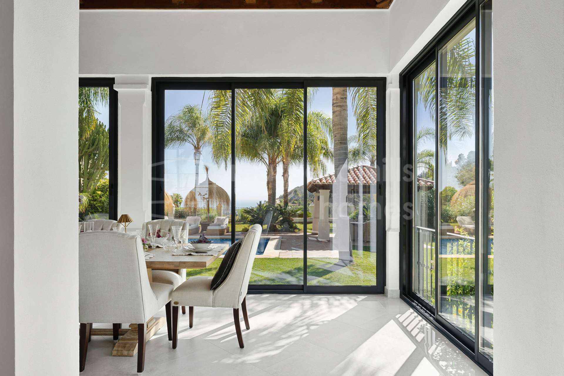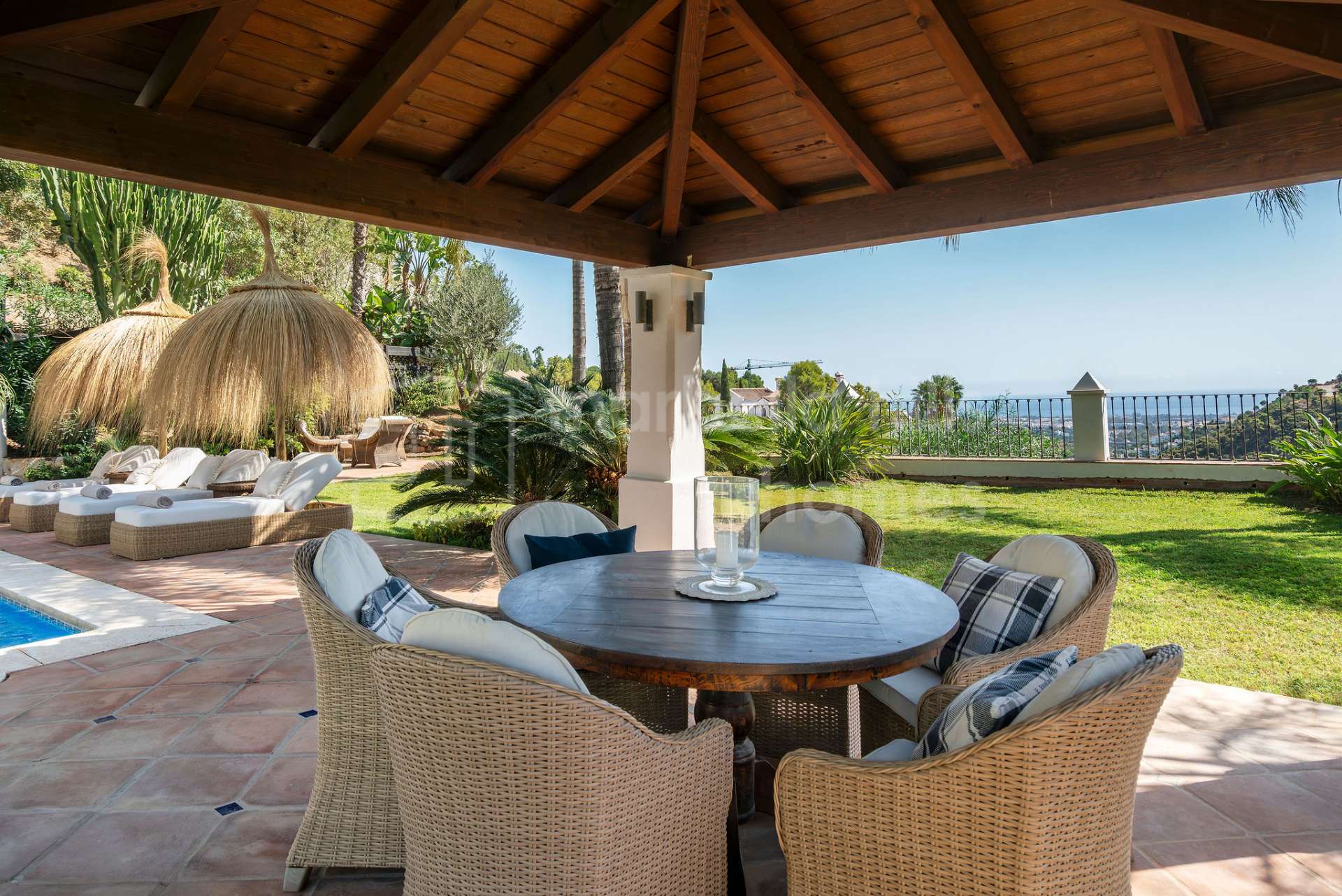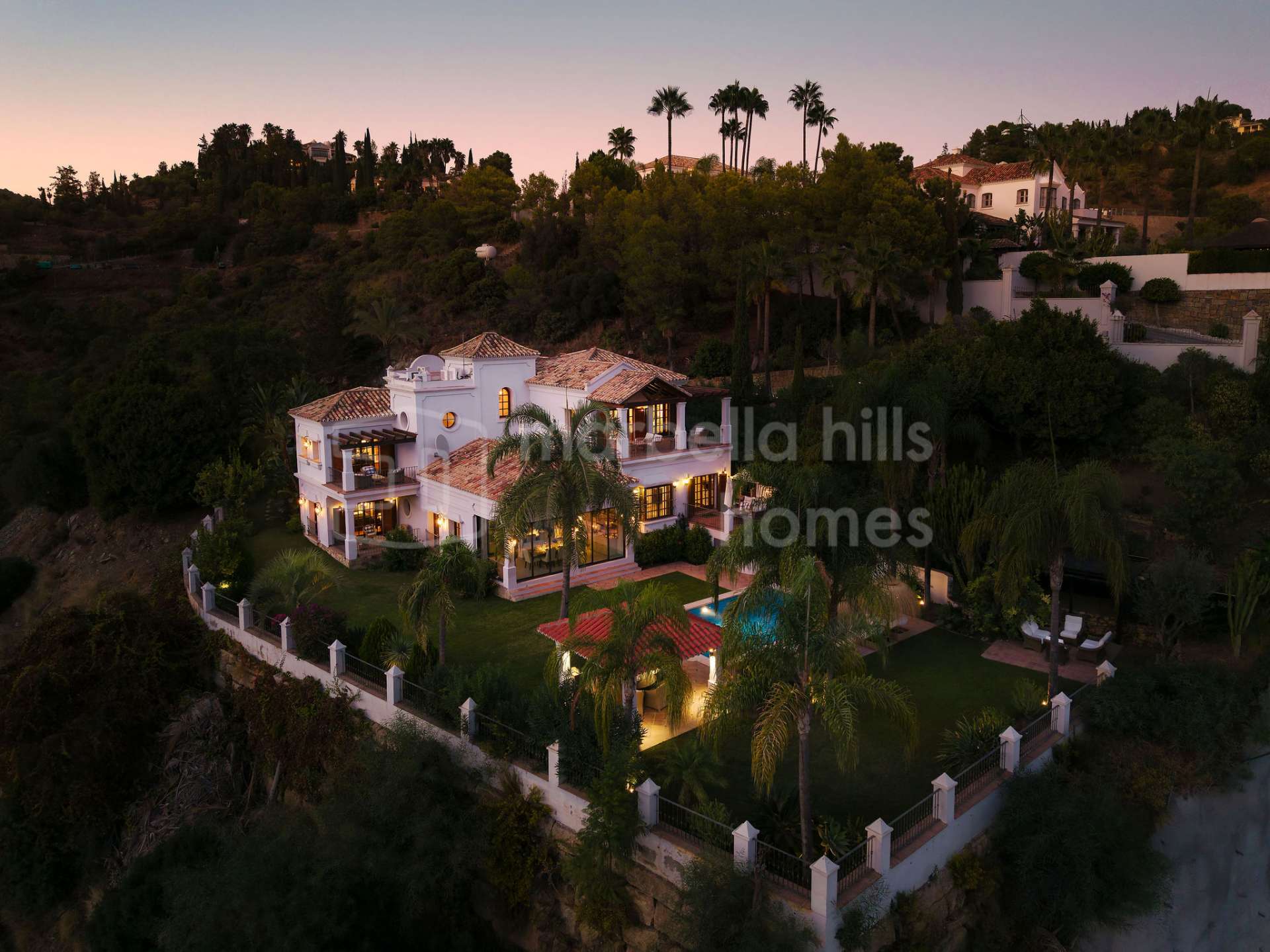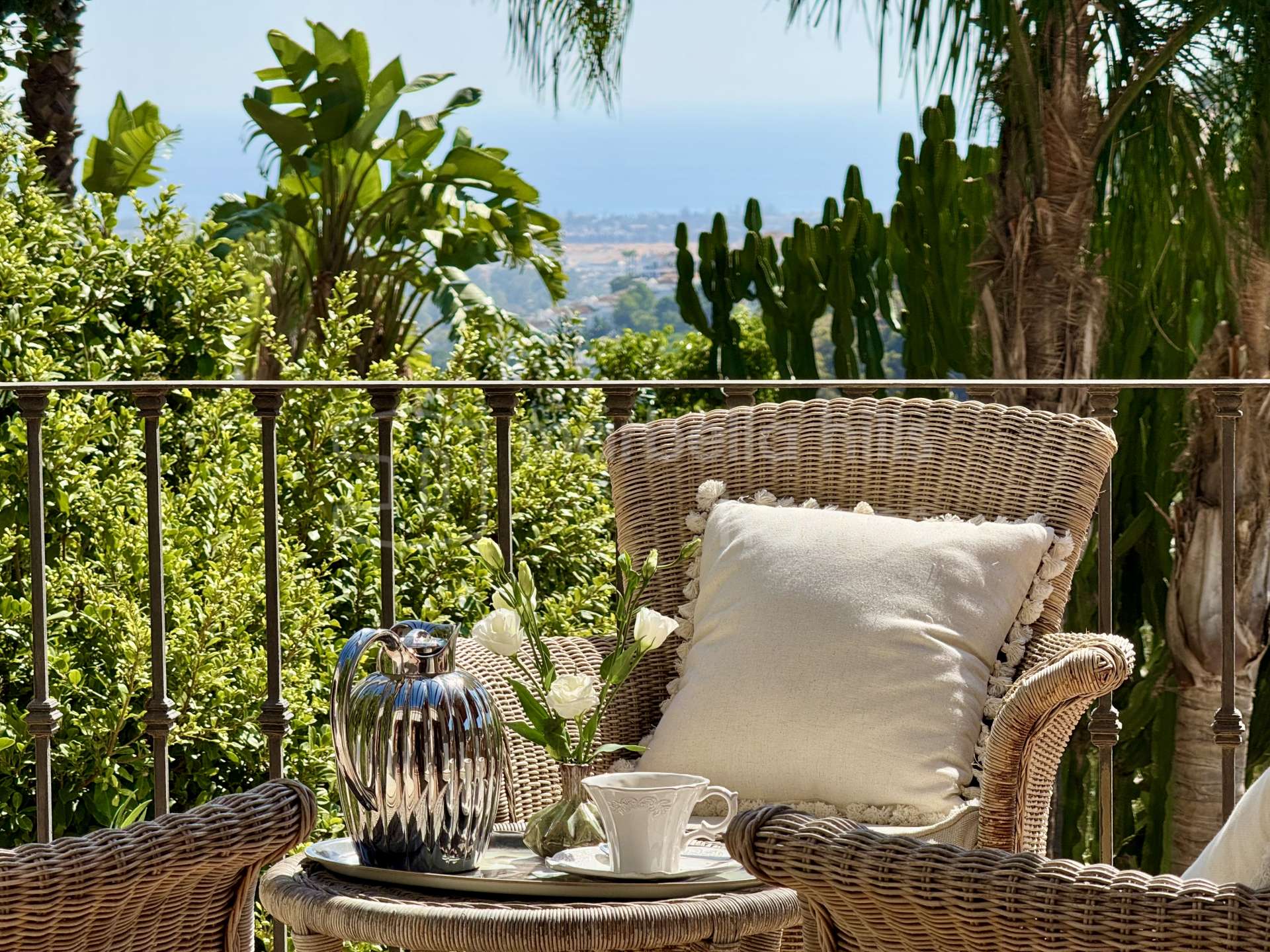 - Spectacular panoramic sea and mountain views – Ideal south and southwest orientation for all-day sunshine and unforgettable sunsets – Lush Mediterranean gardens with jacaranda, lemon, orange, and palm trees enhancing the serene environment