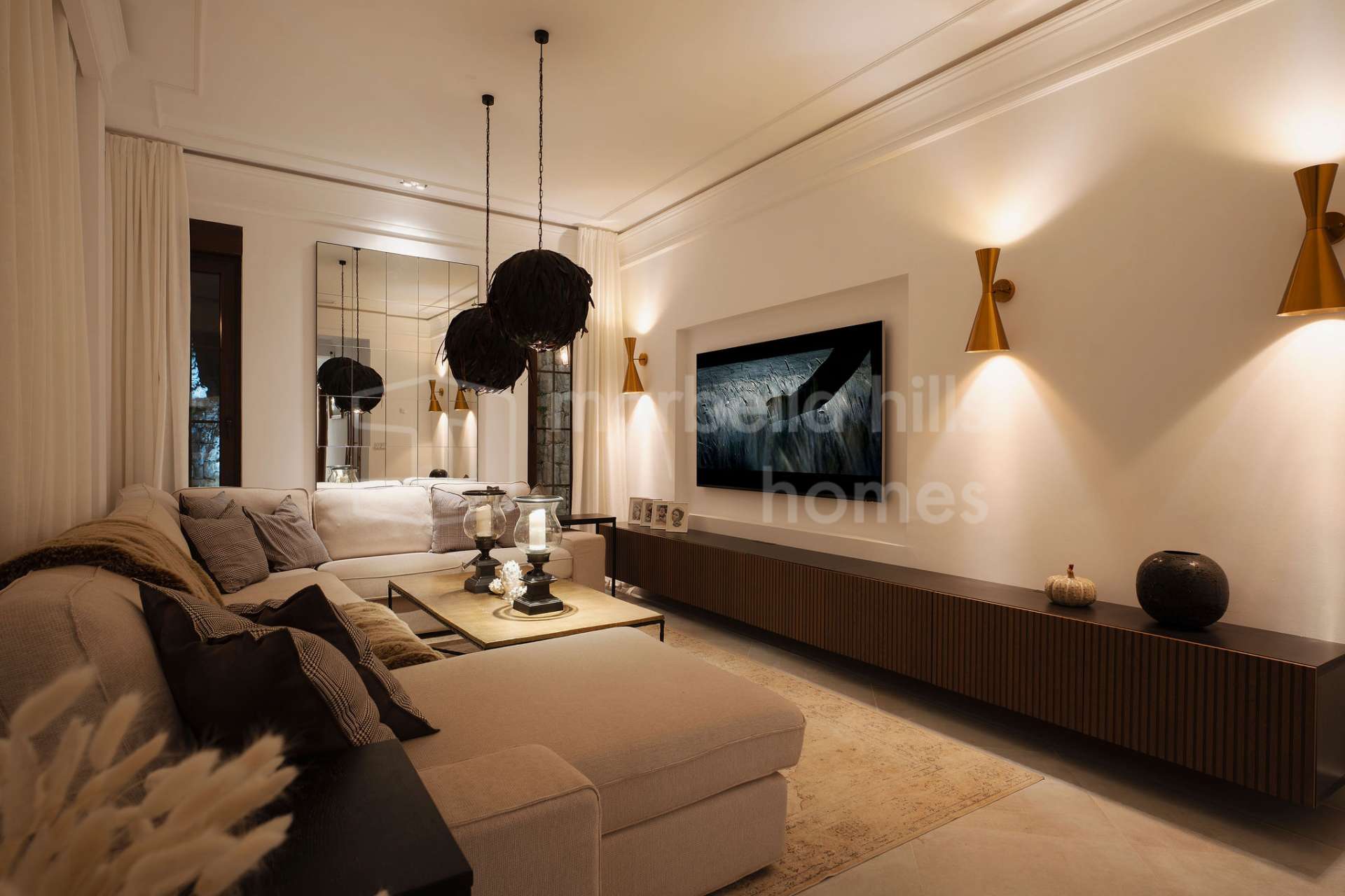 - Underfloor heating throughout – Hot and cold air conditioning – Dedicated TV lounge and home cinema room (convertible into an additional bedroom) – Walk-in wardrobe in the master suite – Integrated surround-sound system – Automatic garden irrigation system