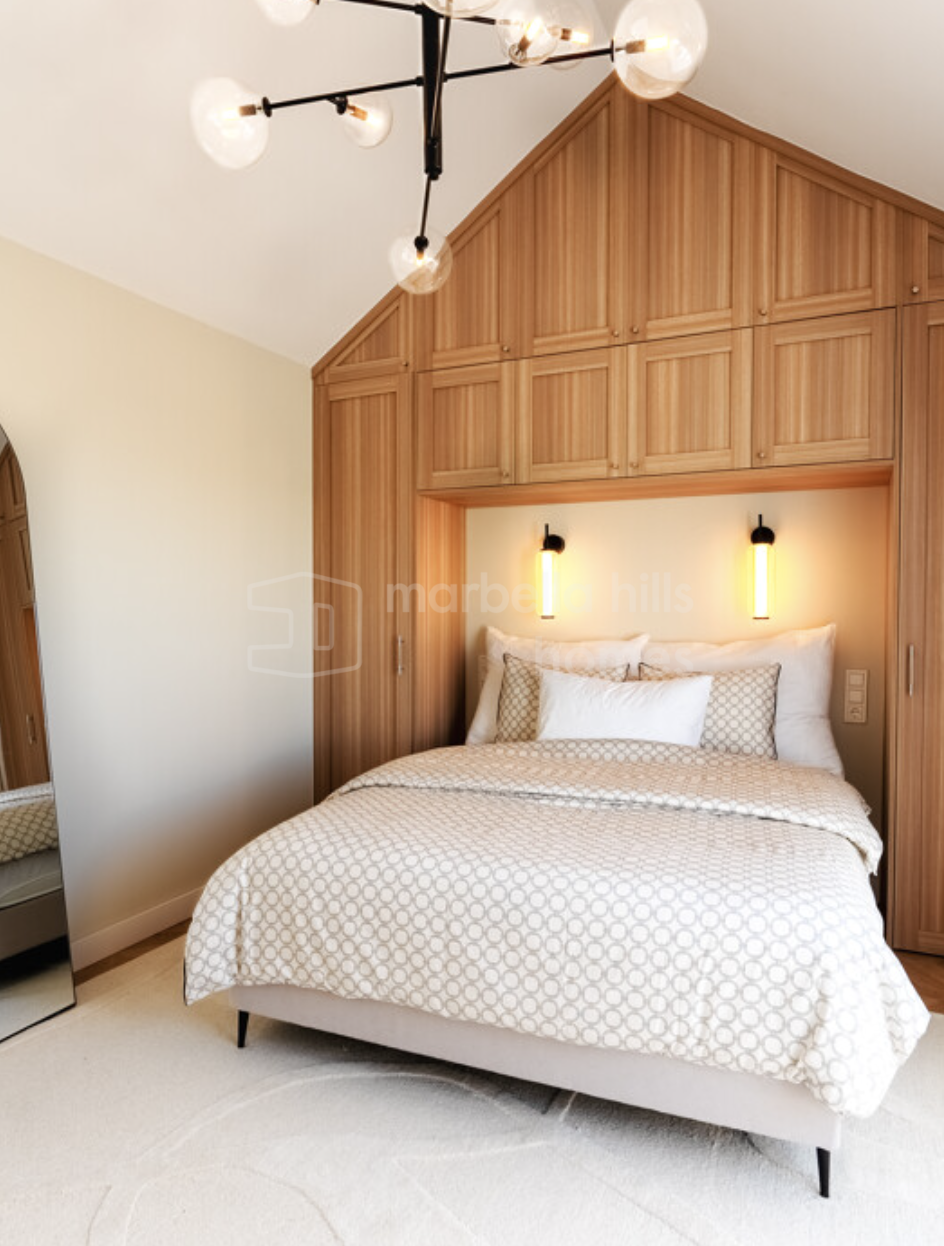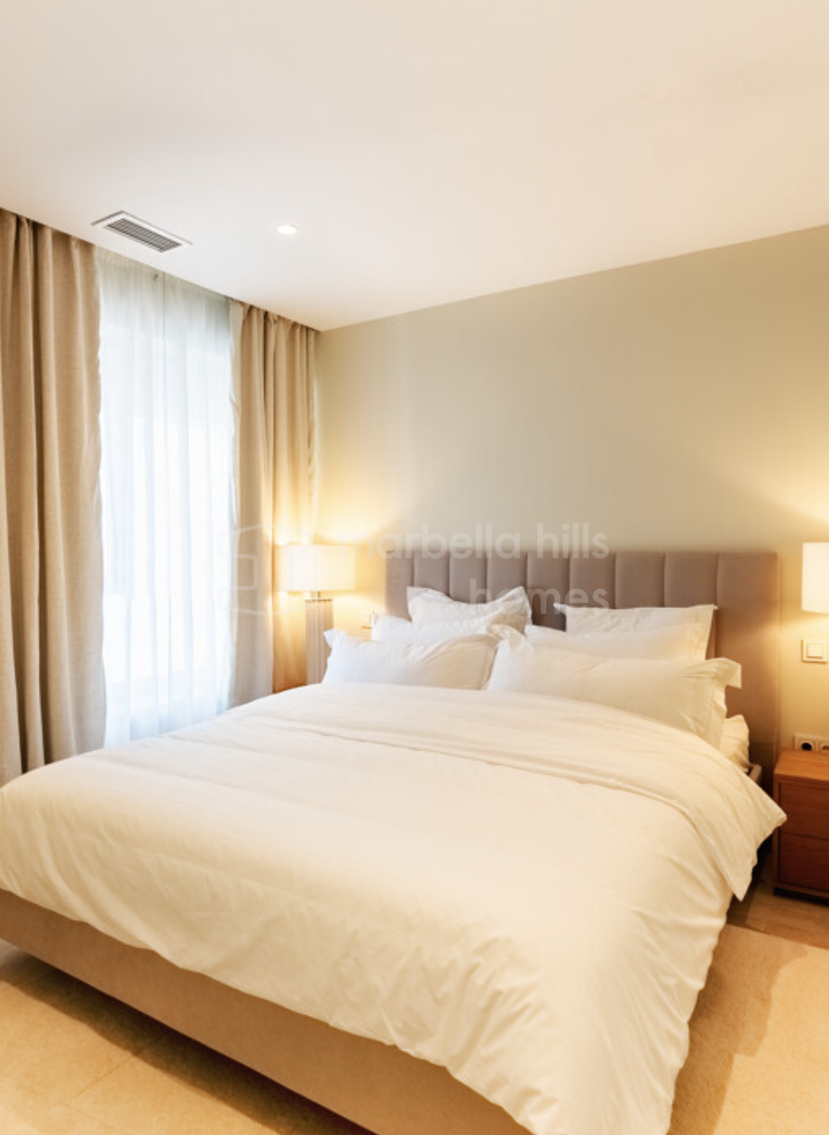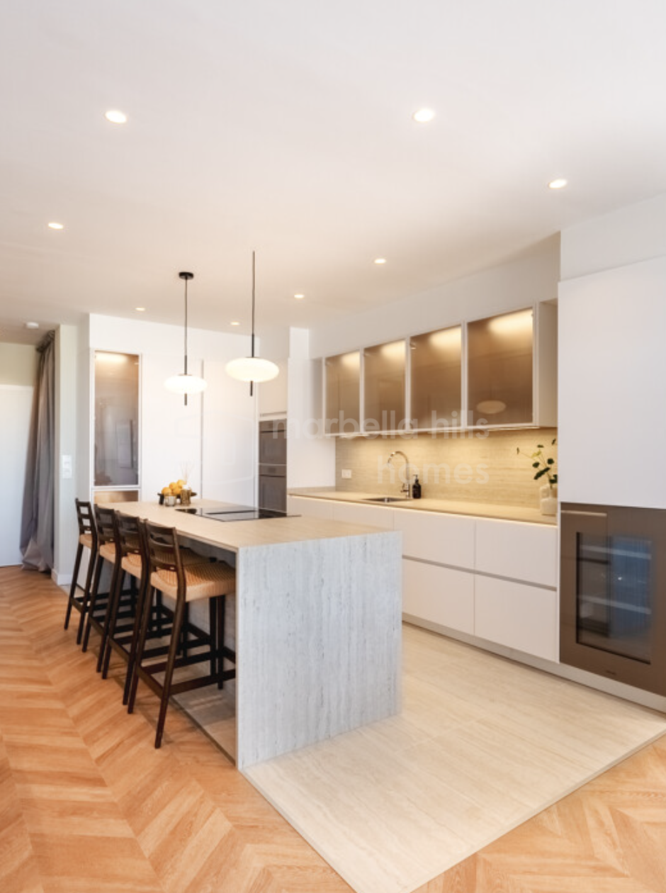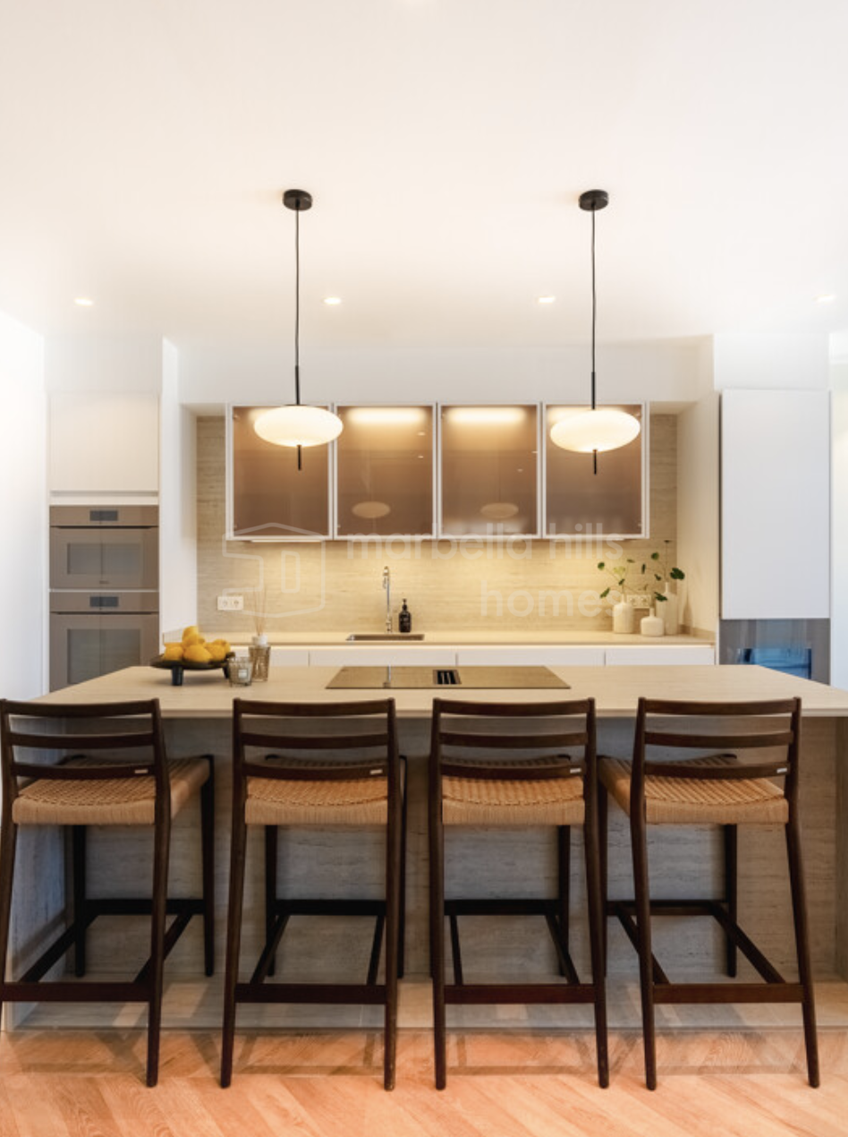 The south-facing terrace serves as an extension of the interior living space, equipped with an outdoor kitchen, lounge seating, and al fresco dining area. Large sliding doors create a seamless indoor-outdoor flow, ideal for enjoying Marbella’s year-round sunshine.