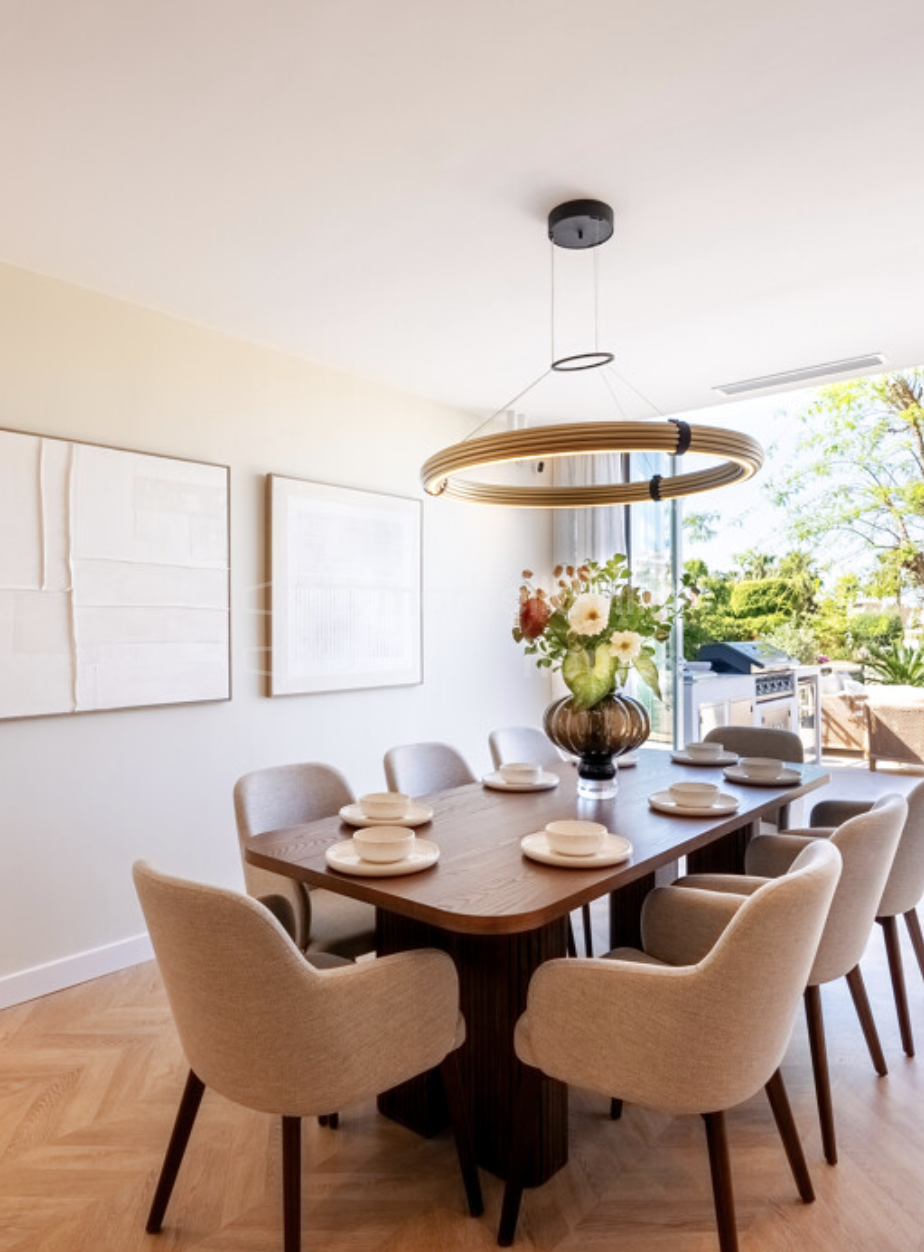 Fully refurbished to the highest standards, the villa is distributed over four levels and designed for contemporary open-plan living. The main floor features a spacious living and dining area connected to a designer kitchen by Nobilia, fitted with premium Miele appliances including an integrated fridge, freezer, wine cooler, and a large central island — perfect for casual dining and entertaining.