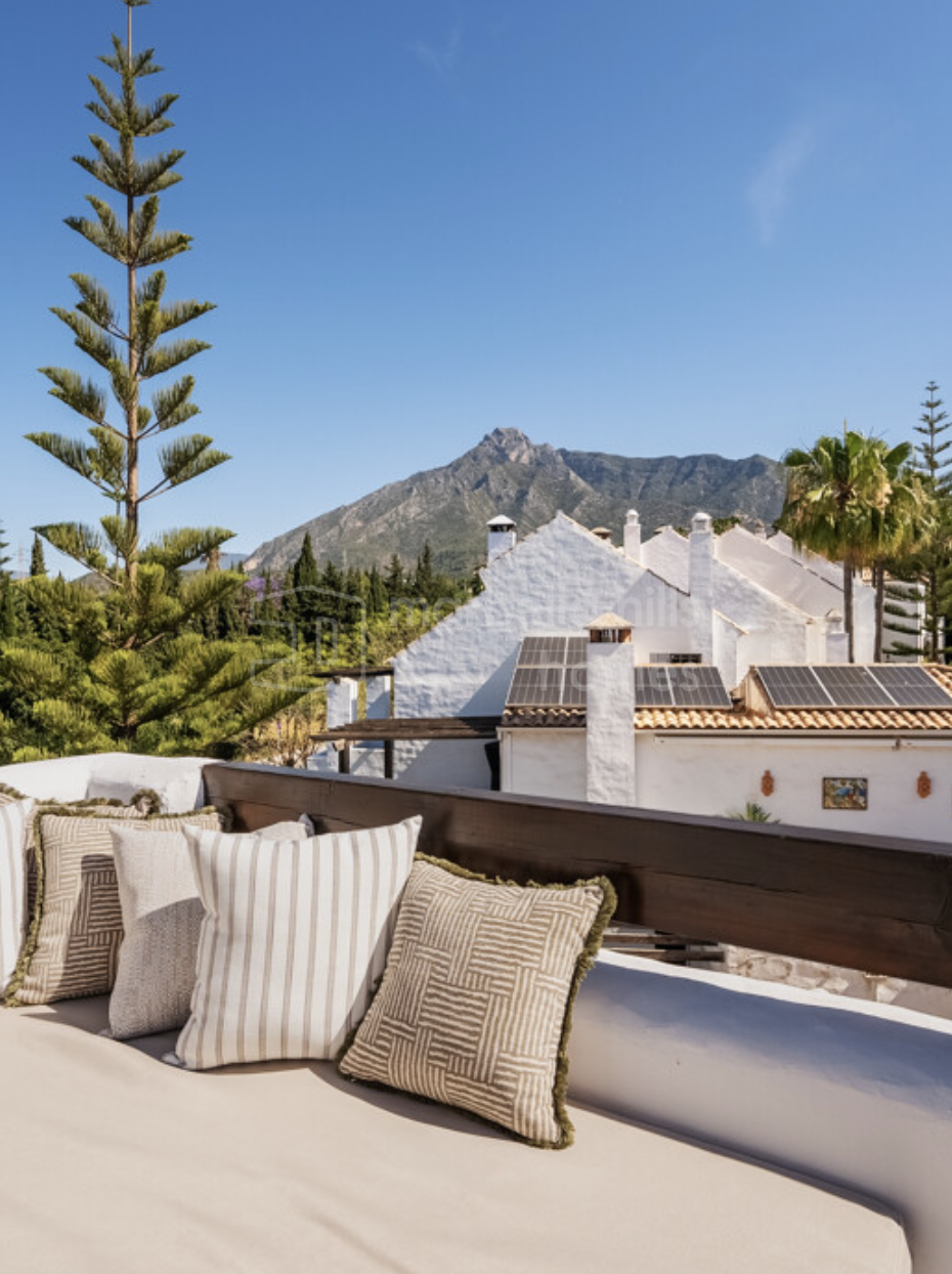 This sophisticated semi-detached villa is located in the gated community of Altos de Salamanca, one of the most prestigious areas on Marbella’s Golden Mile. Just a short walk from the beach and the famous Puente Romano Resort, the property combines privacy, security, and elegant Mediterranean living with panoramic views of La Concha mountain.