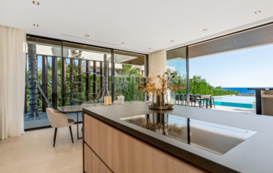 Completed in 2023 with top-quality materials, the property spans 890 m² on a 1,420 m² plot and features bright, open spaces throughout. The main level presents a spacious open-plan living and dining area with large floor-to-ceiling windows that flood the interior with natural light and connect seamlessly to the terrace and infinity pool. The designer kitchen, fitted with premium Gaggenau appliances, includes a dining area and direct access to an outdoor kitchen—ideal for entertaining.