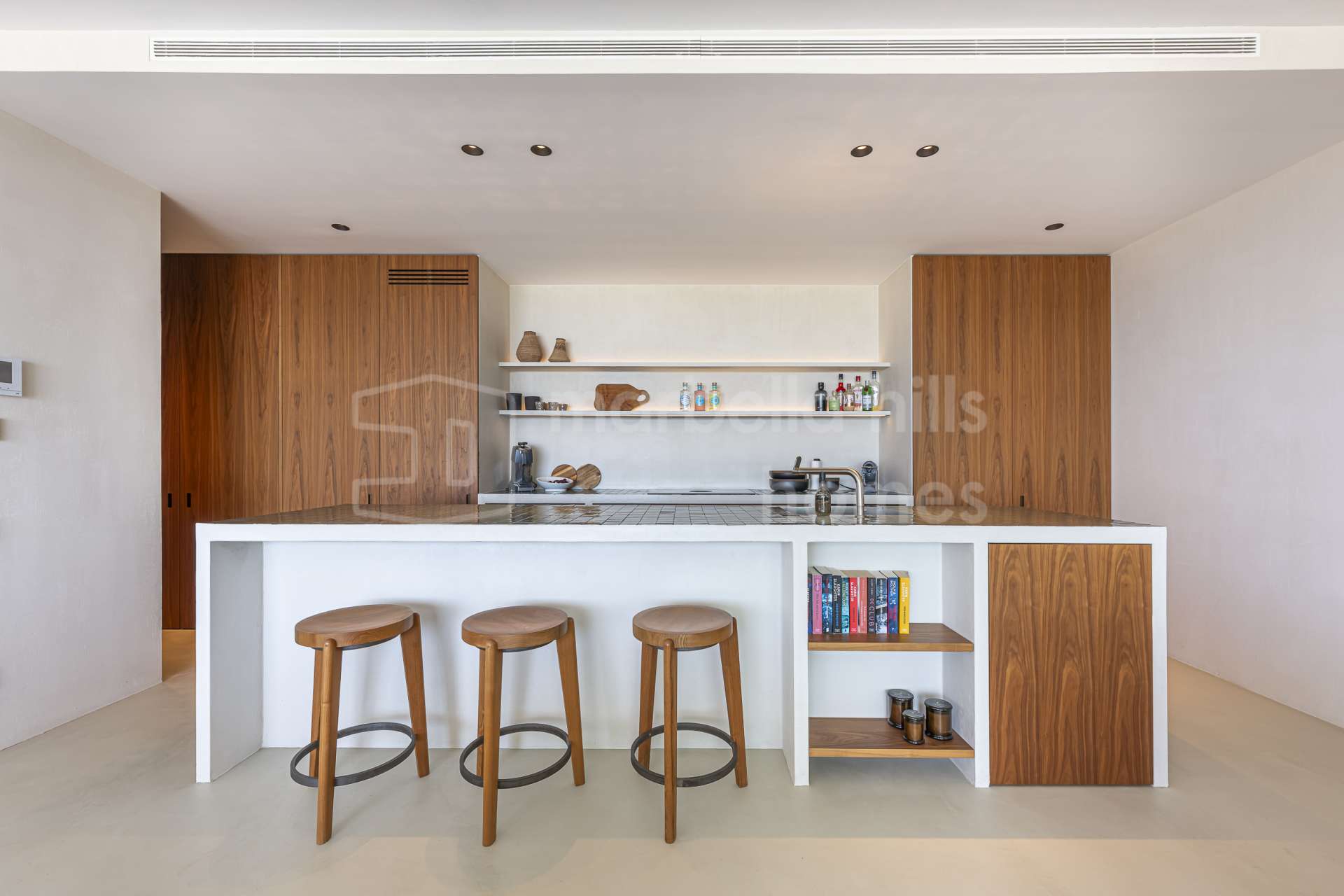 Built in 2021 to the highest quality standards, the property offers 151 m² of built area plus 61 m² of terraces, designed for contemporary open-plan living. The spacious living and dining area features a designer Bulthaup kitchen equipped with premium Miele and Bora Dhu appliances. Floor-to-ceiling windows connect the interiors to the large terrace, where you can enjoy year-round sunshine and spectacular sunsets over the golf valley.