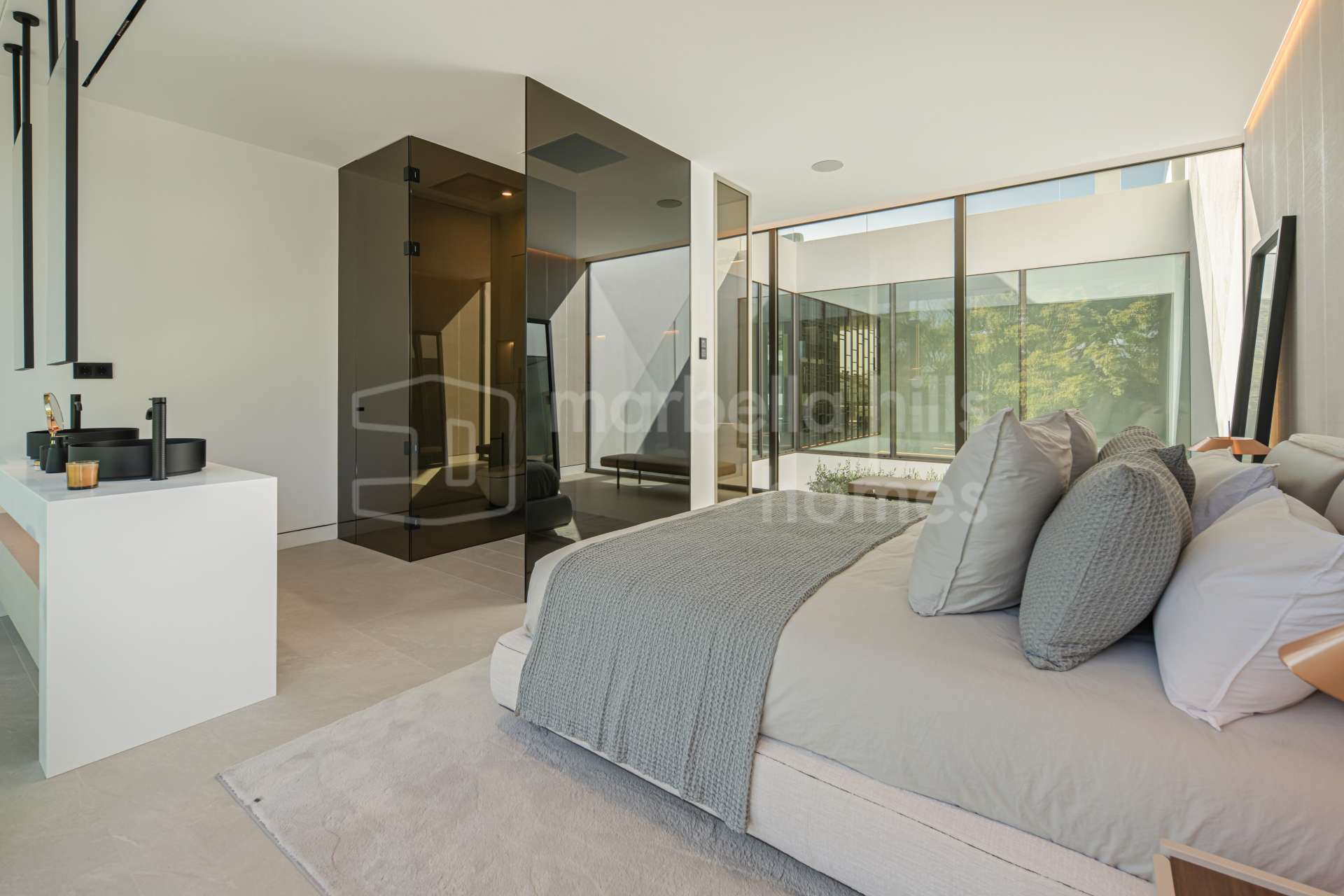 The architecture reflects contemporary Mediterranean design, combining clean lines, open spaces and floor-to-ceiling windows that allow natural light to flow throughout the home. Interior and exterior living areas connect seamlessly, creating an atmosphere of elegance and comfort that defines modern luxury living in Marbella.