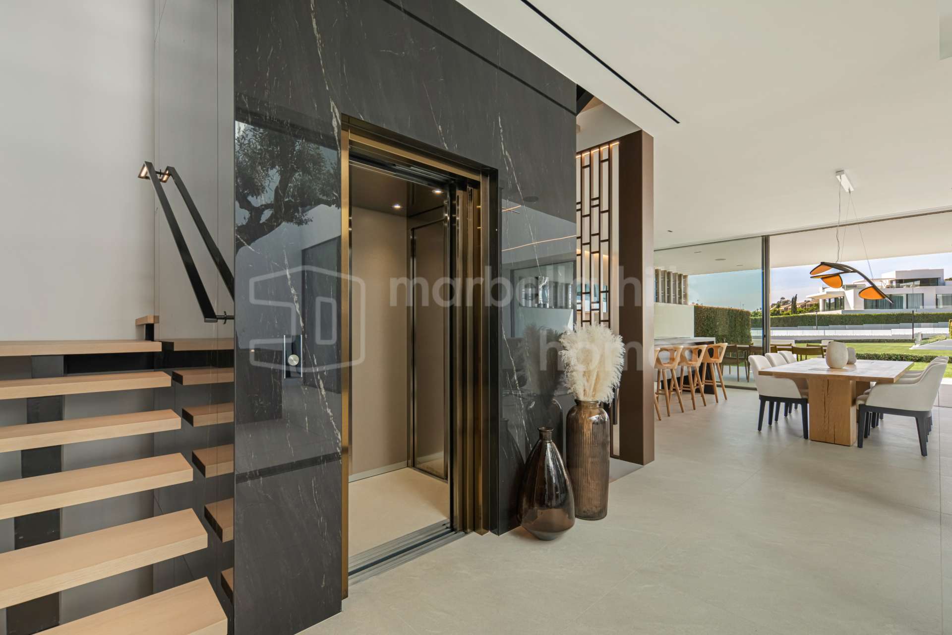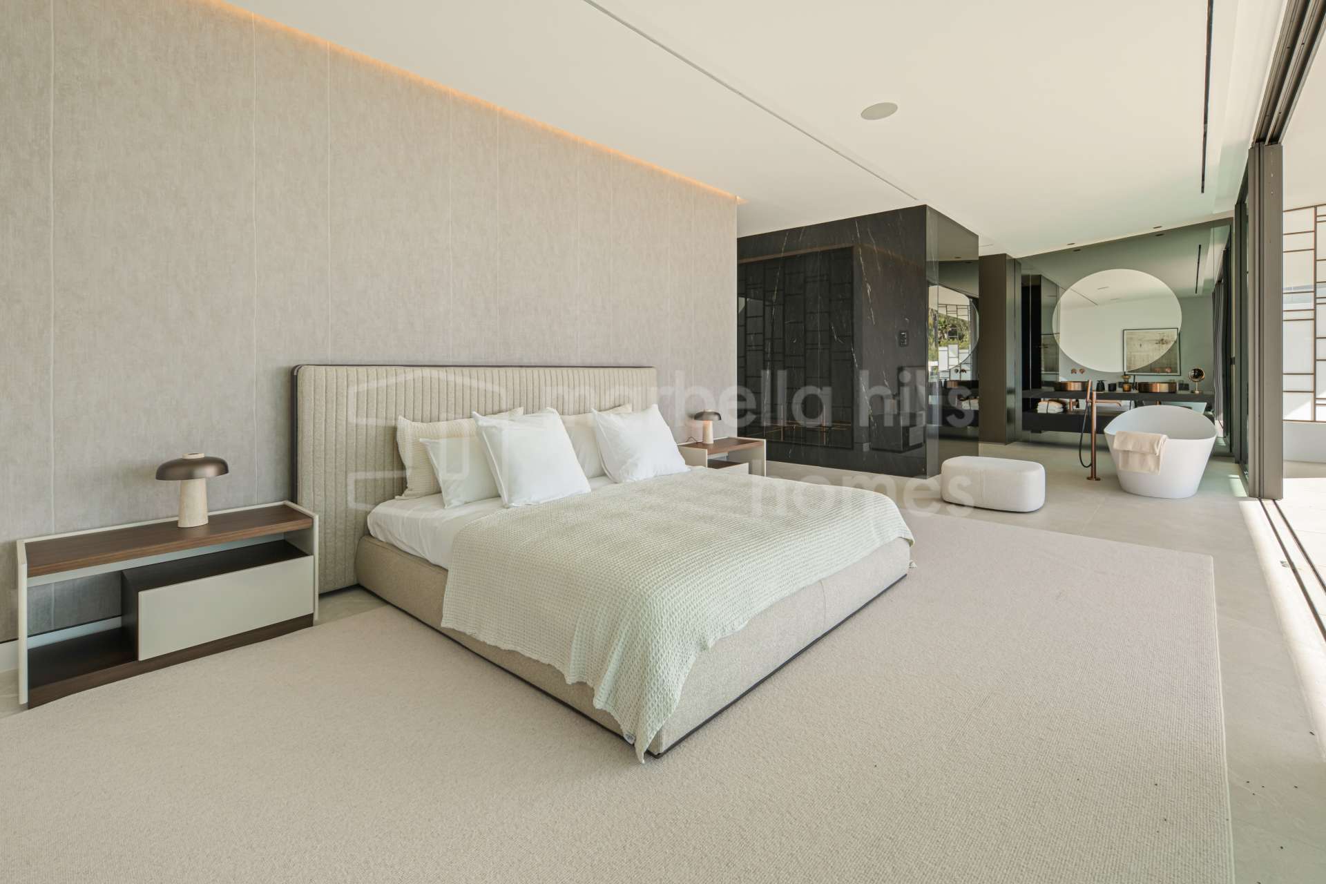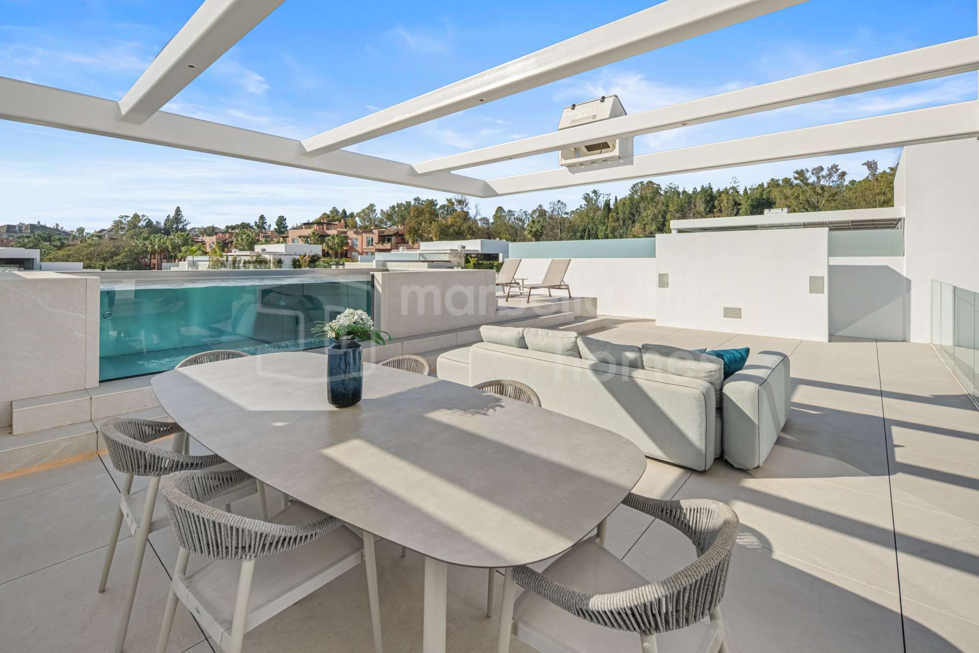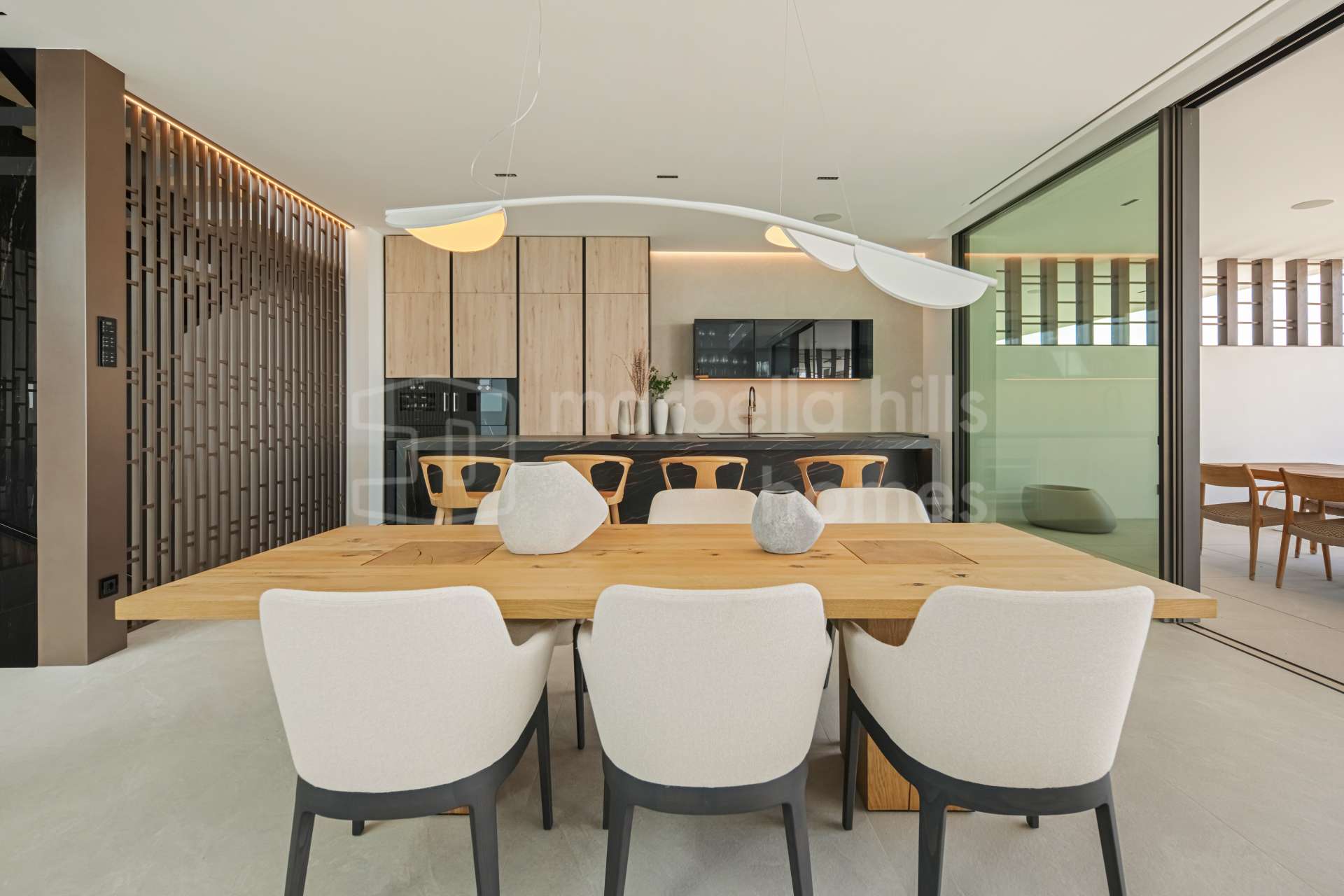 The main living area is designed as an open space integrating the living room, dining area and kitchen, with large sliding glass doors opening onto expansive terraces. These terraces overlook the private swimming pool and landscaped garden, creating the perfect setting for relaxation, entertaining and enjoying Marbella’s mild climate throughout the year.