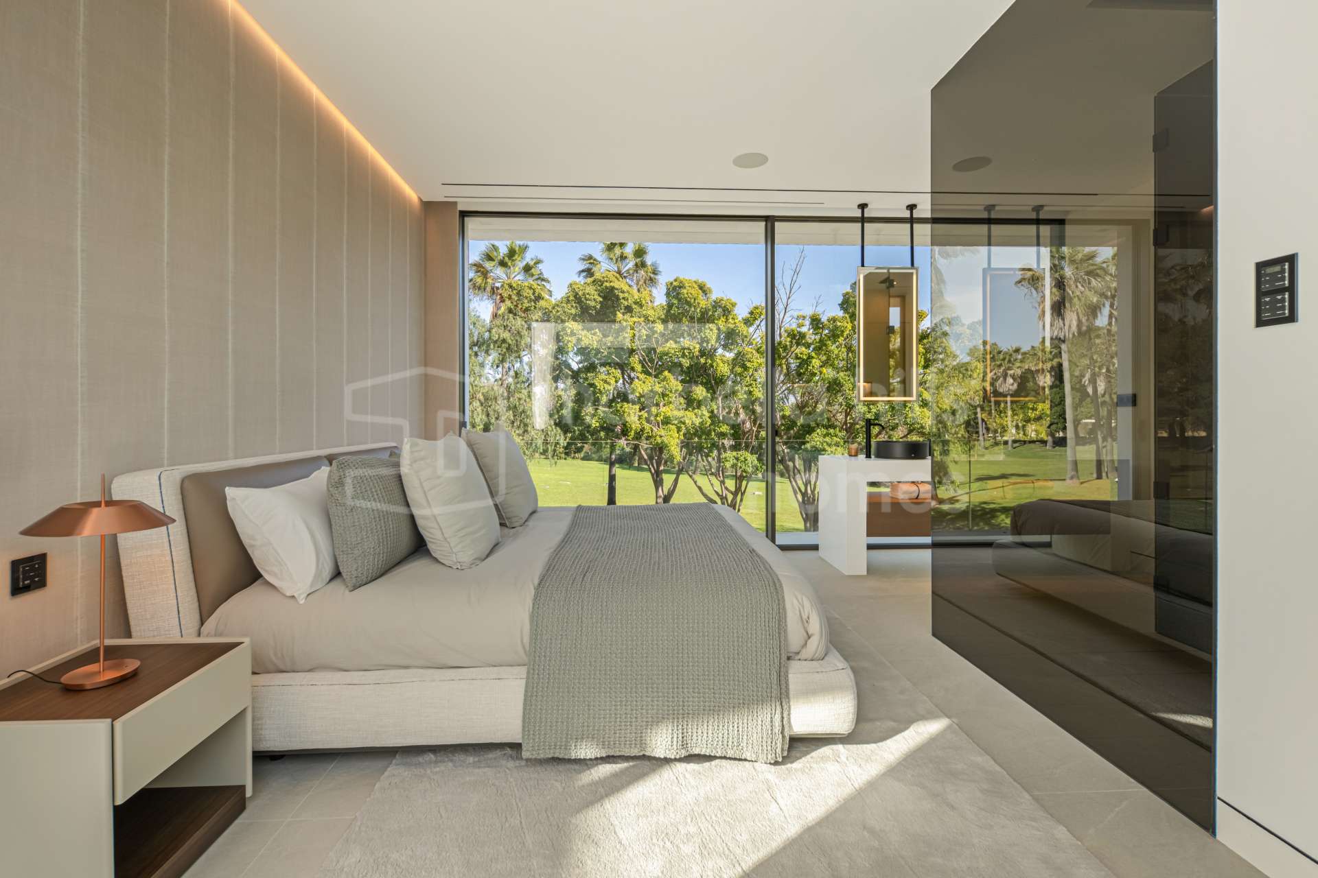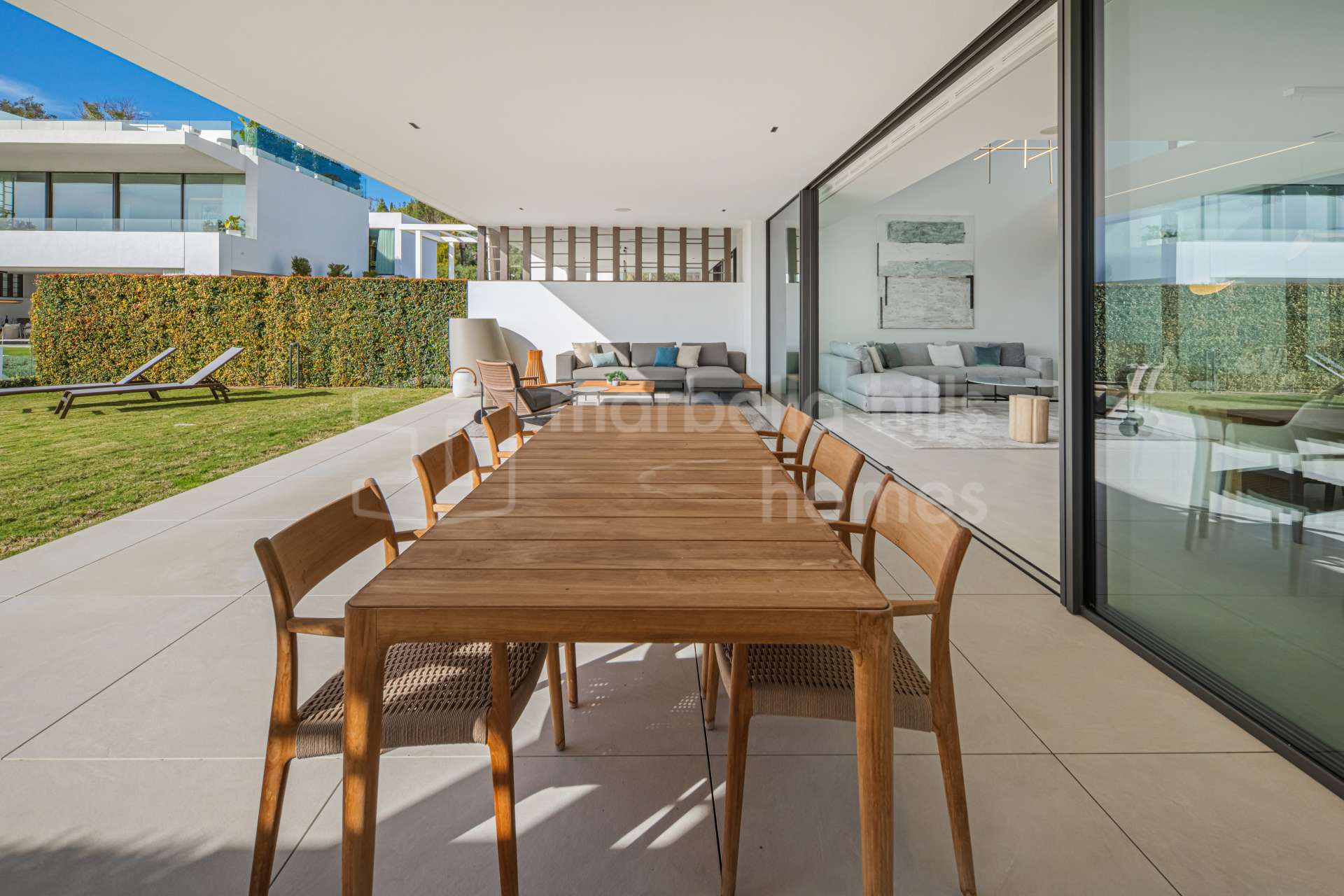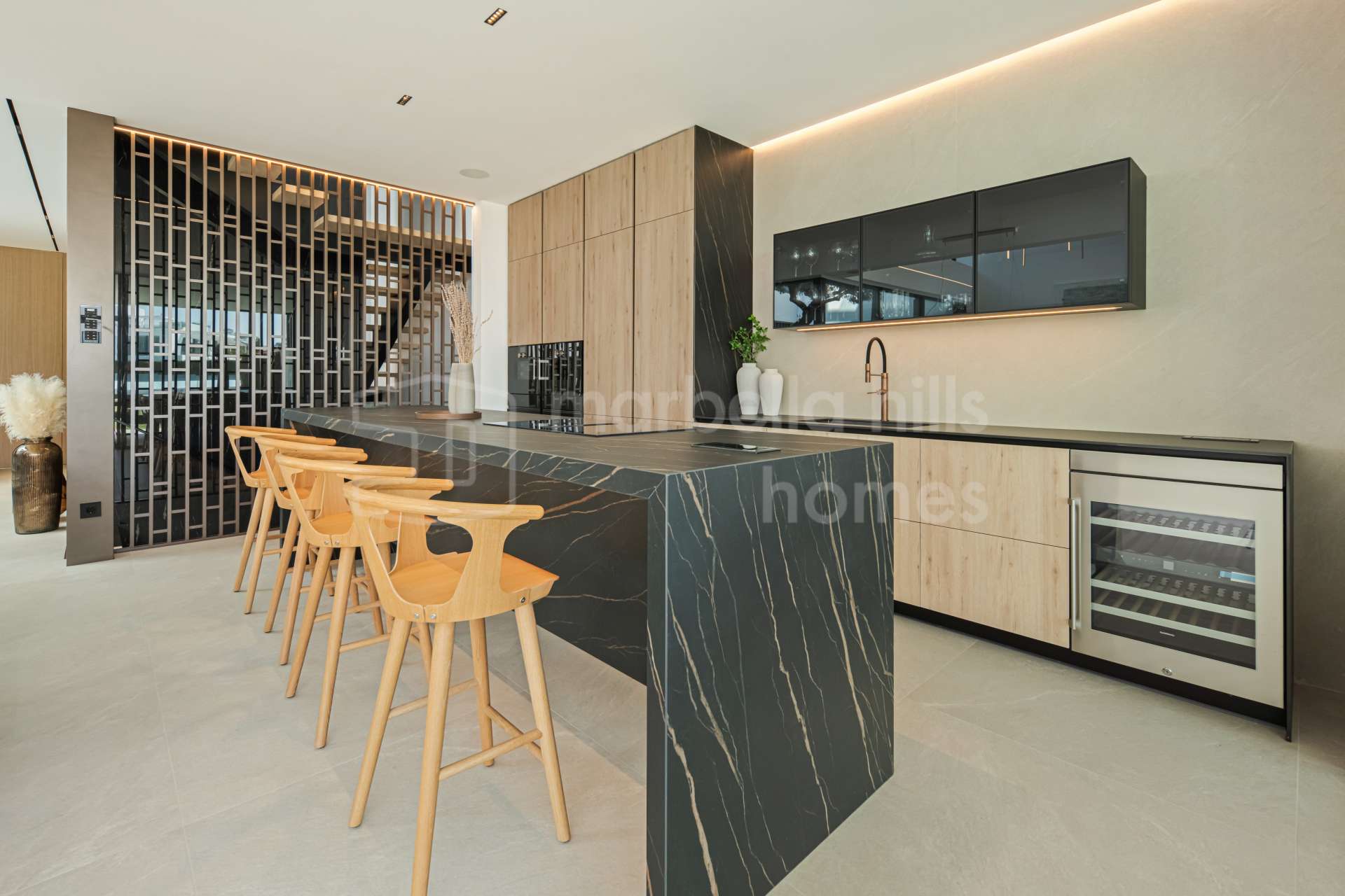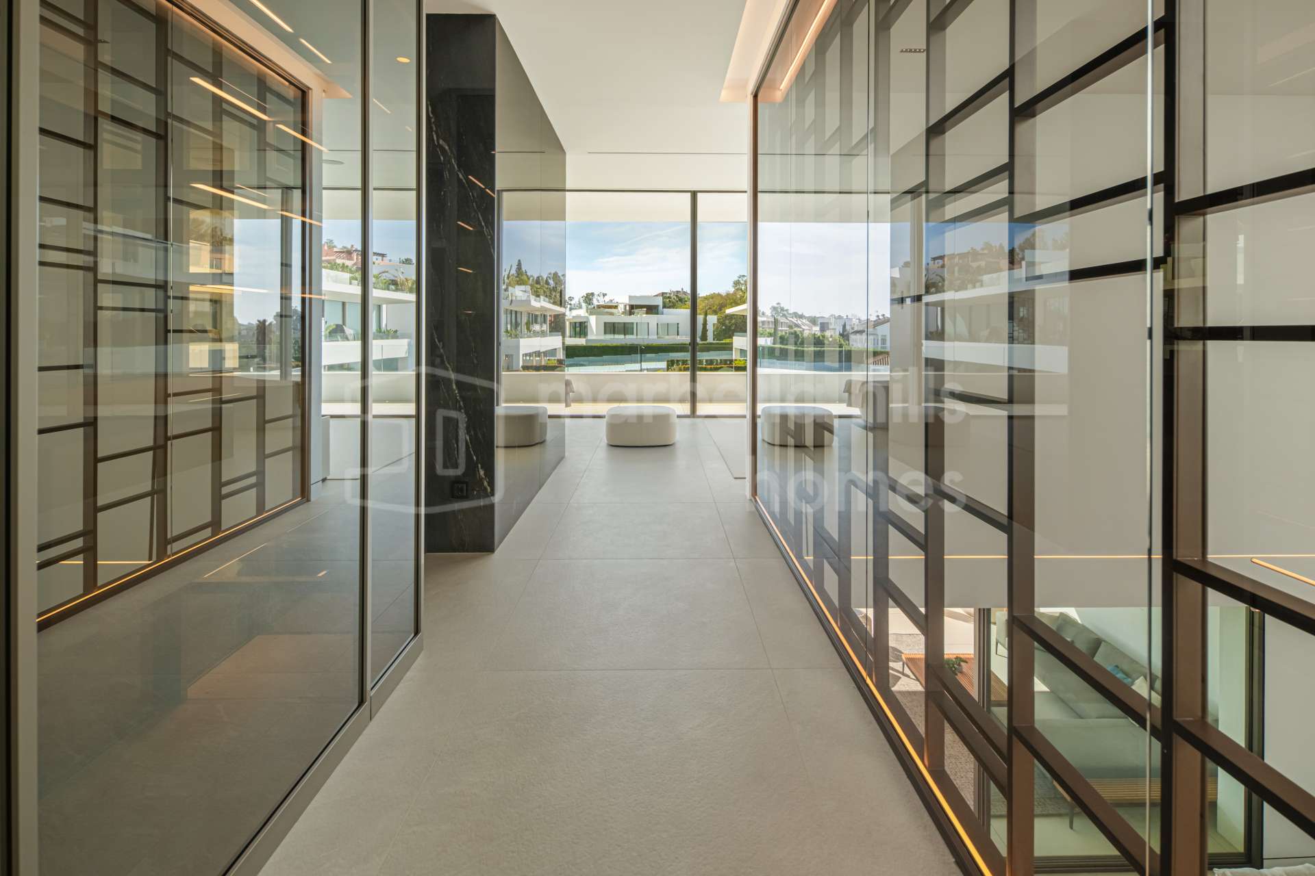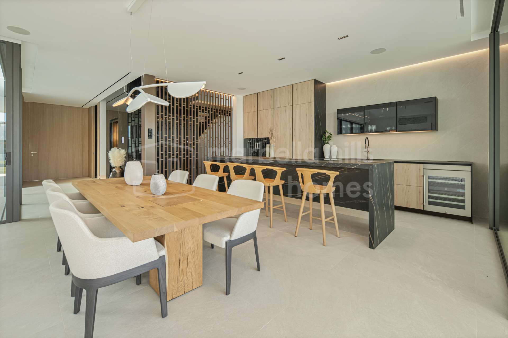 The main living area is designed as an open space integrating the living room, dining area and kitchen, with large sliding glass doors opening onto expansive terraces. These terraces overlook the private swimming pool and landscaped garden, creating the perfect setting for relaxation, entertaining and enjoying Marbella’s mild climate throughout the year.
