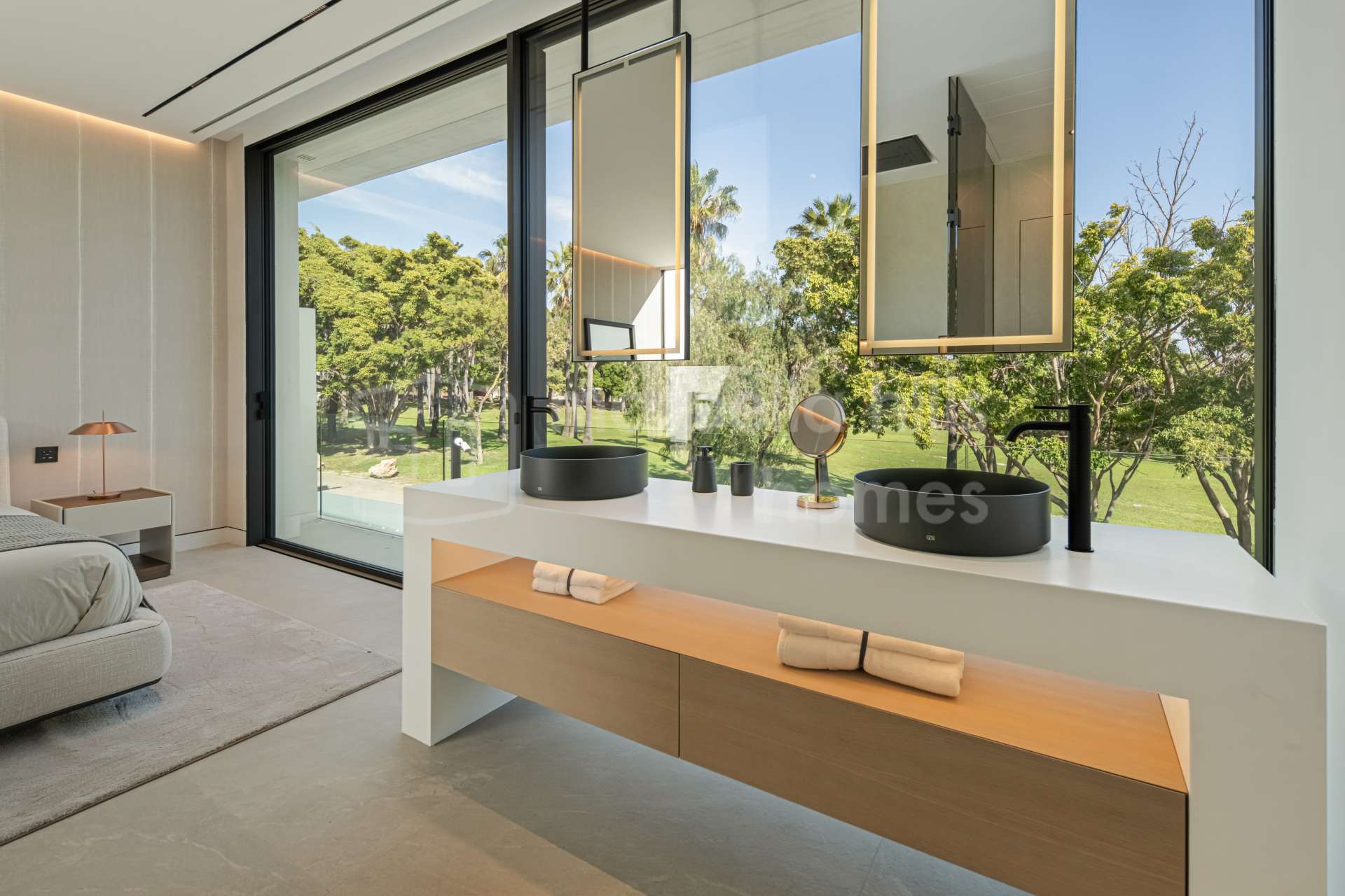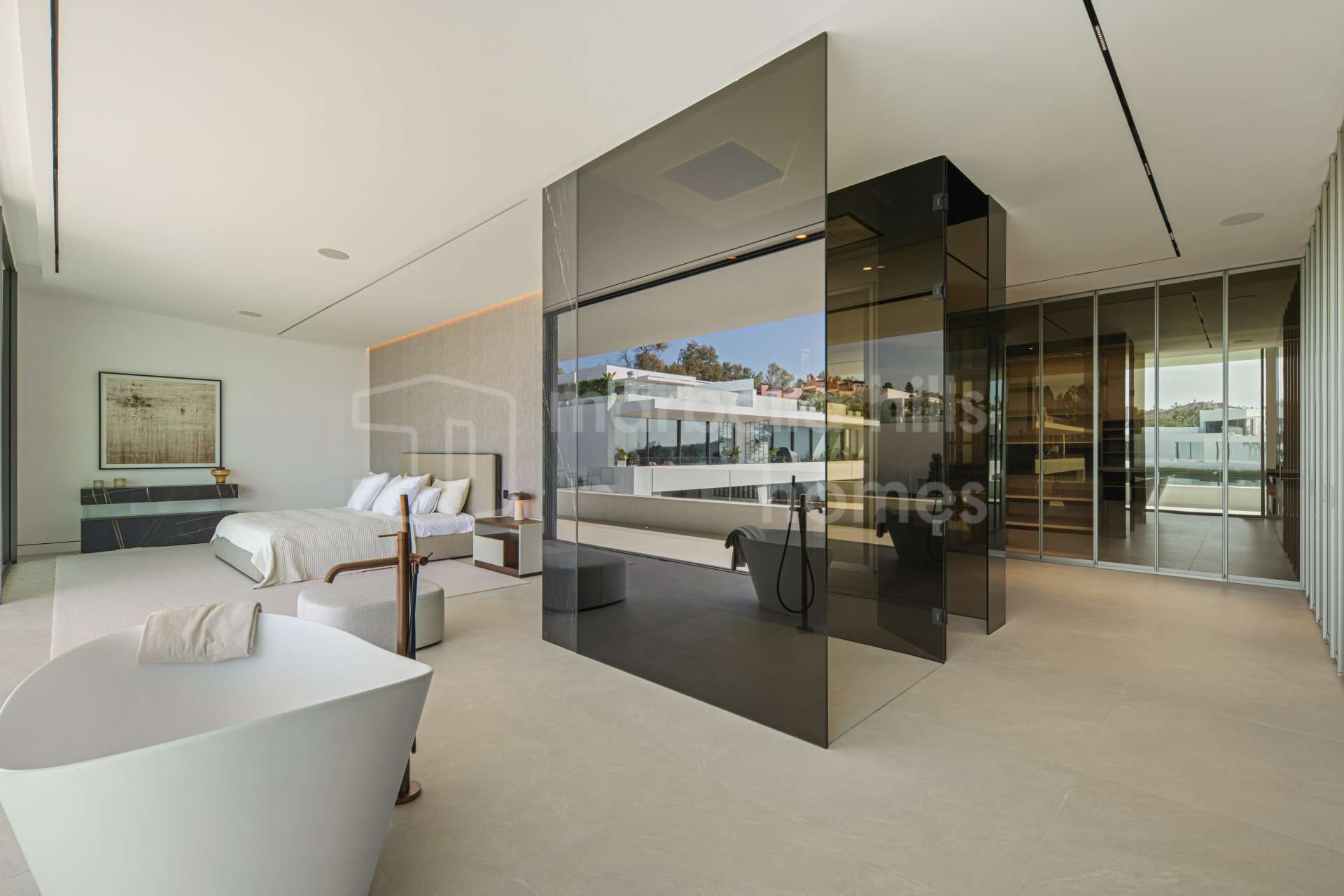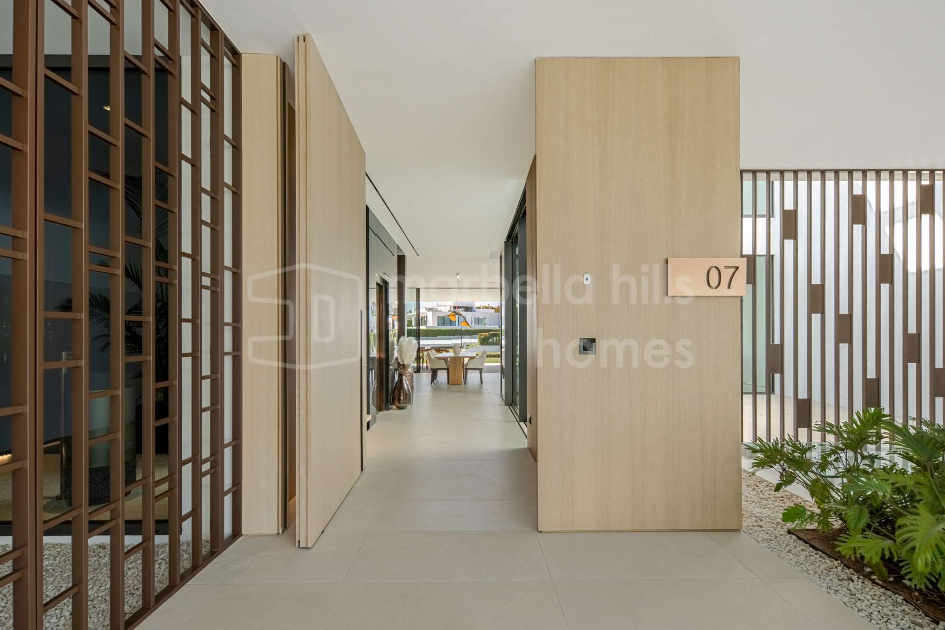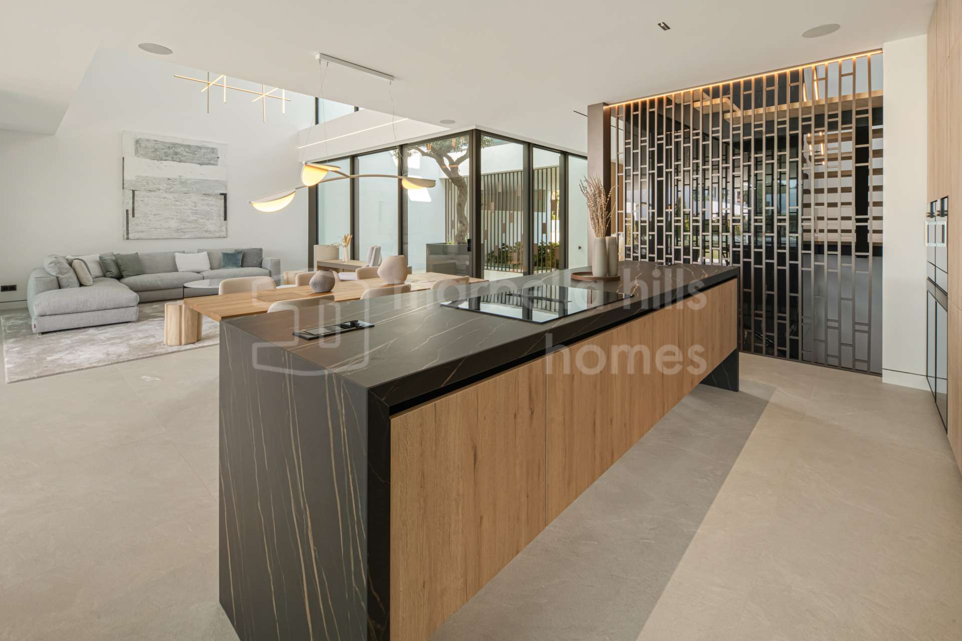 The main living area is designed as an open space integrating the living room, dining area and kitchen, with large sliding glass doors opening onto expansive terraces. These terraces overlook the private swimming pool and landscaped garden, creating the perfect setting for relaxation, entertaining and enjoying Marbella’s mild climate throughout the year.
