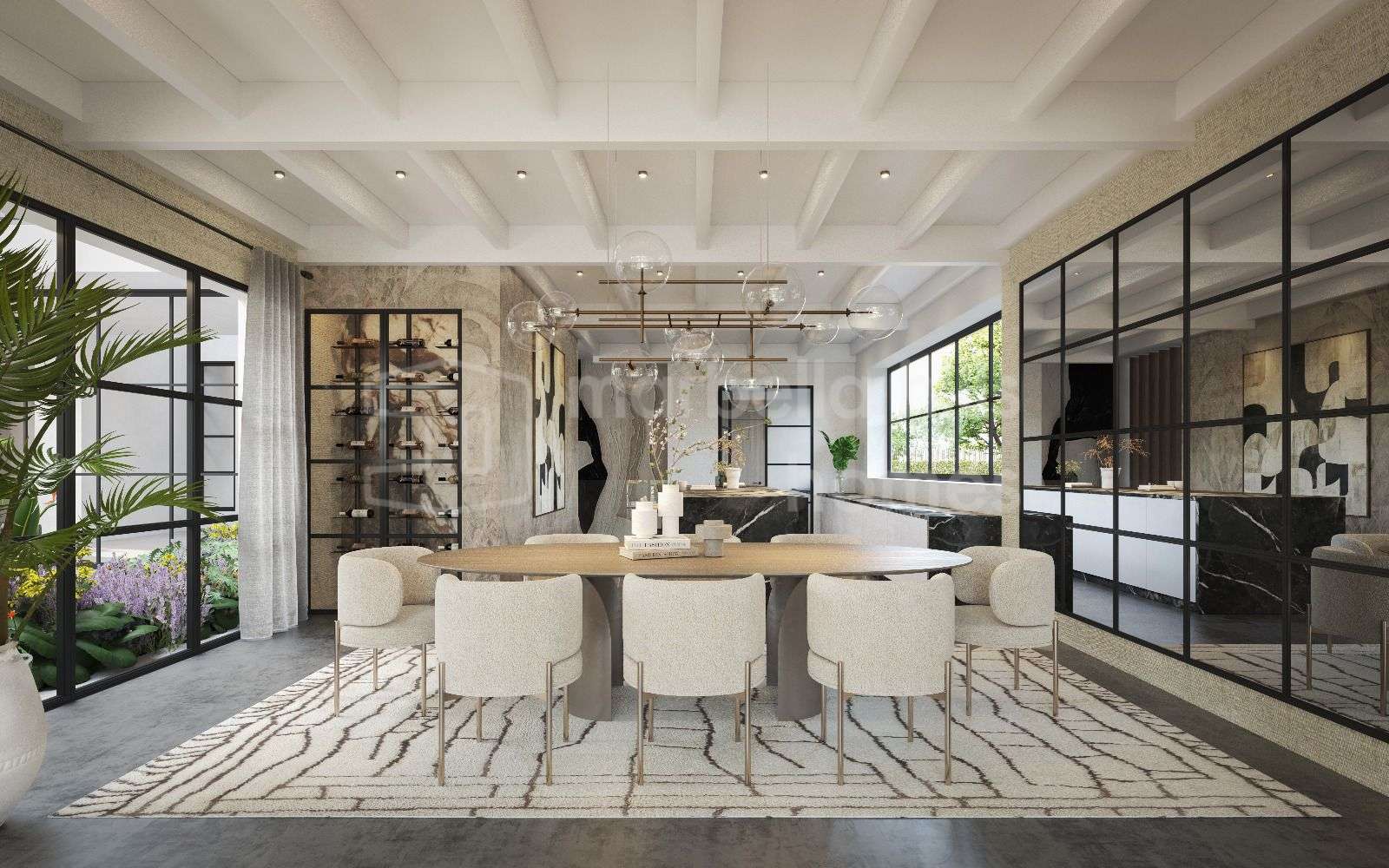 Inside, volume defines the experience. A double-height central living space framed by full-scale glazing allows natural light from both sides, creating a bright and open environment without relying on decorative elements. The kitchen, dining, and lounge areas are arranged in an open yet controlled layout, centred around a statement island that anchors the space while maintaining visual balance.