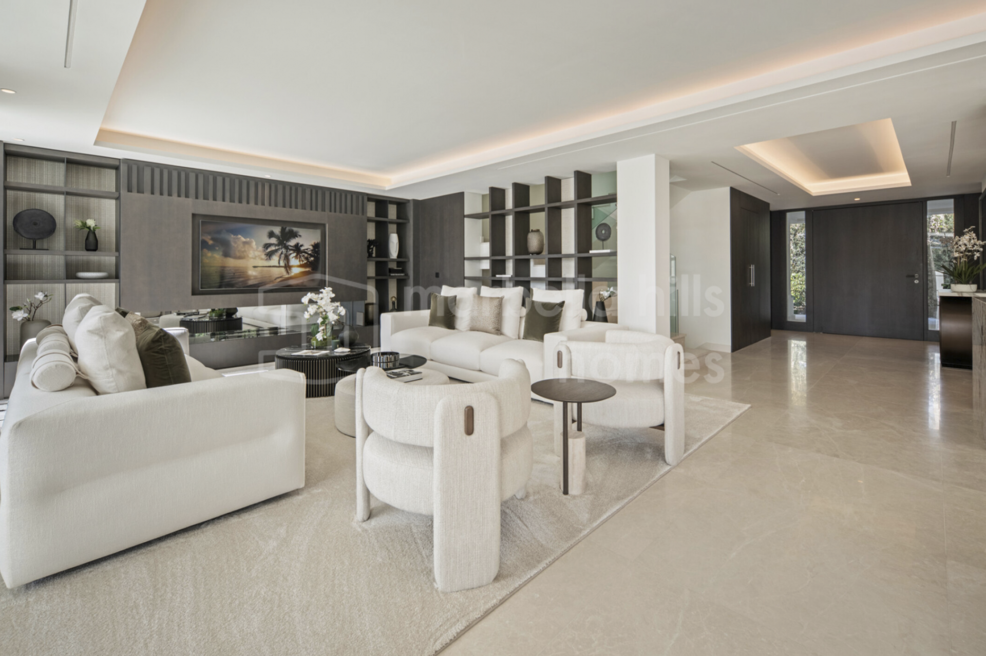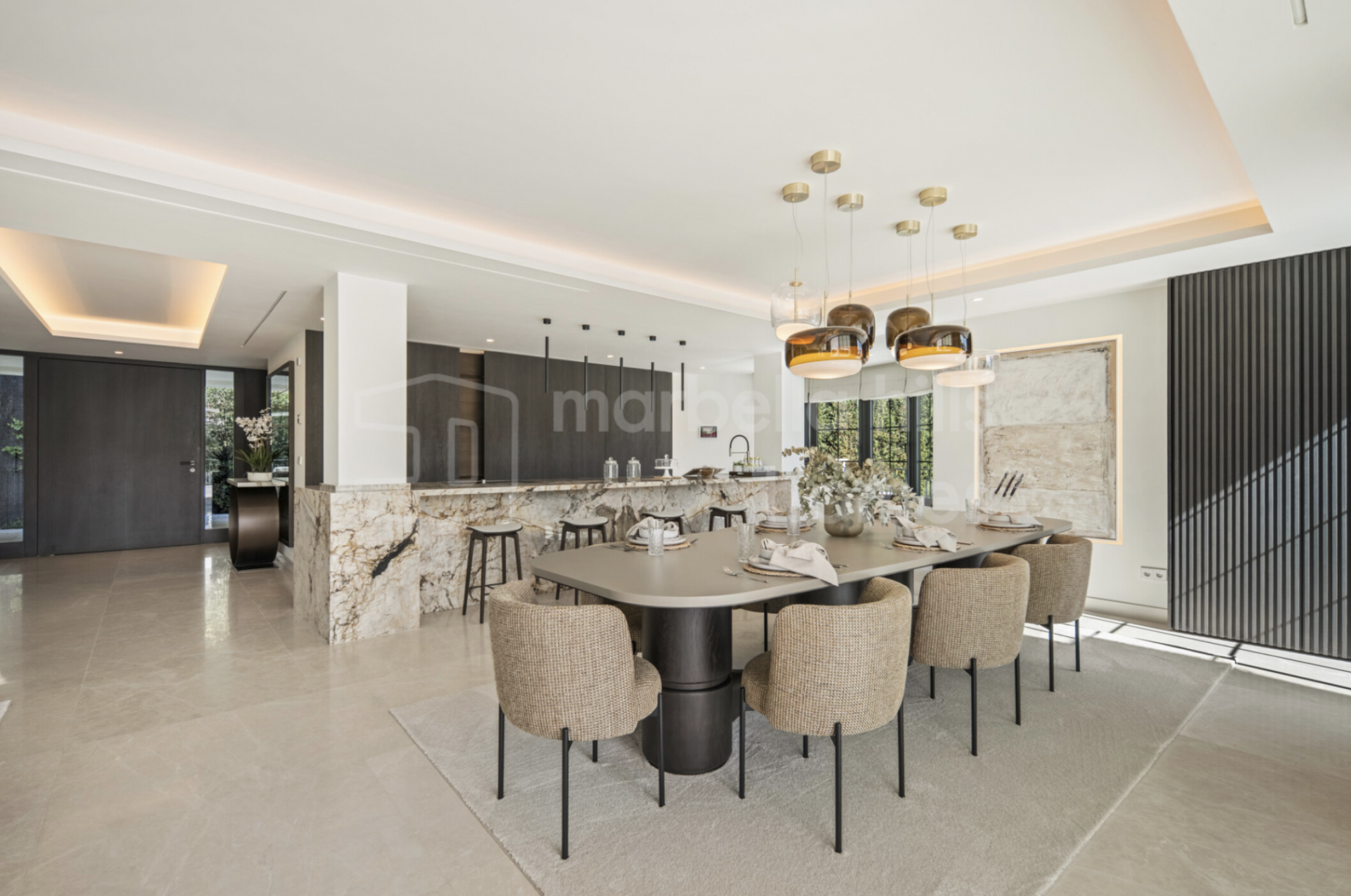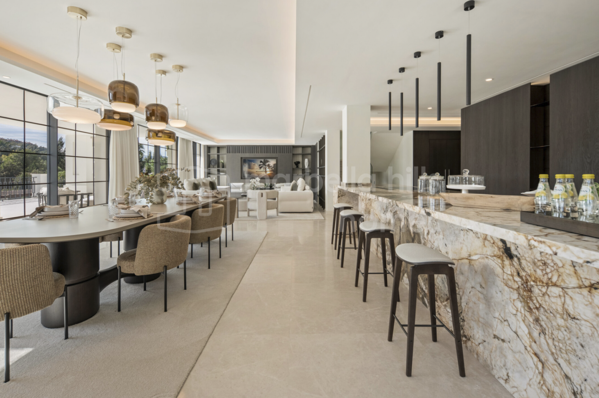 The main living area is open-plan, but not undefined. Clean architectural lines lead naturally toward a statement marble kitchen—central, functional, and properly integrated into the space. Floor-to-ceiling glass opens onto the landscaped gardens, creating a seamless transition between interior and exterior living, essential for modern villas in Marbella.