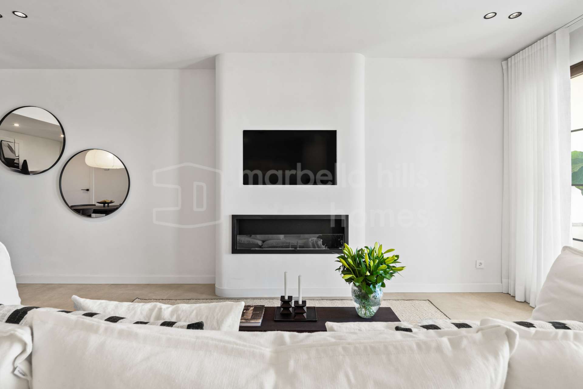 The property has been carefully redesigned to maximise natural light and space, creating a bright open-plan living area with a seamless connection between the lounge, kitchen, and terrace. The living room features a contemporary fireplace and a clean architectural finish, ideal for both relaxing and entertaining.