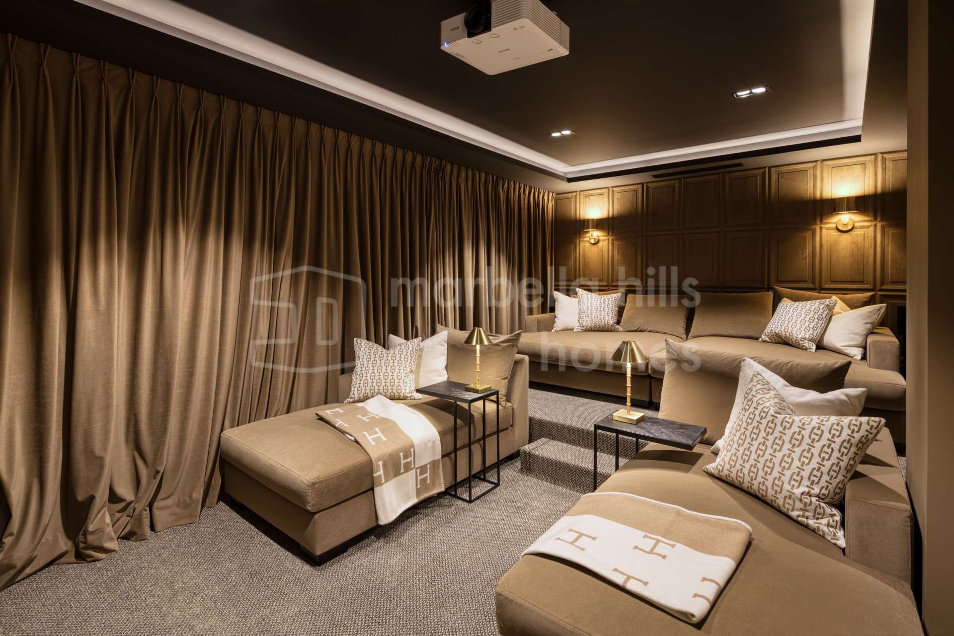 En el nivel inferior, los residentes pueden disfrutar de comodidades tipo resort, como un spa privado con piscina climatizada interior, sauna y baño turco. También cuenta con una sala de cine y un espacio de entretenimiento. La propiedad incluye un garaje privado con capacidad para tres vehículos y acceso cerrado y seguro.