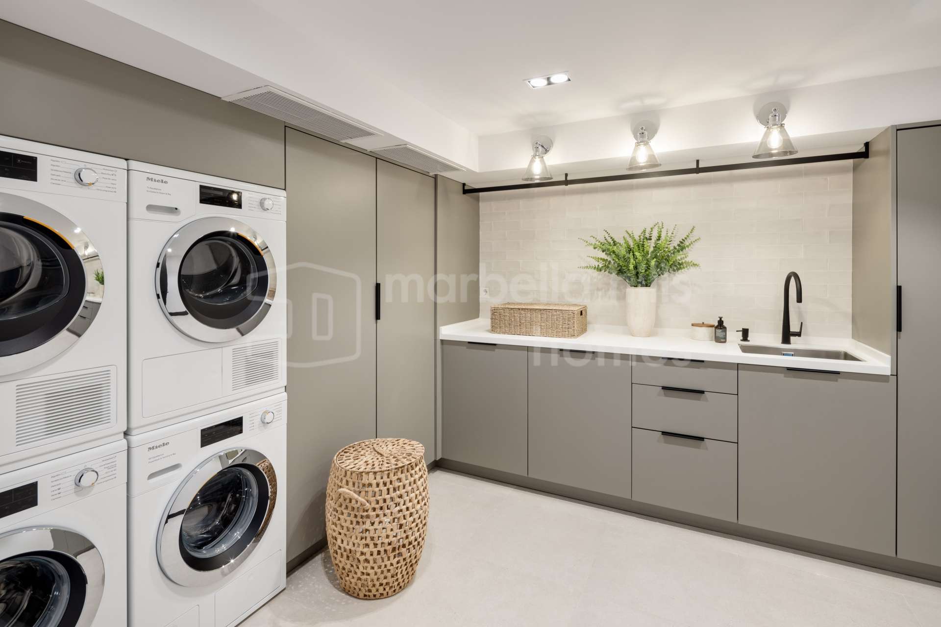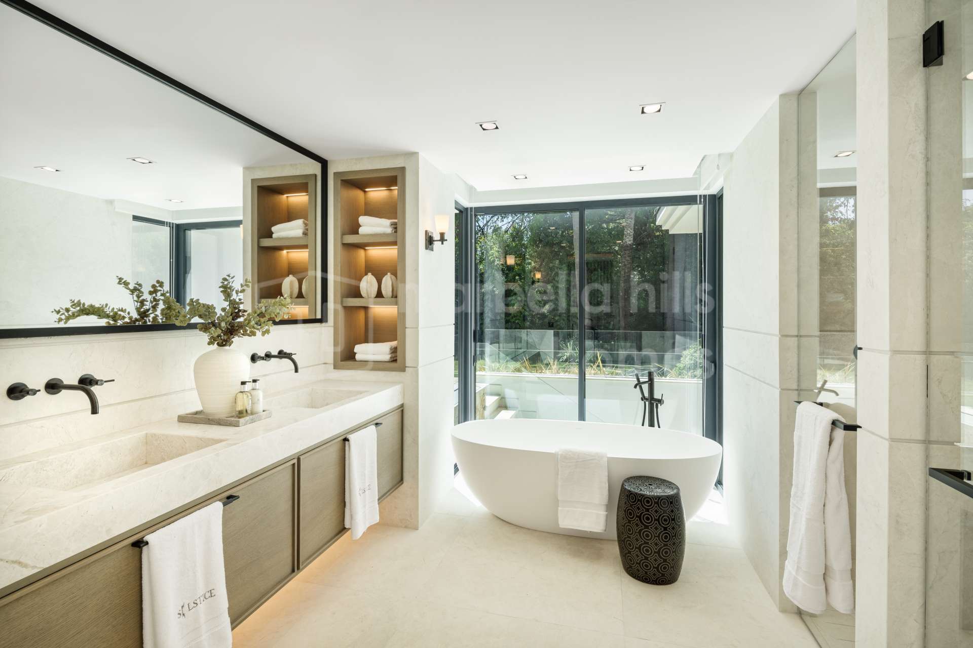 Esta villa contemporánea en Marbella se asienta sobre una parcela cuidadosamente ajardinada, con piscina privada, zona chill-out hundida y una pérgola totalmente equipada con bar exterior y comedor al aire libre, ideal para disfrutar durante todo el año del clima mediterráneo.