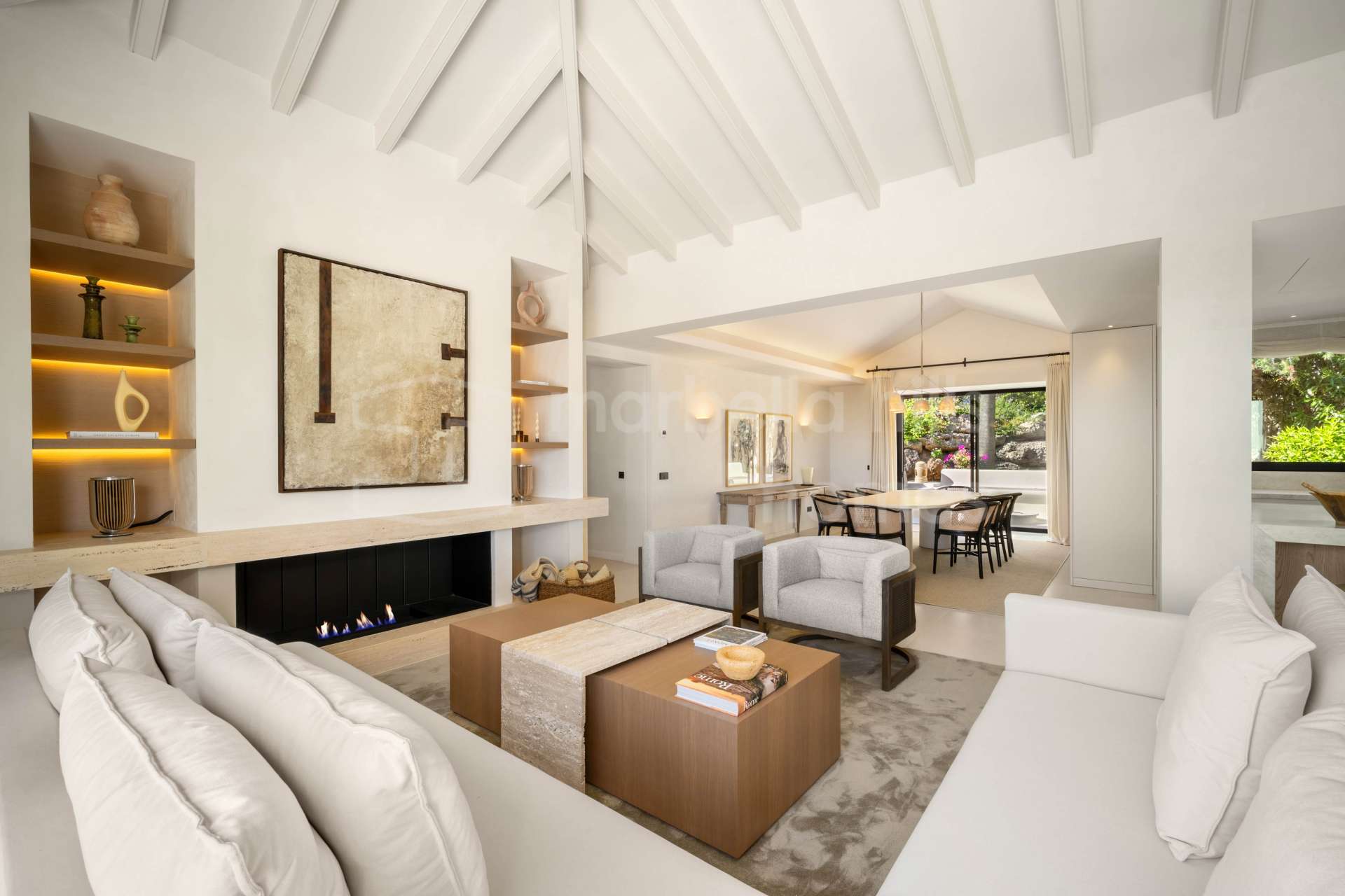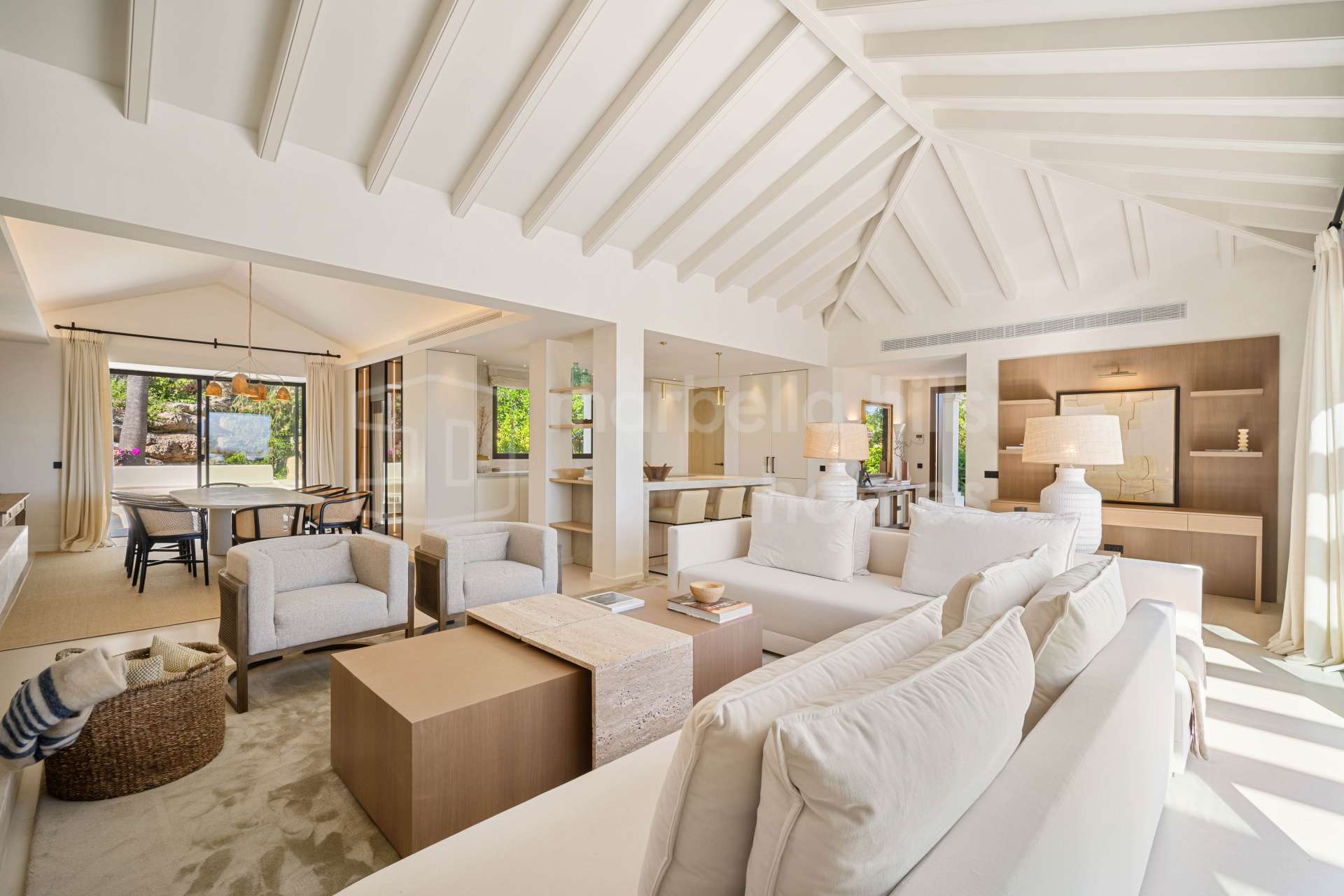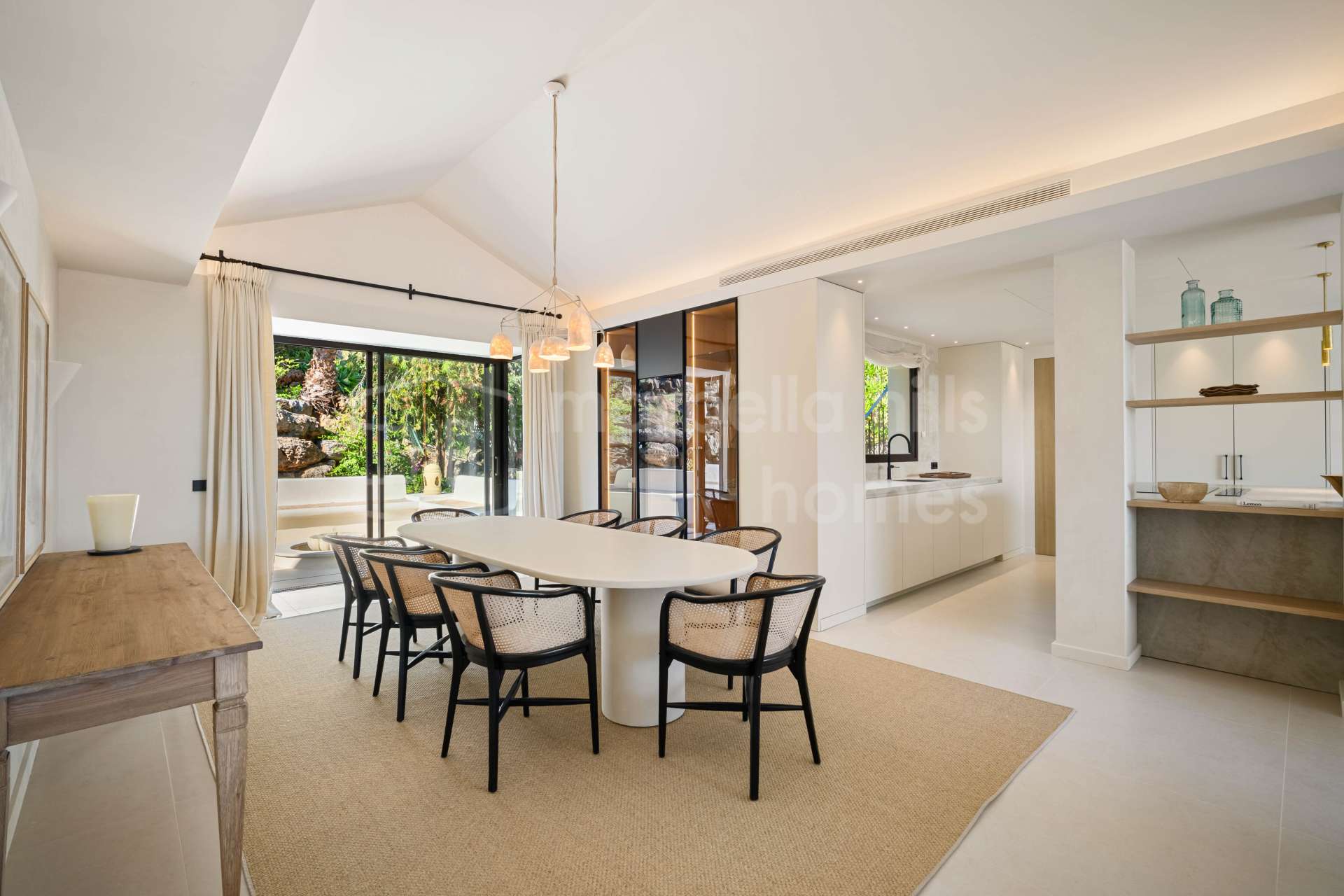 Ubicada en una de las zonas más exclusivas de Marbella, esta villa de una sola planta en Nueva Andalucía ha sido completamente rediseñada para ofrecer una fusión perfecta entre el encanto mediterráneo y la sofisticación contemporánea. A pocos minutos del prestigioso campo de golf Los Naranjos, esta propiedad combina privacidad, confort de alta gama y vistas abiertas al valle y al mar.