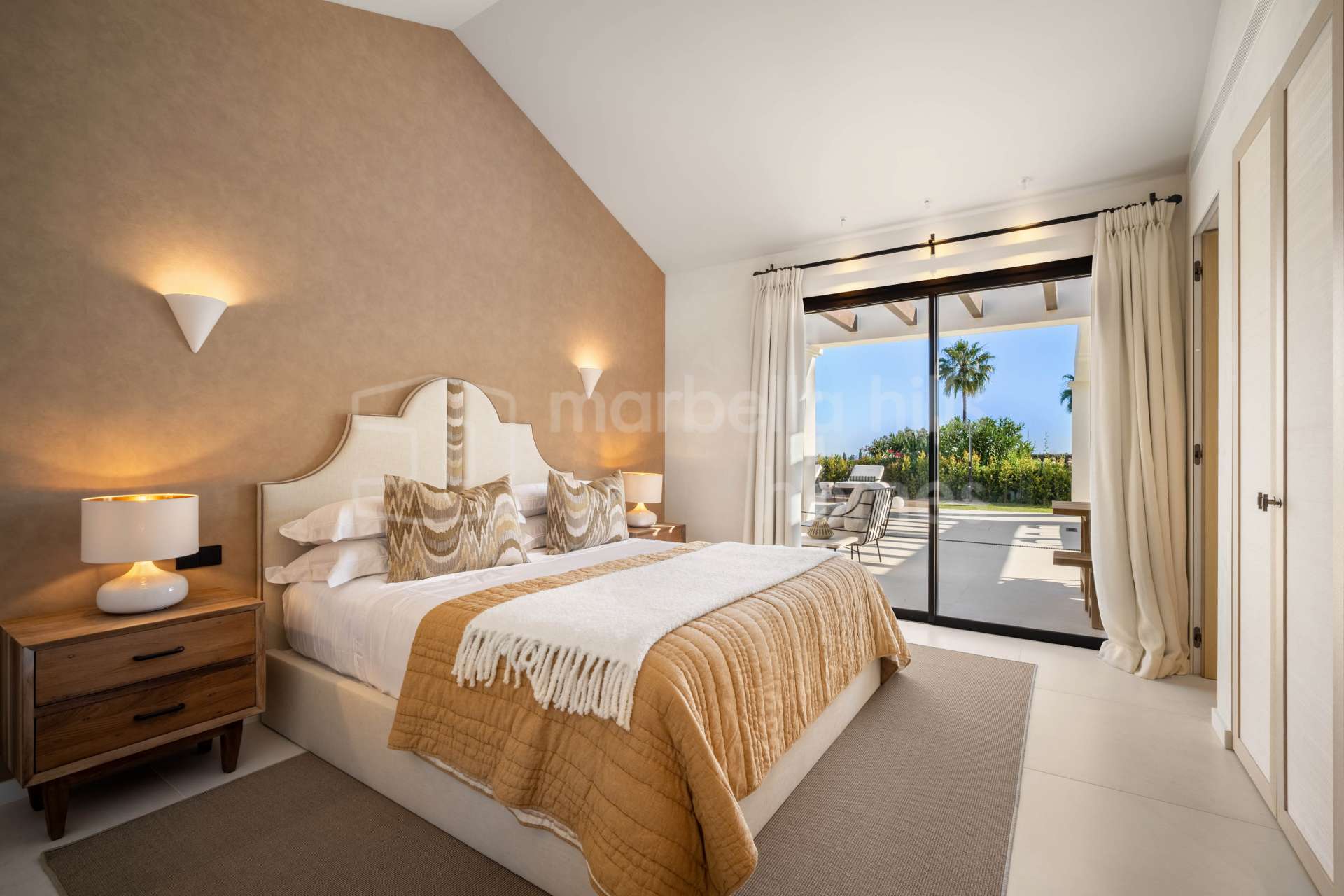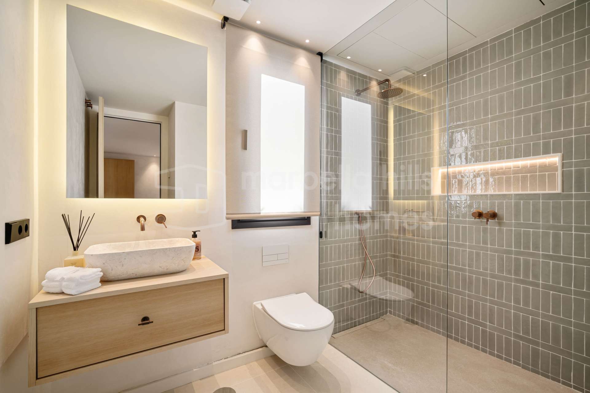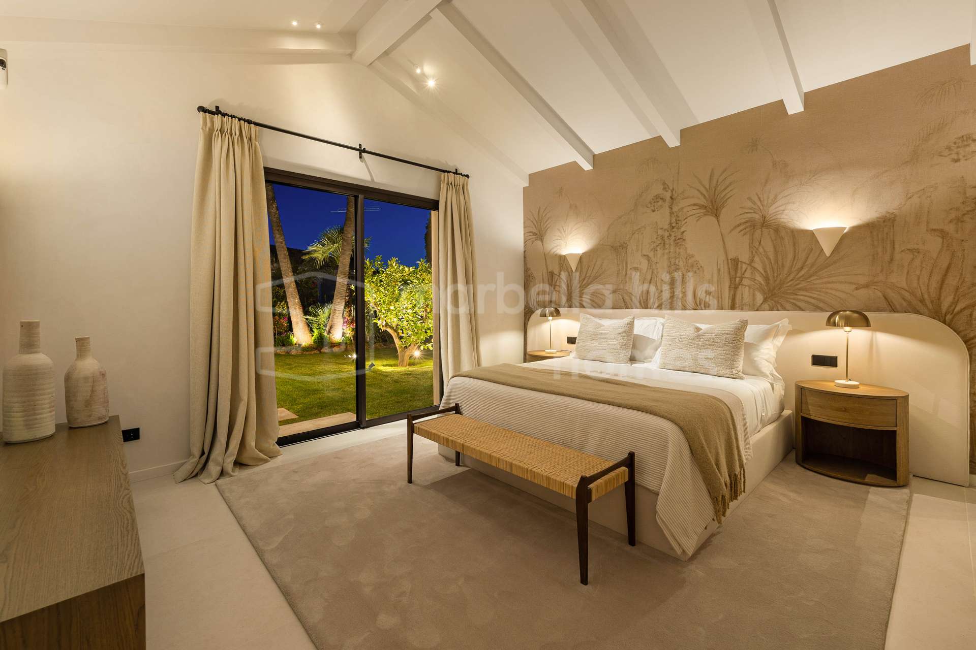 La propiedad dispone de cuatro amplios dormitorios y cuatro elegantes baños, incluyendo una suite principal con acceso directo al jardín. En toda la vivienda se han utilizado acabados premium, iluminación ambiental y mobiliario a medida, aportando una estética sofisticada y armónica.