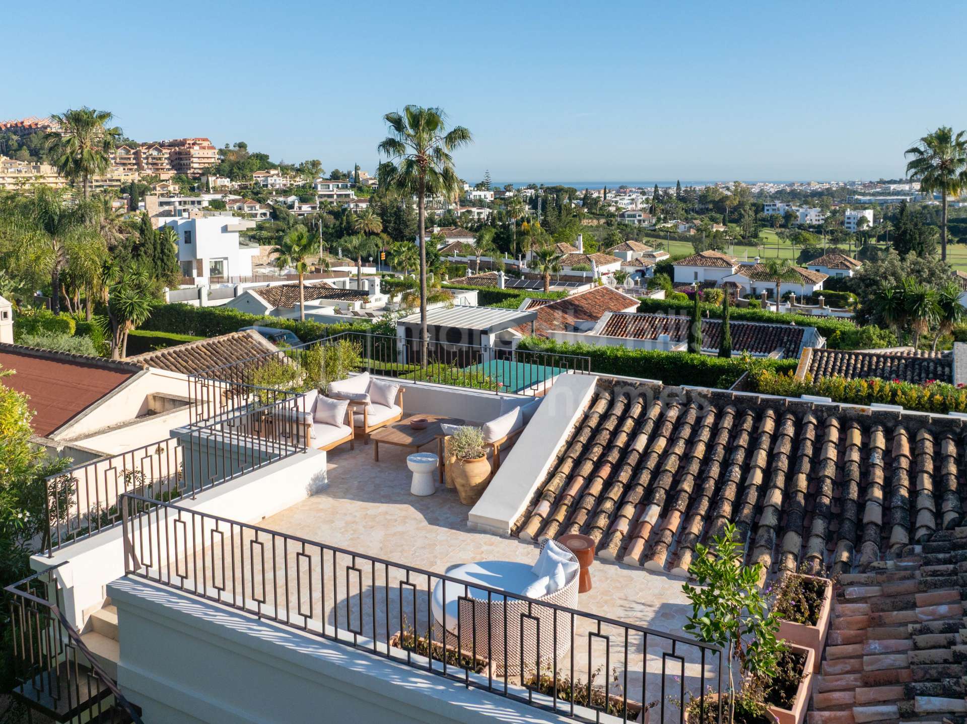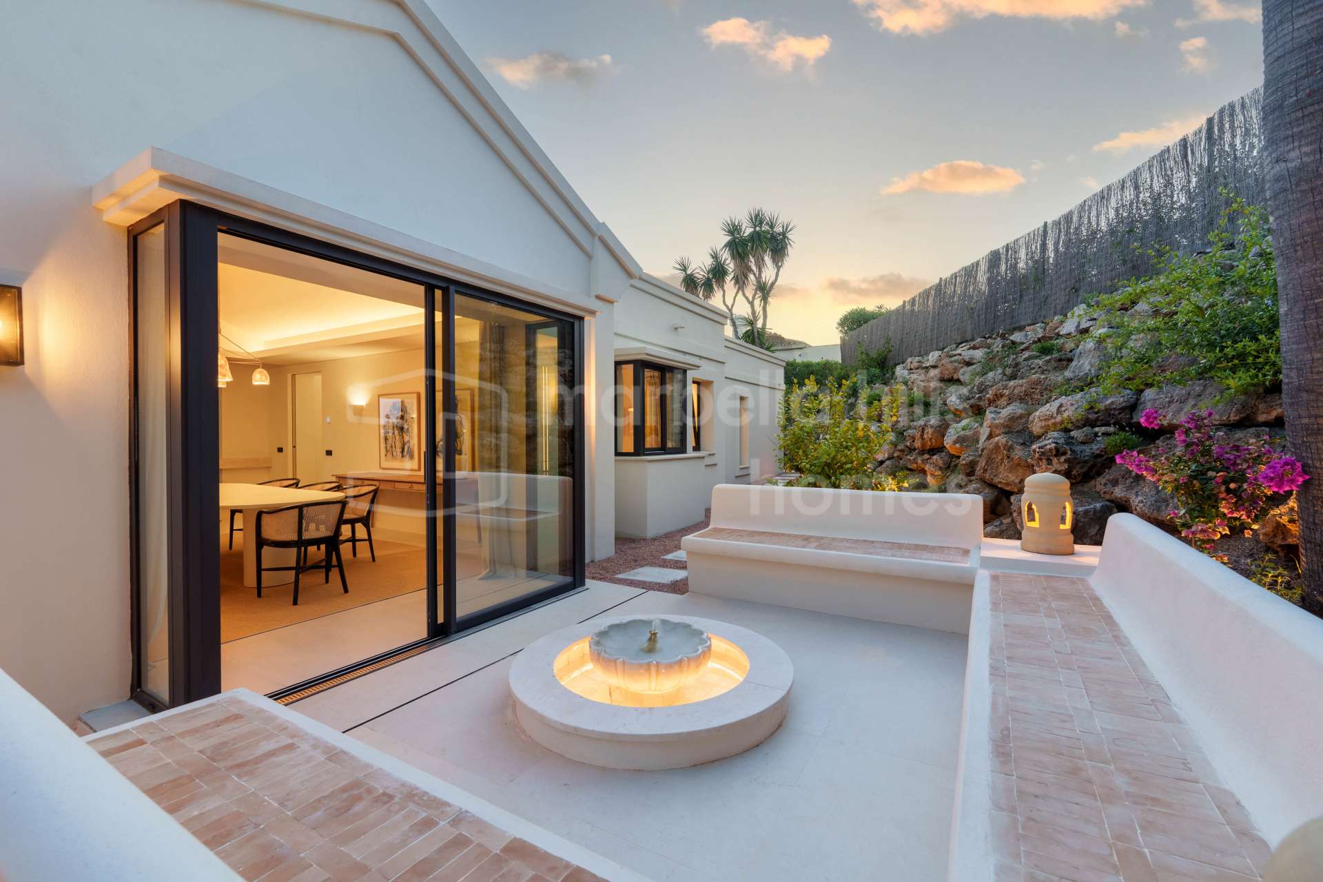 El exterior es un auténtico refugio. Jardines cuidados rodean diversas zonas de estar y comedor al aire libre, ideales para relajarse o recibir invitados con total privacidad. Un patio interior con fuente aporta un aire sereno y exclusivo, mientras que la azotea ofrece impresionantes vistas abiertas al campo de golf y al mar Mediterráneo.