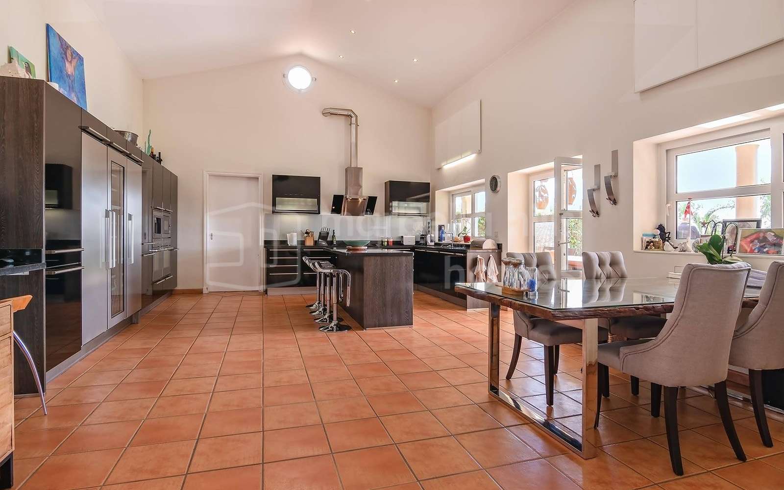 Cocina familiar moderna con acceso directo a una gran terraza con zona de barbacoa