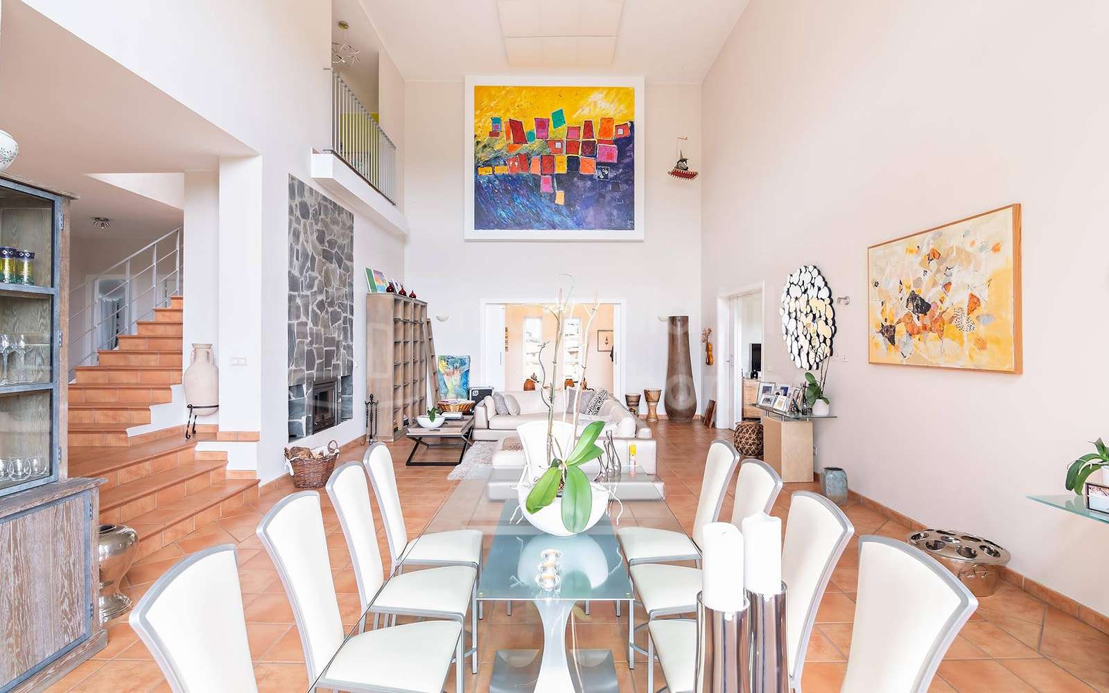 Amplio salón con techos altos y chimenea con sistema de convección de aire y control por termostato