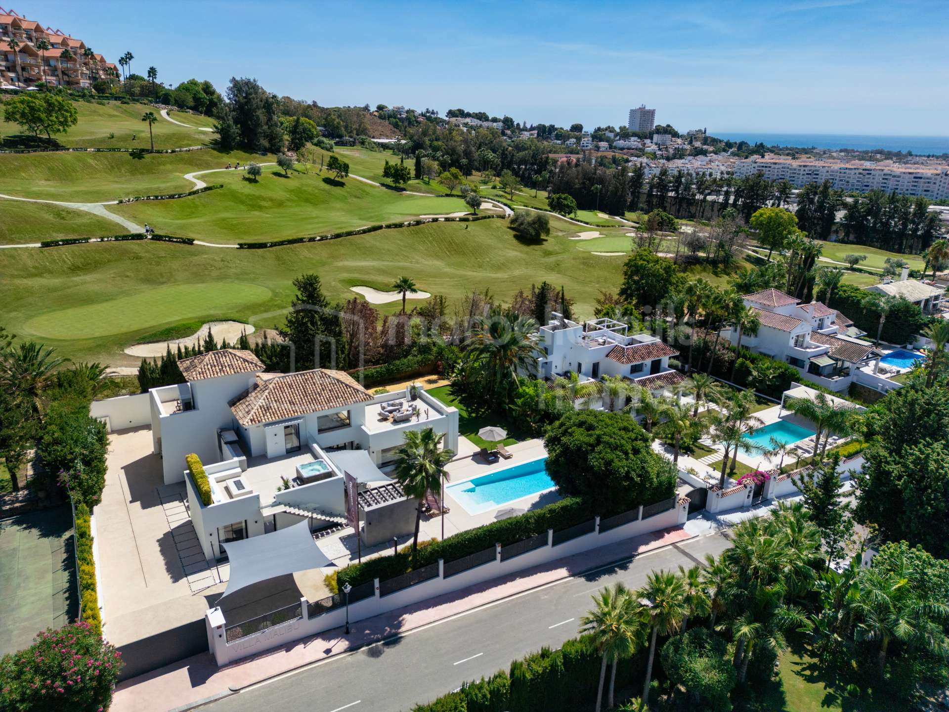 Situada en el exclusivo Valle del Golf de Marbella, la villa está rodeada de campos de prestigio como Los Naranjos, Aloha y Las Brisas. La zona combina tranquilidad y comodidad, con restaurantes de alta gama, el Centro Plaza y colegios internacionales como Aloha College a pocos minutos. Puerto Banús y las playas de la Milla de Oro están a un corto trayecto en coche, ofreciendo tiendas de lujo, restaurantes frente al mar y una animada vida nocturna.