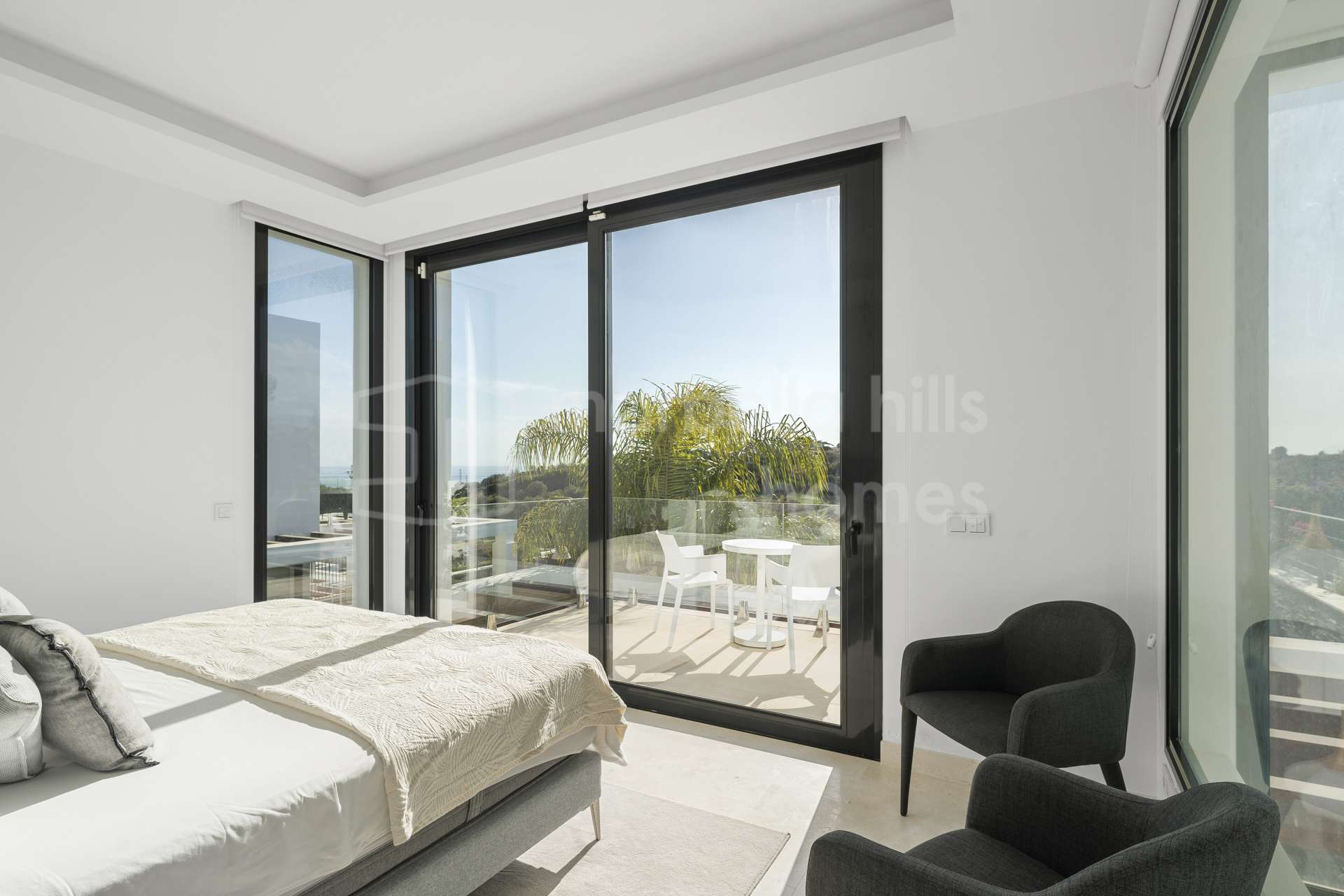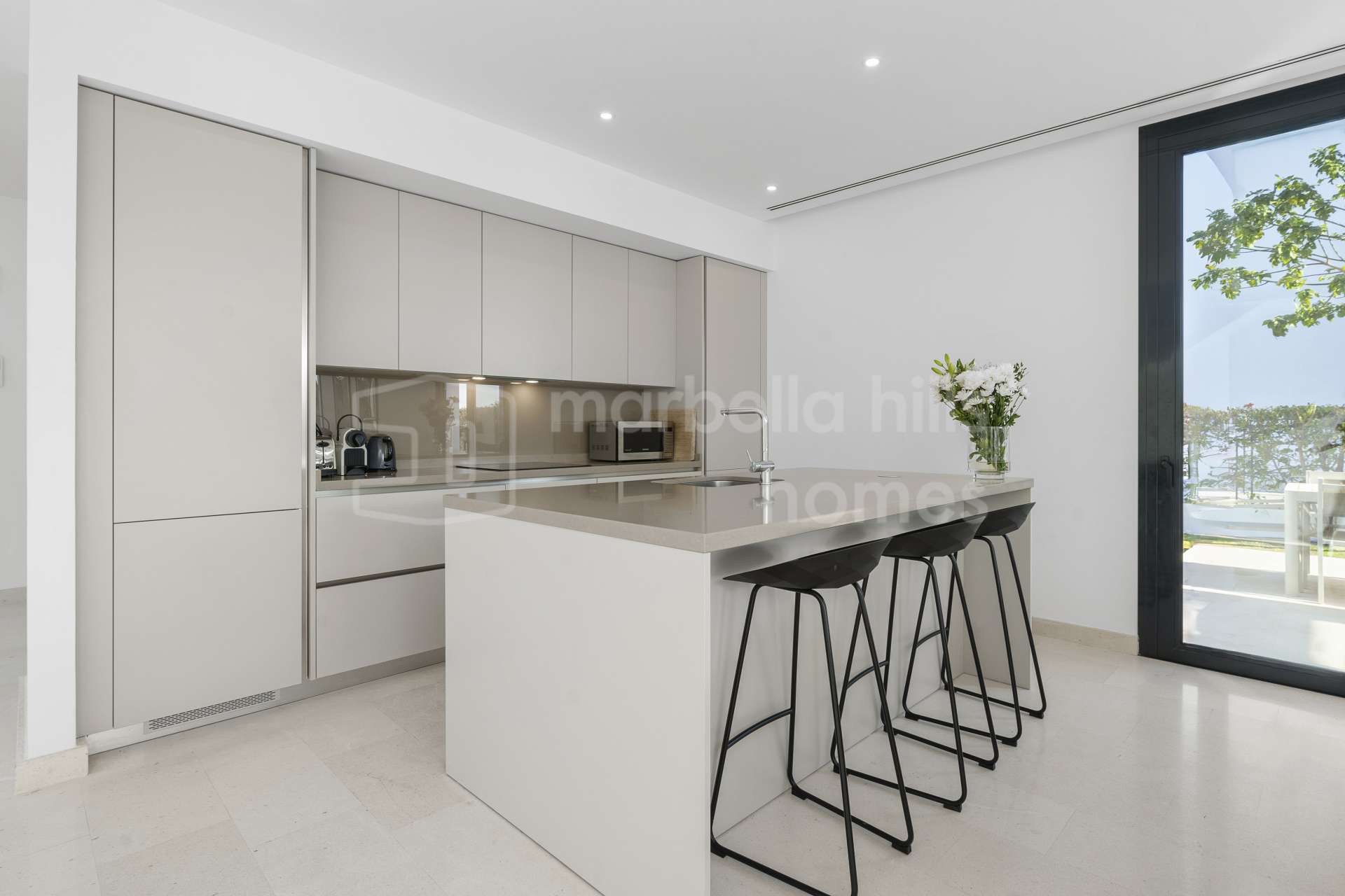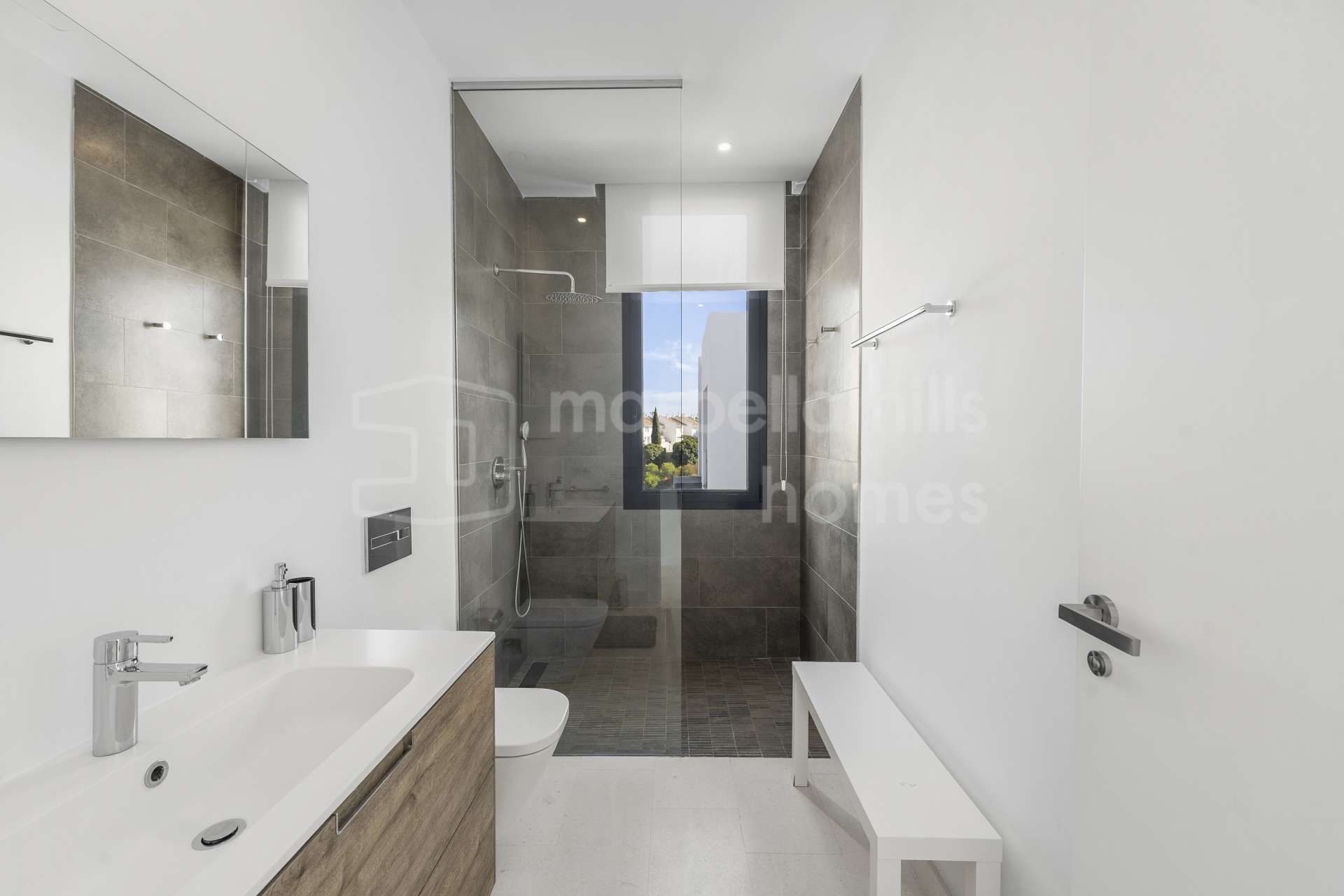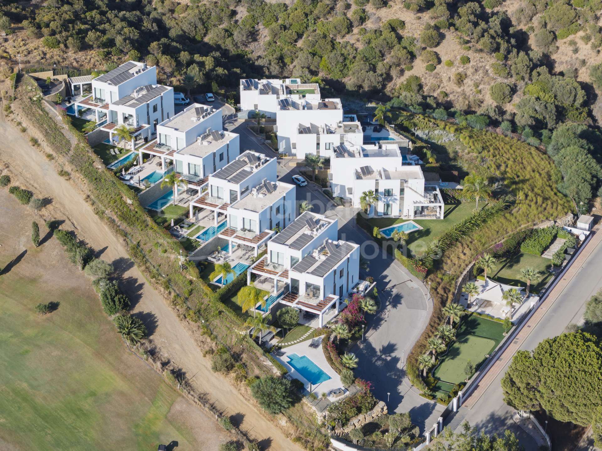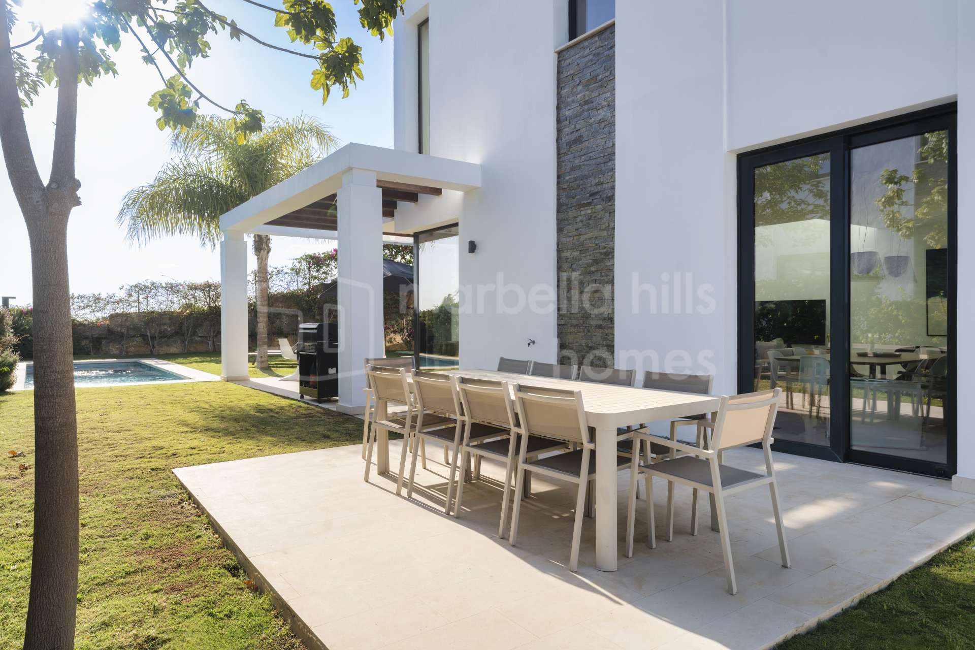 Construida en 2020, la villa ha sido diseñada para maximizar la luz natural y aprovechar al máximo el estilo de vida mediterráneo que conecta los espacios interiores y exteriores de manera fluida. Sobre una parcela privada de 300 m², cuenta con 360 m² construidos y ofrece vistas panorámicas al golf, al mar y al entorno natural.