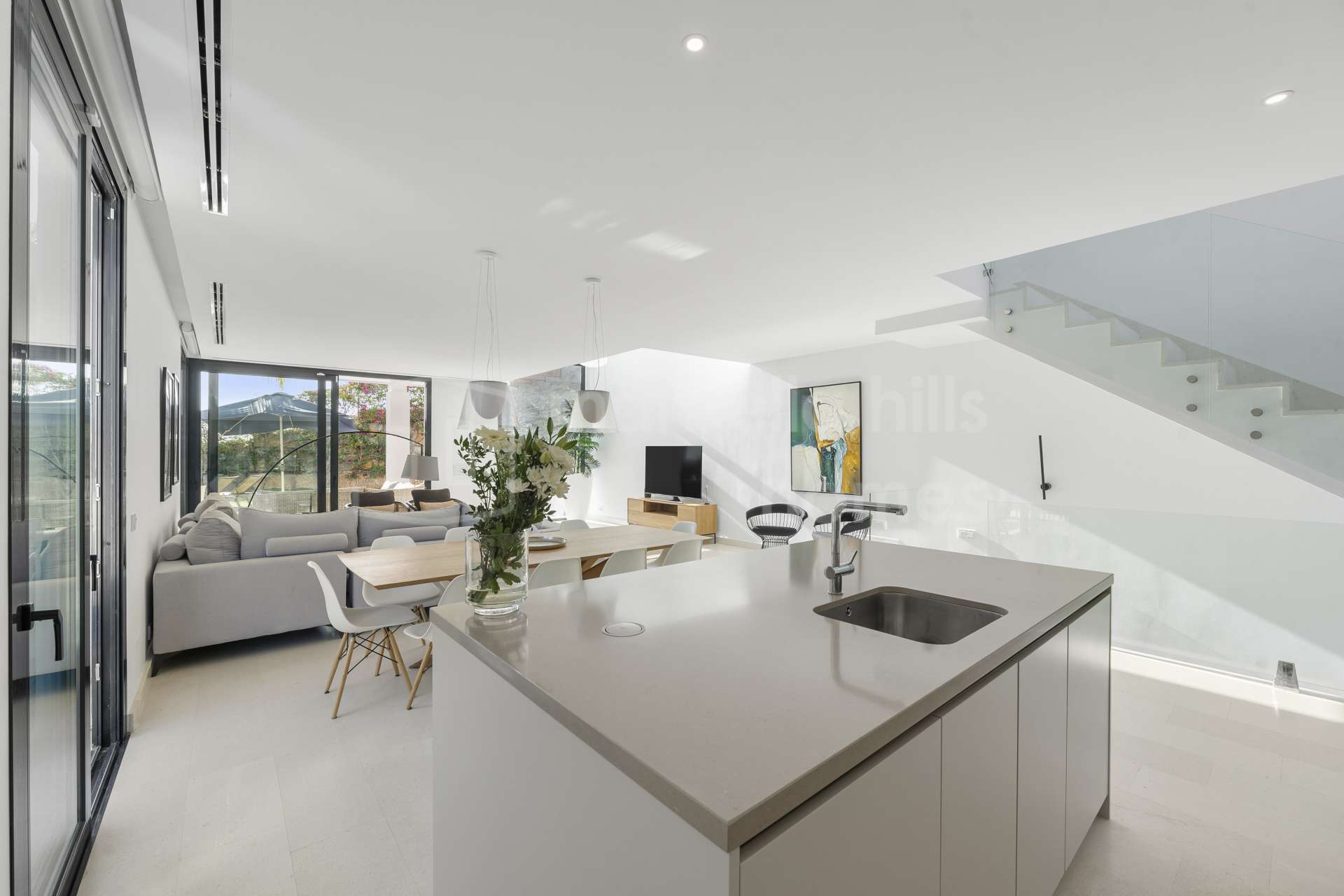 En la planta principal se encuentra la cocina de concepto abierto junto al salón-comedor, que se extiende hacia una amplia terraza amueblada, el jardín paisajístico y la piscina privada. Una segunda piscina de inmersión en la terraza añade un toque extra de lujo para relajarse y disfrutar del sol.