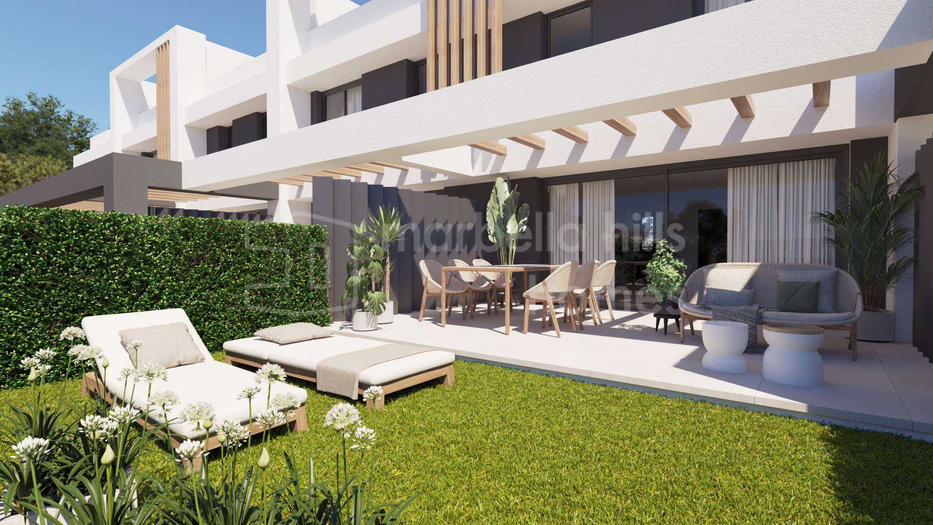 La promoción consta de un número limitado de viviendas de tres dormitorios, pensadas para maximizar la luz natural, la privacidad y la conexión entre espacios interiores y exteriores. Cada vivienda dispone de amplios jardines privados, terrazas generosas y, en muchas unidades, un solárium en la azotea ideal para disfrutar del clima mediterráneo durante todo el año.