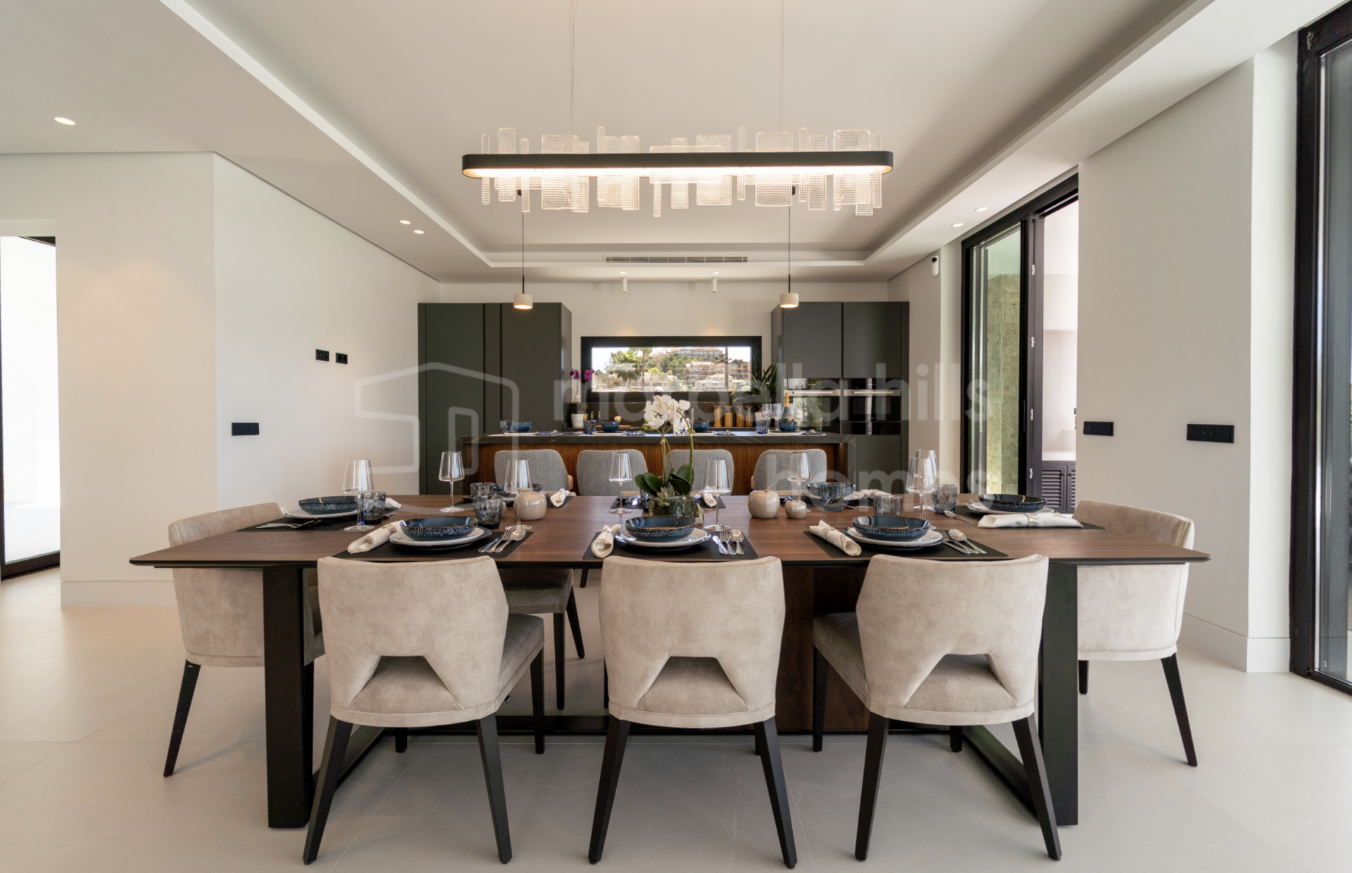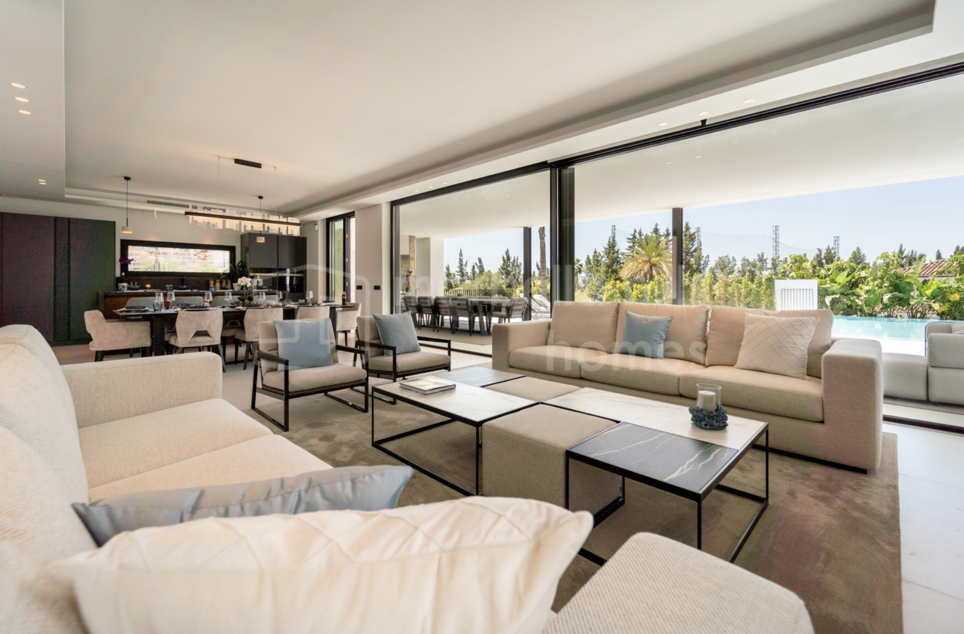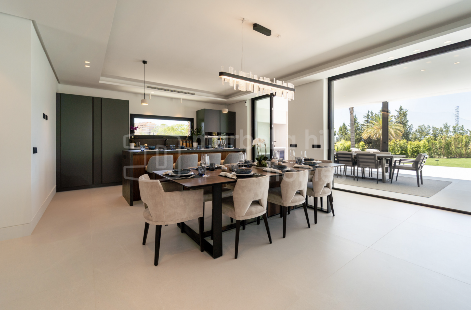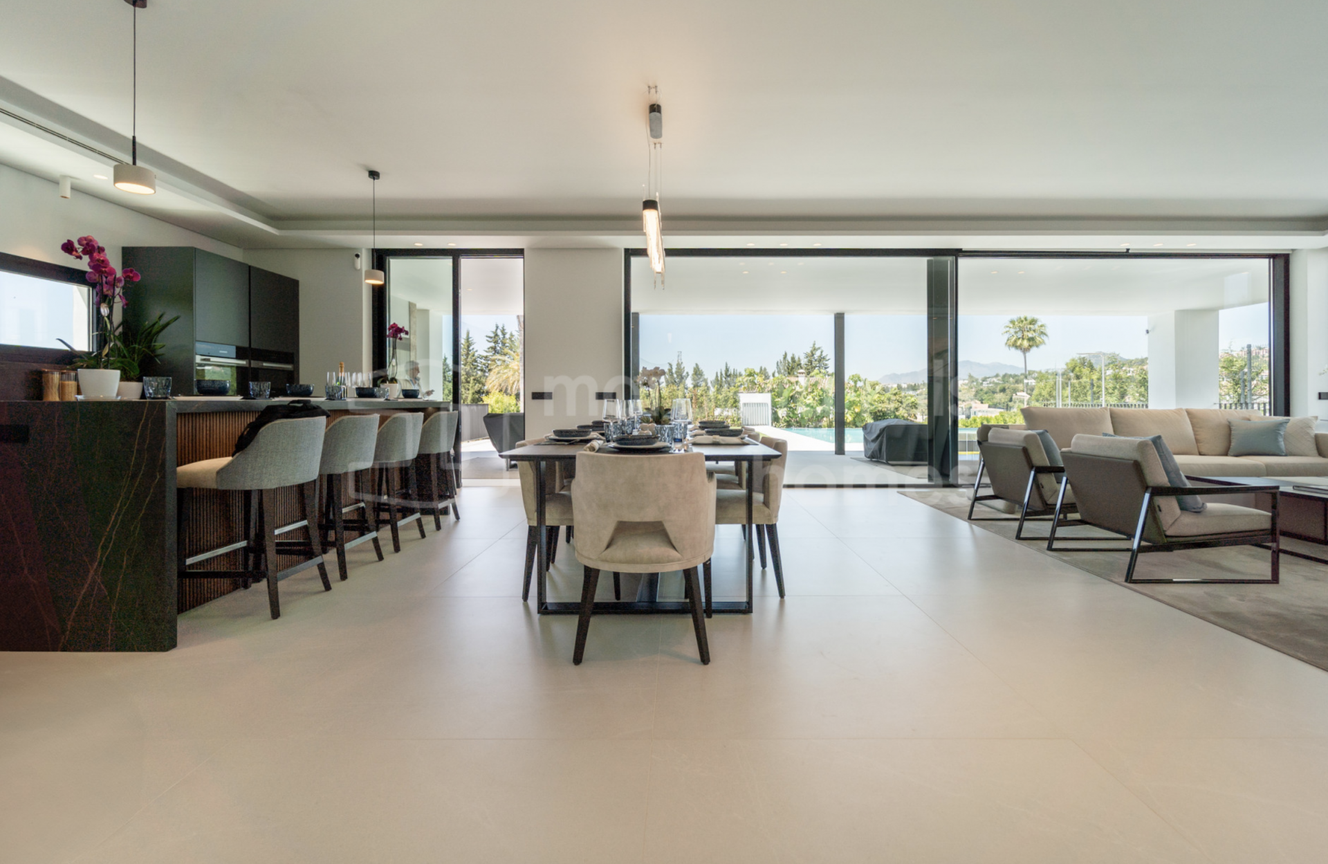 La planta principal se articula en torno a un amplio espacio diáfano que integra cocina, comedor y salón. Los grandes ventanales de suelo a techo se abren directamente a la terraza, enmarcando la piscina y el jardín, y llenando los interiores de luz durante todo el día. La cocina destaca por sus líneas limpias, acabados de alta calidad y acceso directo a la zona de comedor exterior, ideal tanto para el día a día como para recibir invitados.
