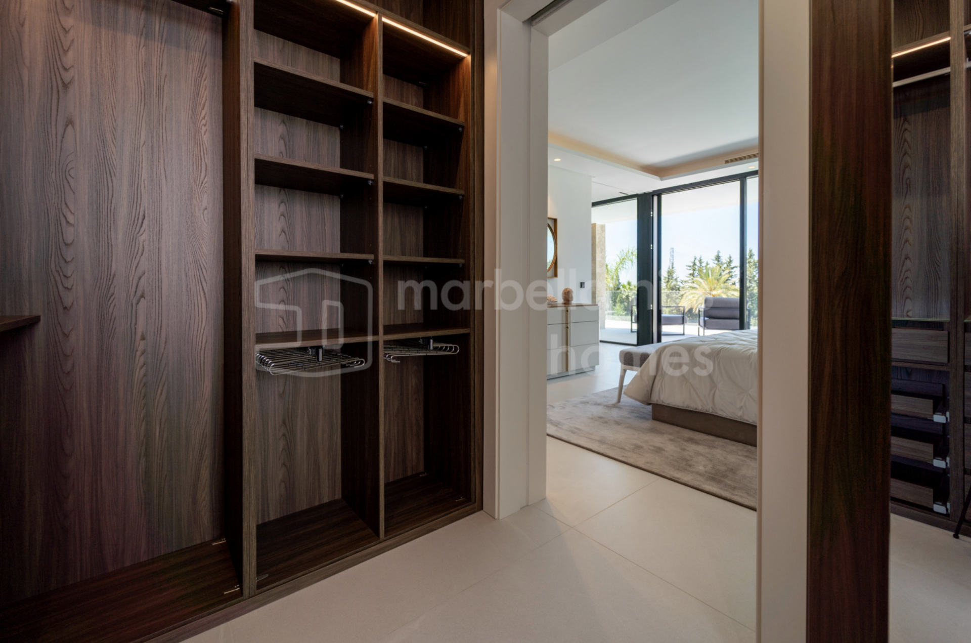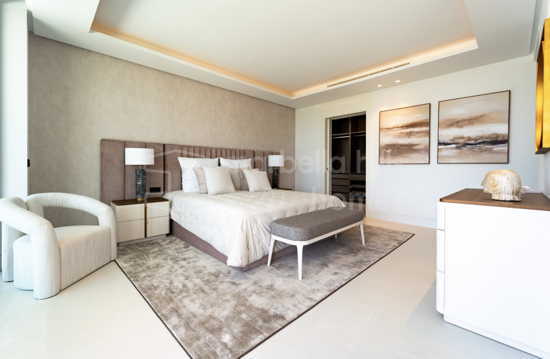 La vivienda dispone de cinco dormitorios, todos con baño en suite, diseñados para ofrecer privacidad y confort. La suite principal ocupa la planta superior y cuenta con terraza privada, vestidor y agradables vistas abiertas al entorno. El resto de dormitorios se distribuye de forma equilibrada, manteniendo una sensación constante de calma y proporción en toda la vivienda.