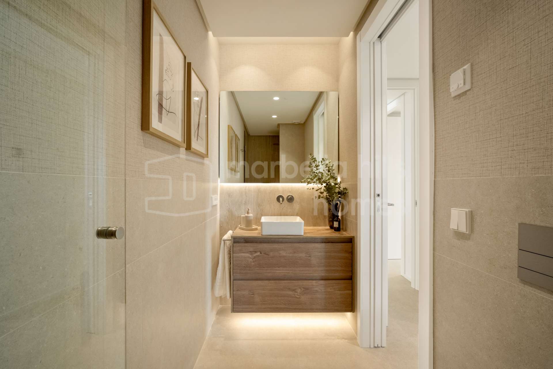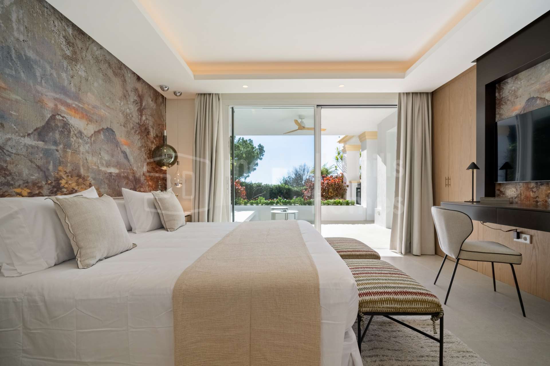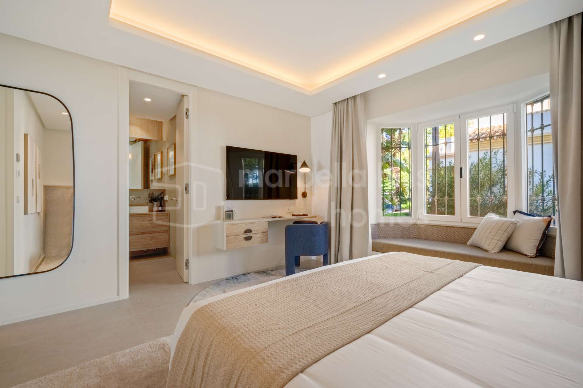 El apartamento dispone de cuatro dormitorios y cuatro baños, todos acabados con materiales refinados y tonos neutros elegantes. El dormitorio principal cuenta con un vestidor independiente y un baño en suite de diseño sofisticado. Además, la propiedad incluye un despacho privado y una sala de televisión independiente, aportando versatilidad y espacios pensados tanto para el trabajo como para el descanso.