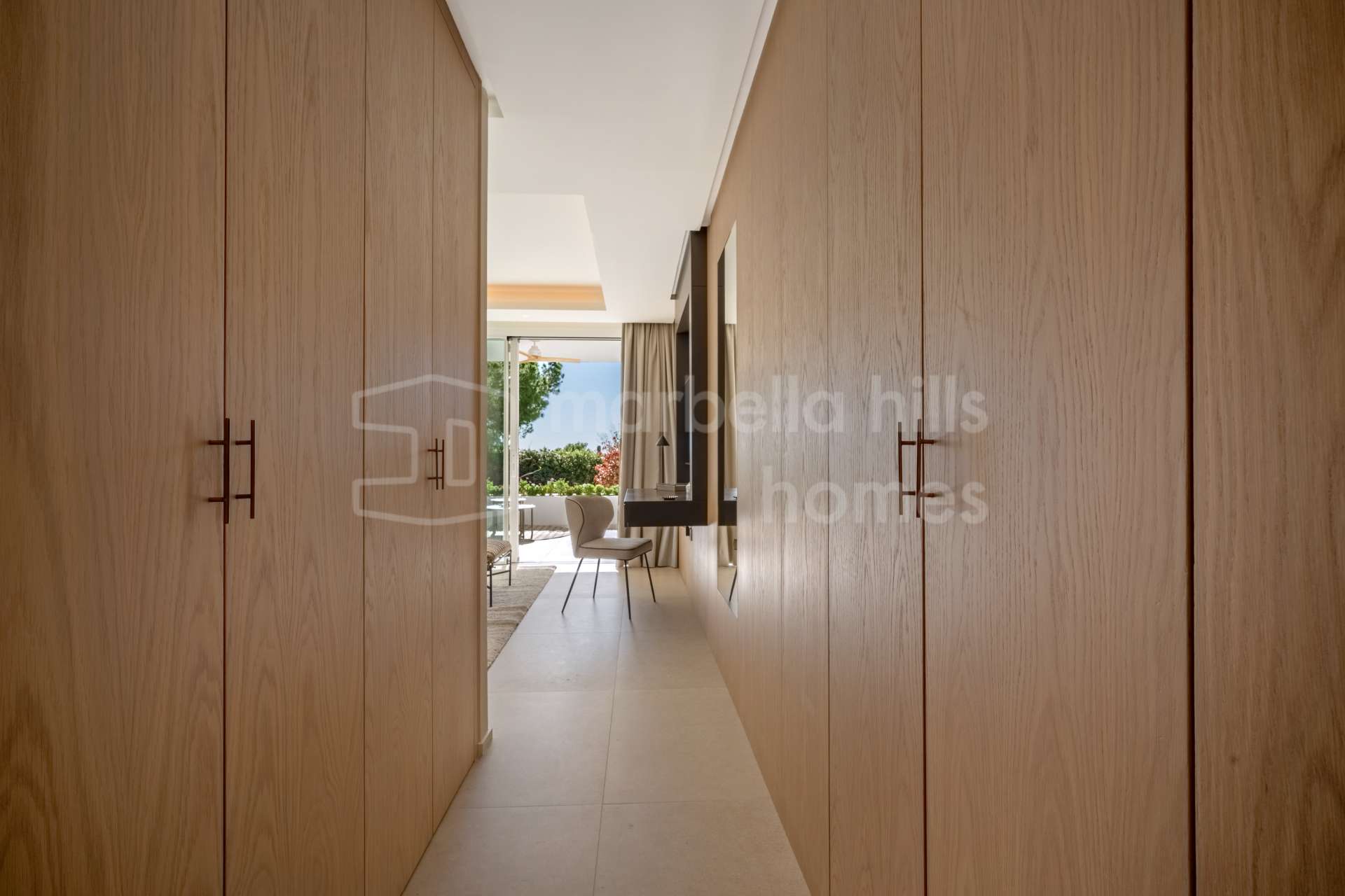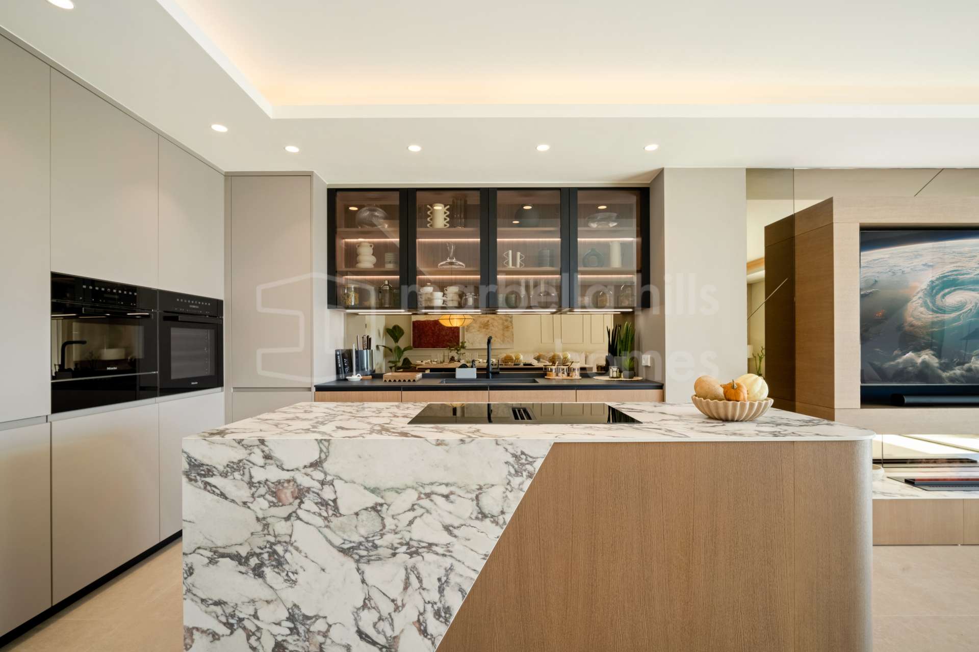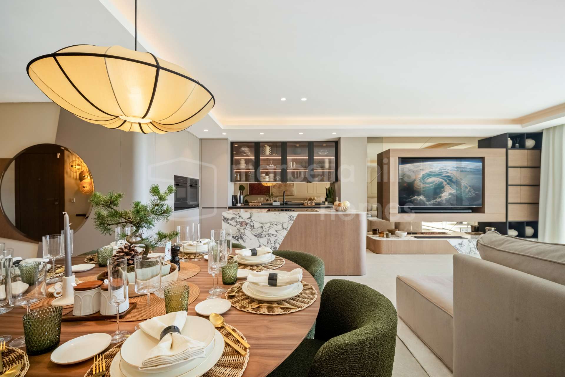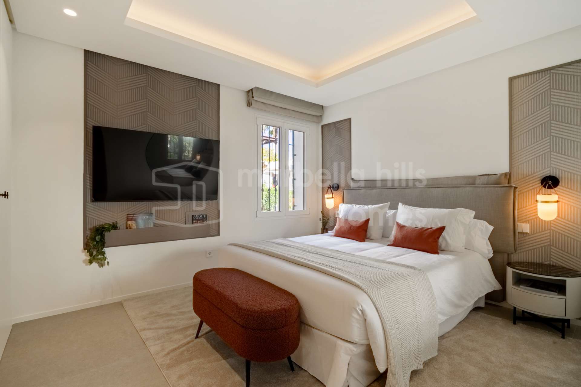 El apartamento dispone de cuatro dormitorios y cuatro baños, todos acabados con materiales refinados y tonos neutros elegantes. El dormitorio principal cuenta con un vestidor independiente y un baño en suite de diseño sofisticado. Además, la propiedad incluye un despacho privado y una sala de televisión independiente, aportando versatilidad y espacios pensados tanto para el trabajo como para el descanso.
