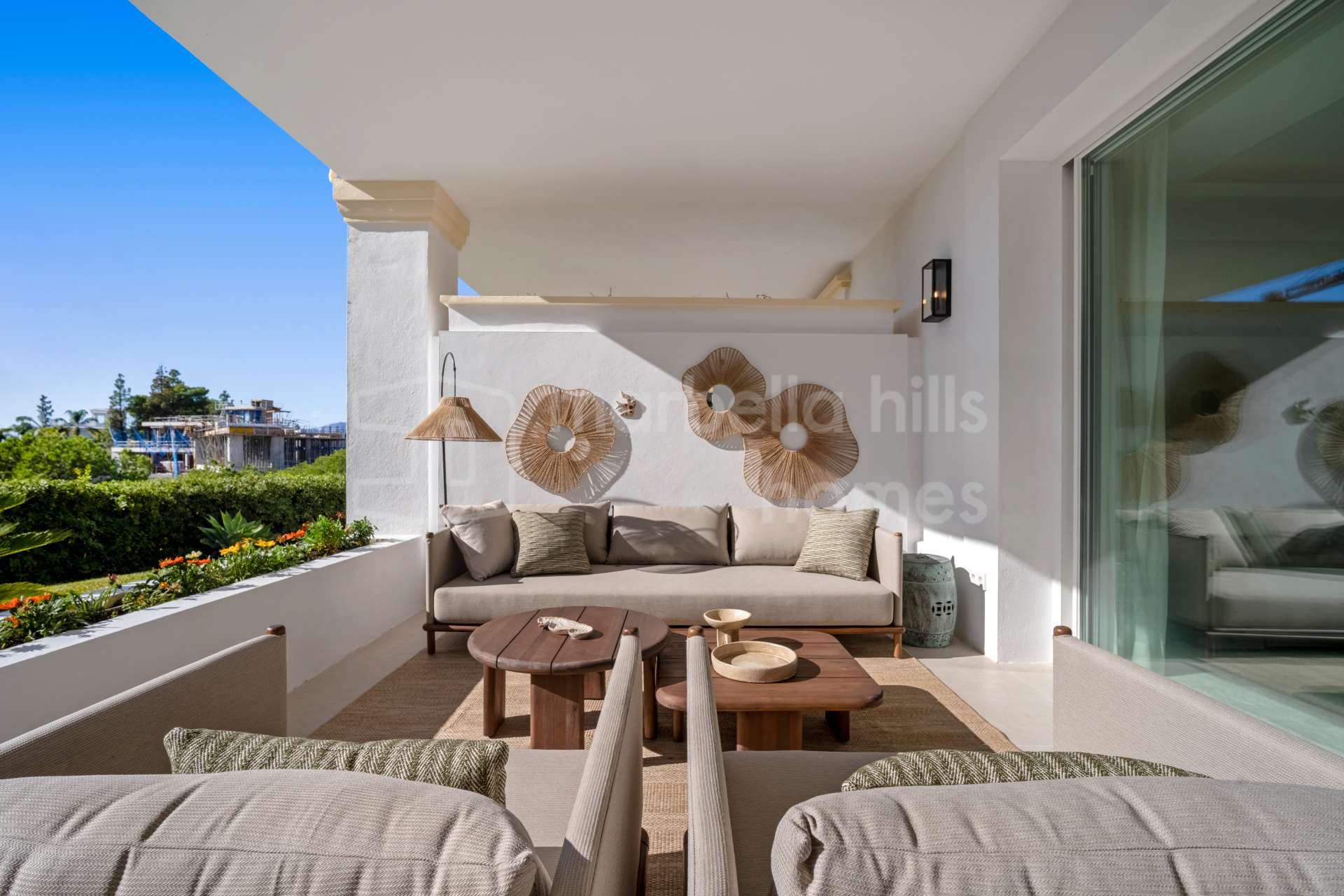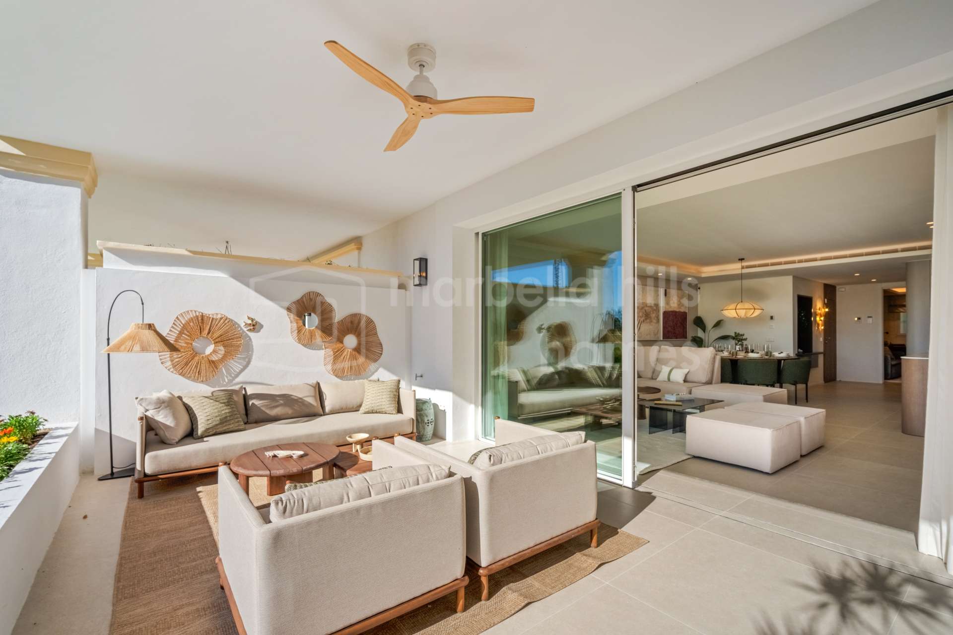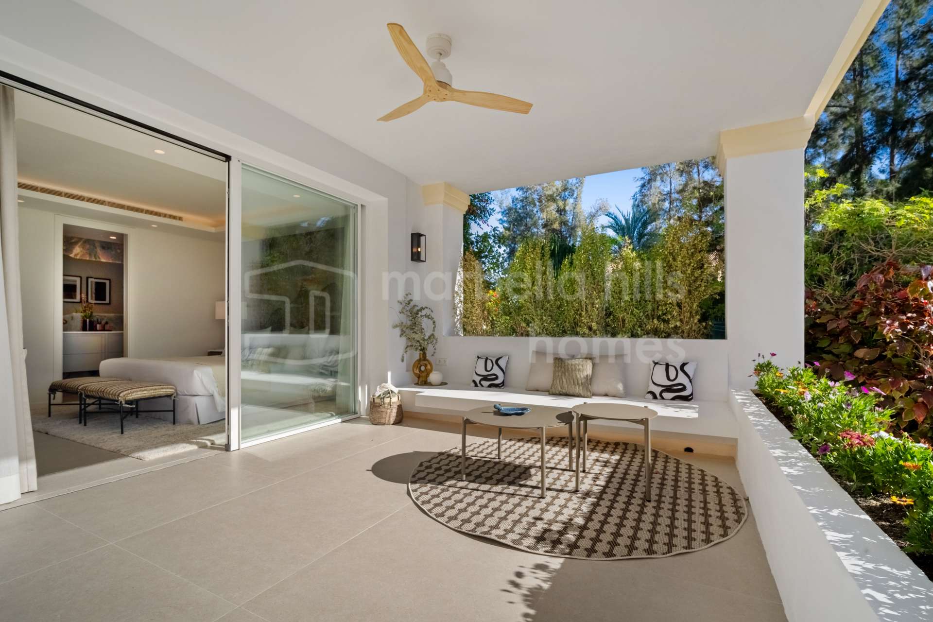 La terraza amplía la zona de estar al exterior y ofrece un entorno tranquilo para comidas al aire libre y disfrute durante todo el año, con acceso directo a las zonas ajardinadas y la piscina comunitaria.