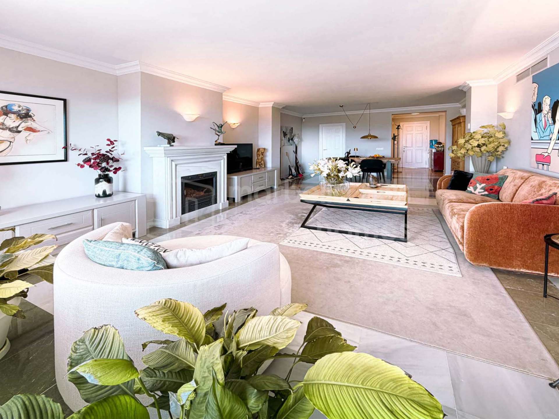 El ático dispone de un amplio salón-comedor con grandes ventanales que enmarcan vistas despejadas al mar, Gibraltar e incluso la costa de África en días claros. La distribución está diseñada para disfrutar de un estilo de vida interior-exterior, una característica clave del mercado inmobiliario de lujo en Marbella.