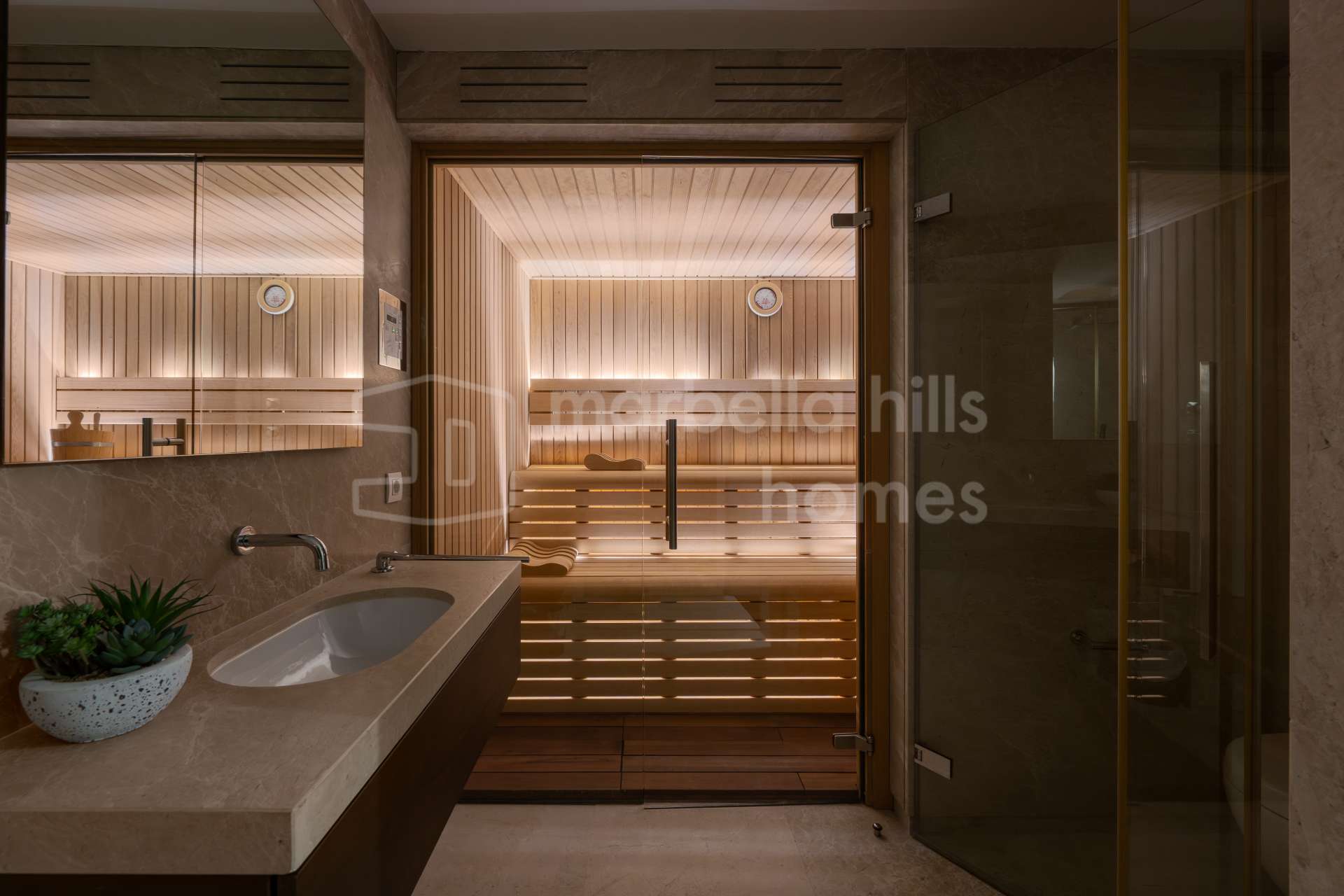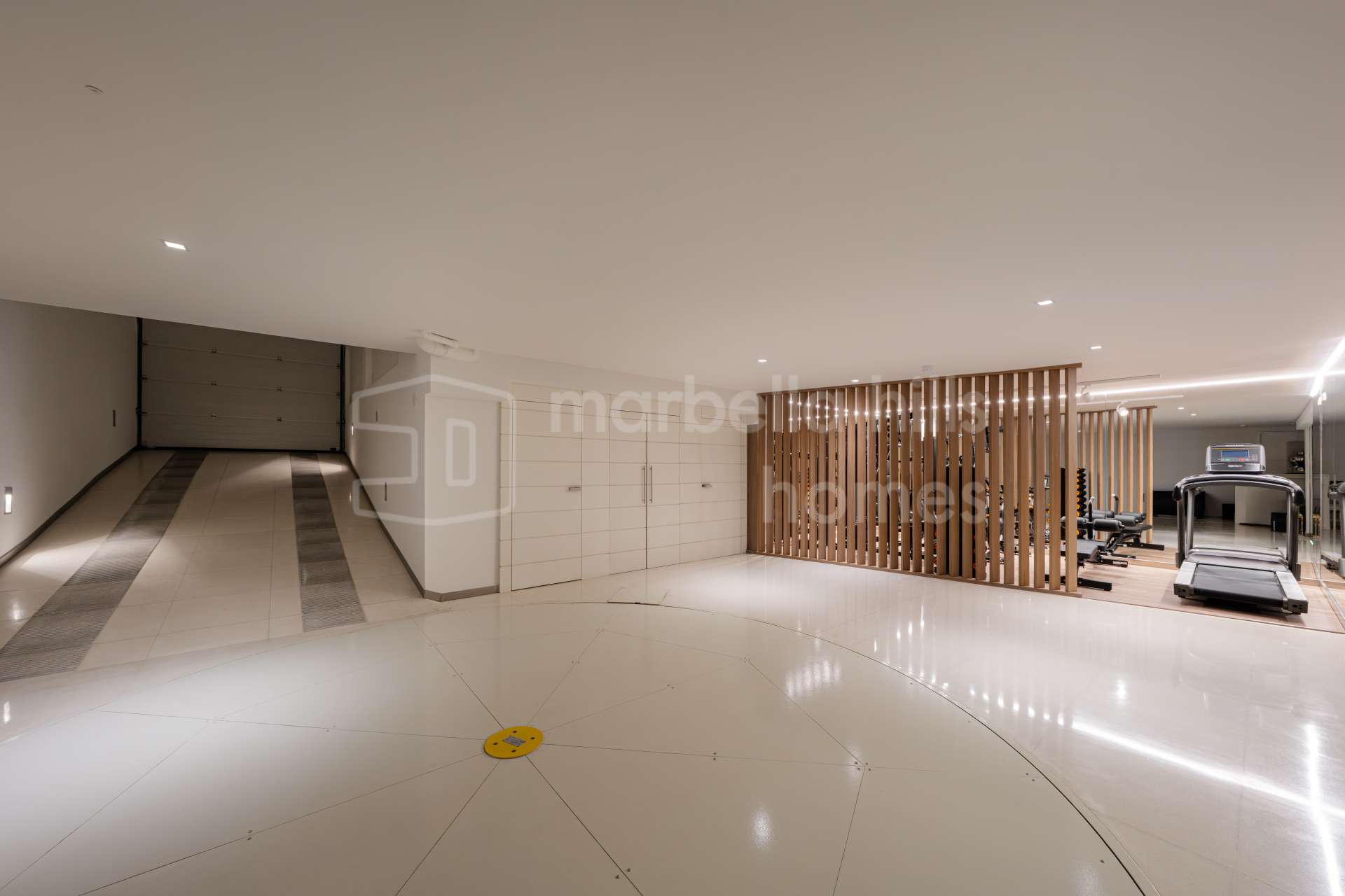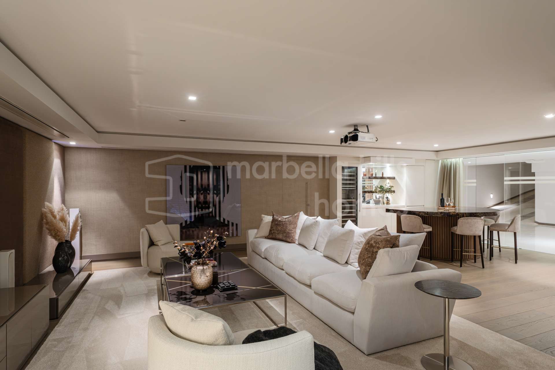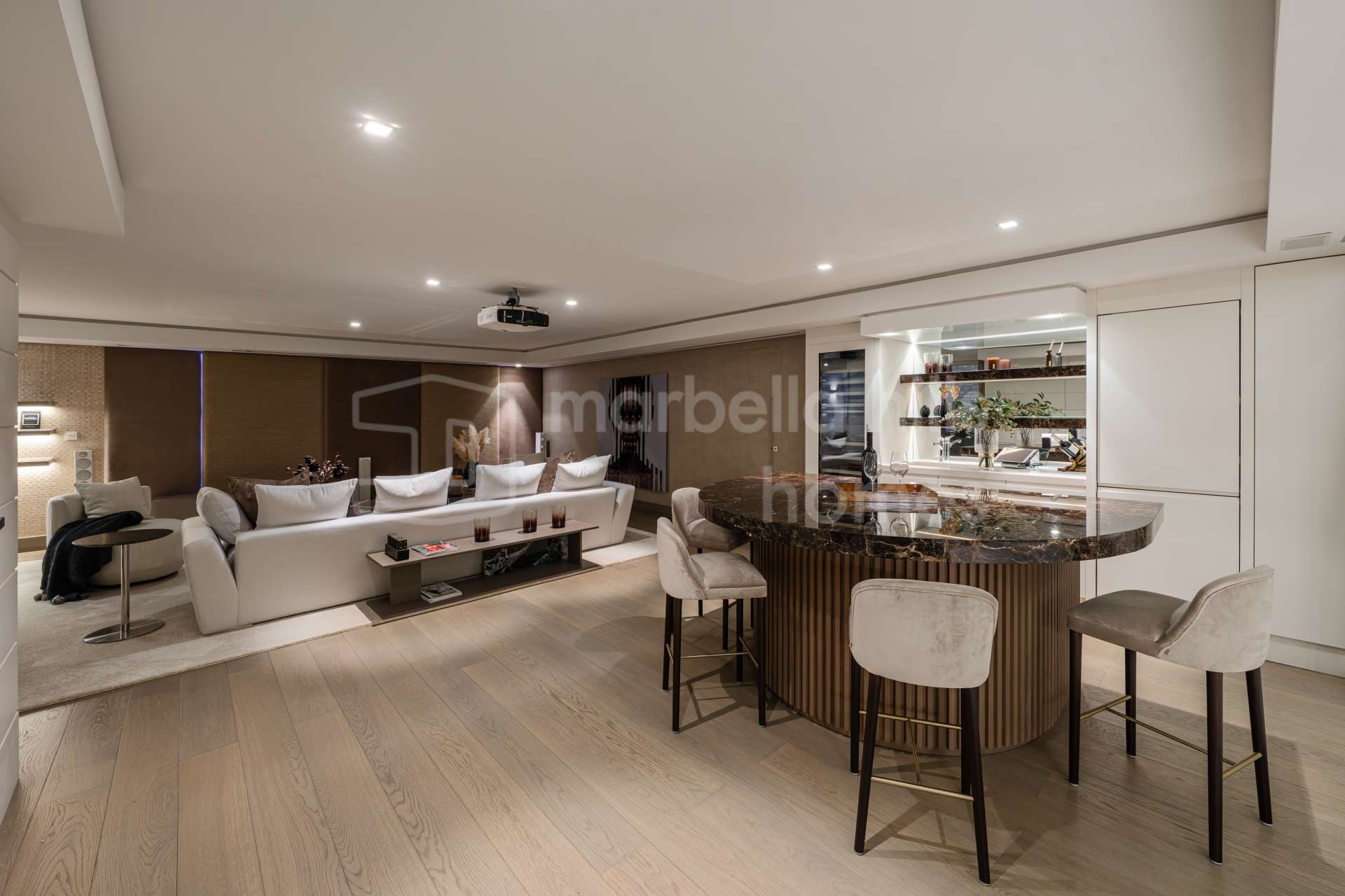 La planta inferior está diseñada como espacio de ocio y bienestar, con gimnasio completamente equipado, sauna, sala de cine y zona de entretenimiento con bar. Esta área convierte la propiedad en una residencia integral dentro del mercado de lujo en Marbella, ofreciendo todas las comodidades para disfrutar del estilo de vida sin salir de casa.