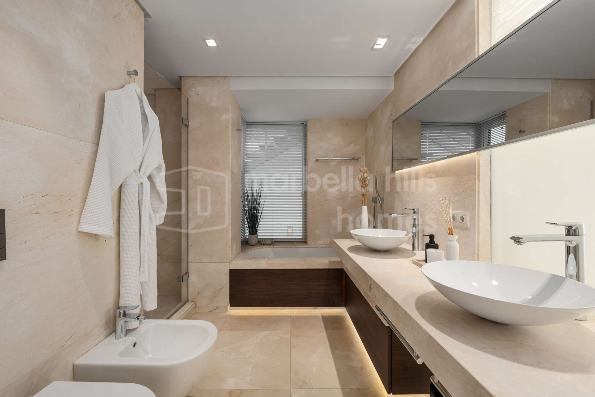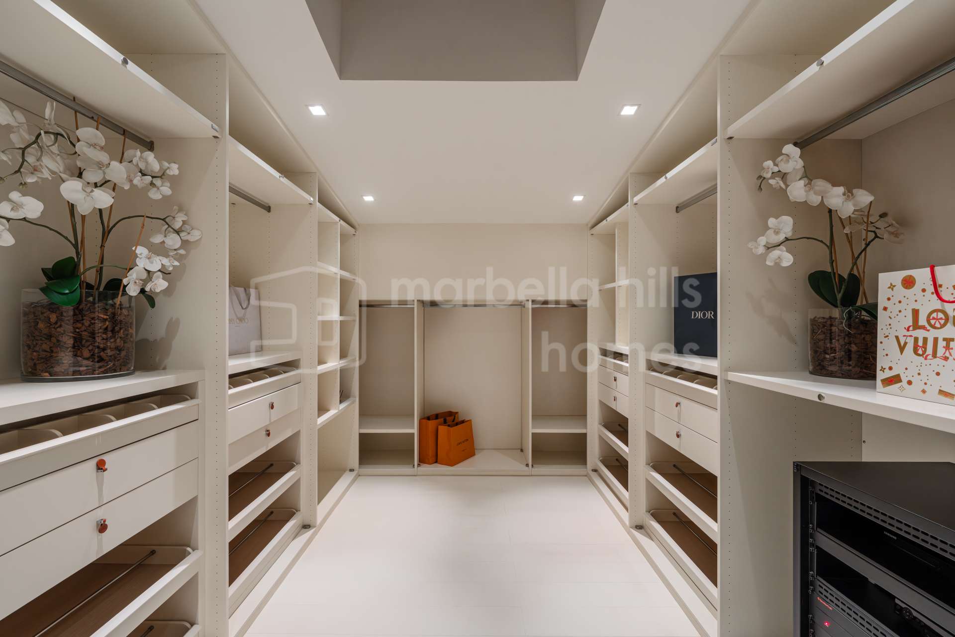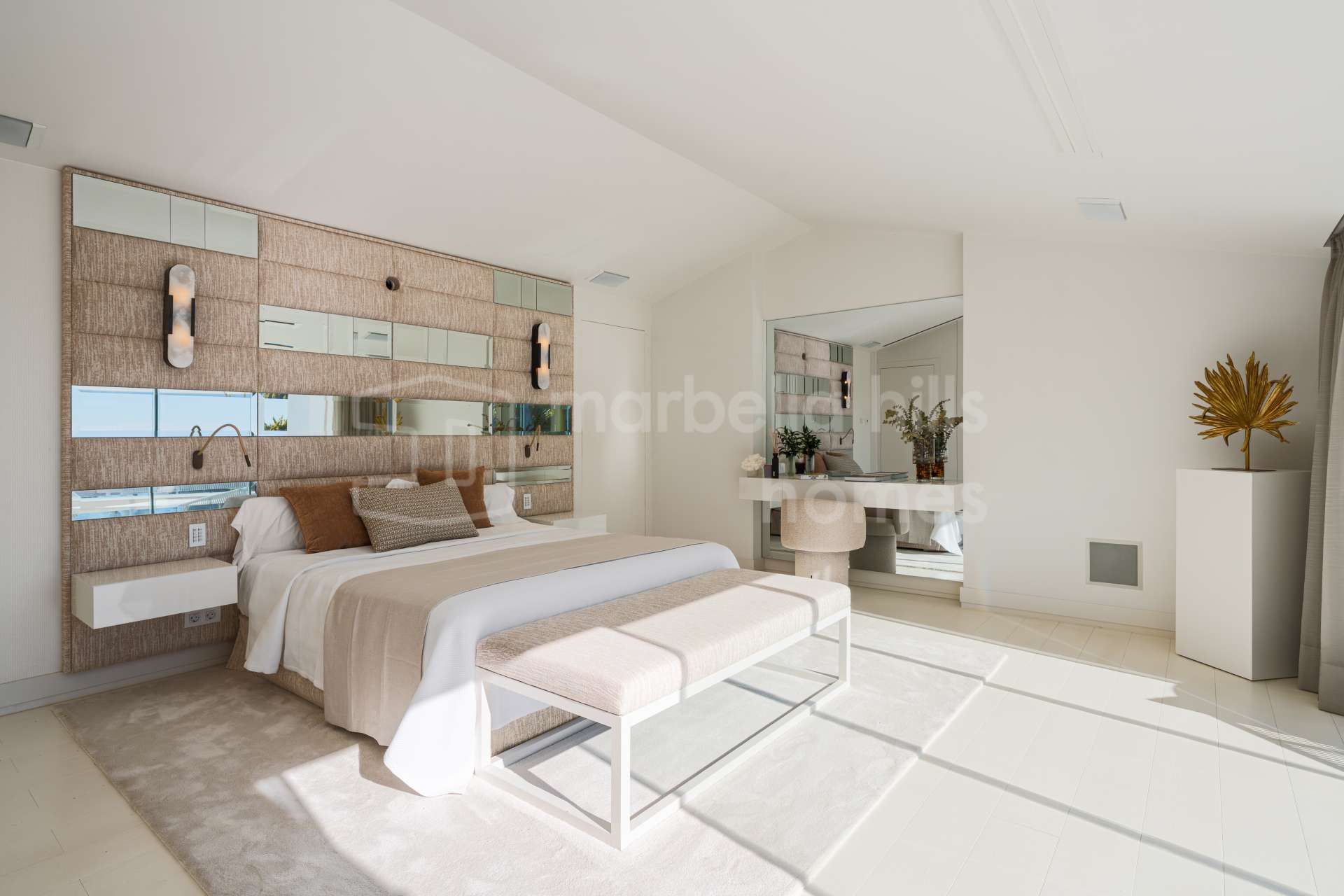 La última planta está dedicada íntegramente a la suite principal, que ocupa todo el ancho de la vivienda e incluye vestidor, elegante baño en suite y terraza privada con vistas abiertas al Mediterráneo. Este nivel aporta un carácter exclusivo poco habitual en propiedades pareadas en la Milla de Oro de Marbella.