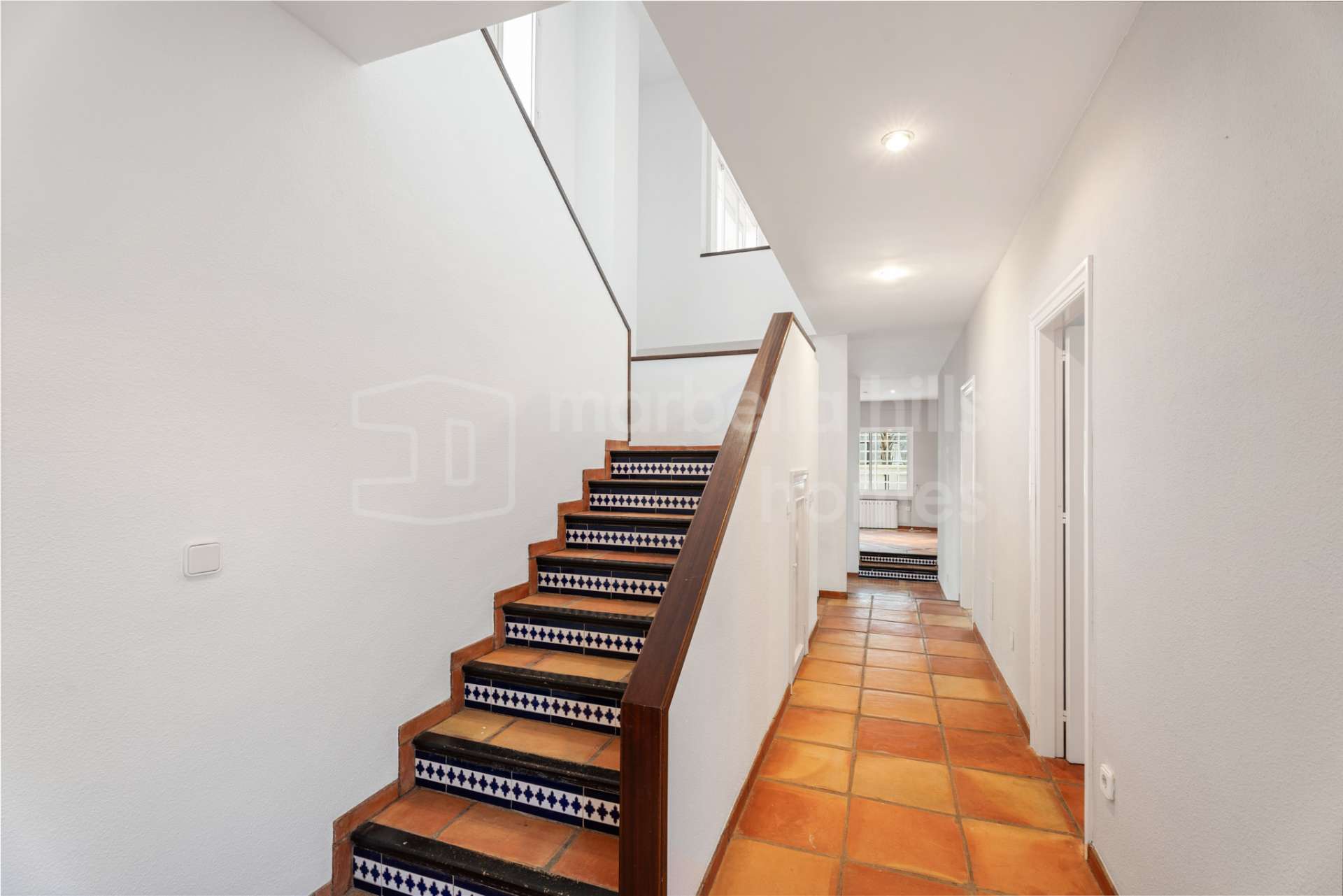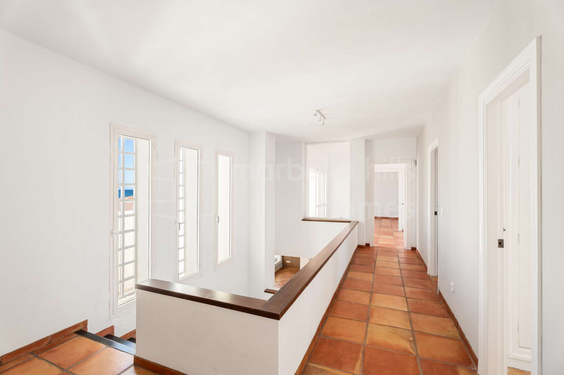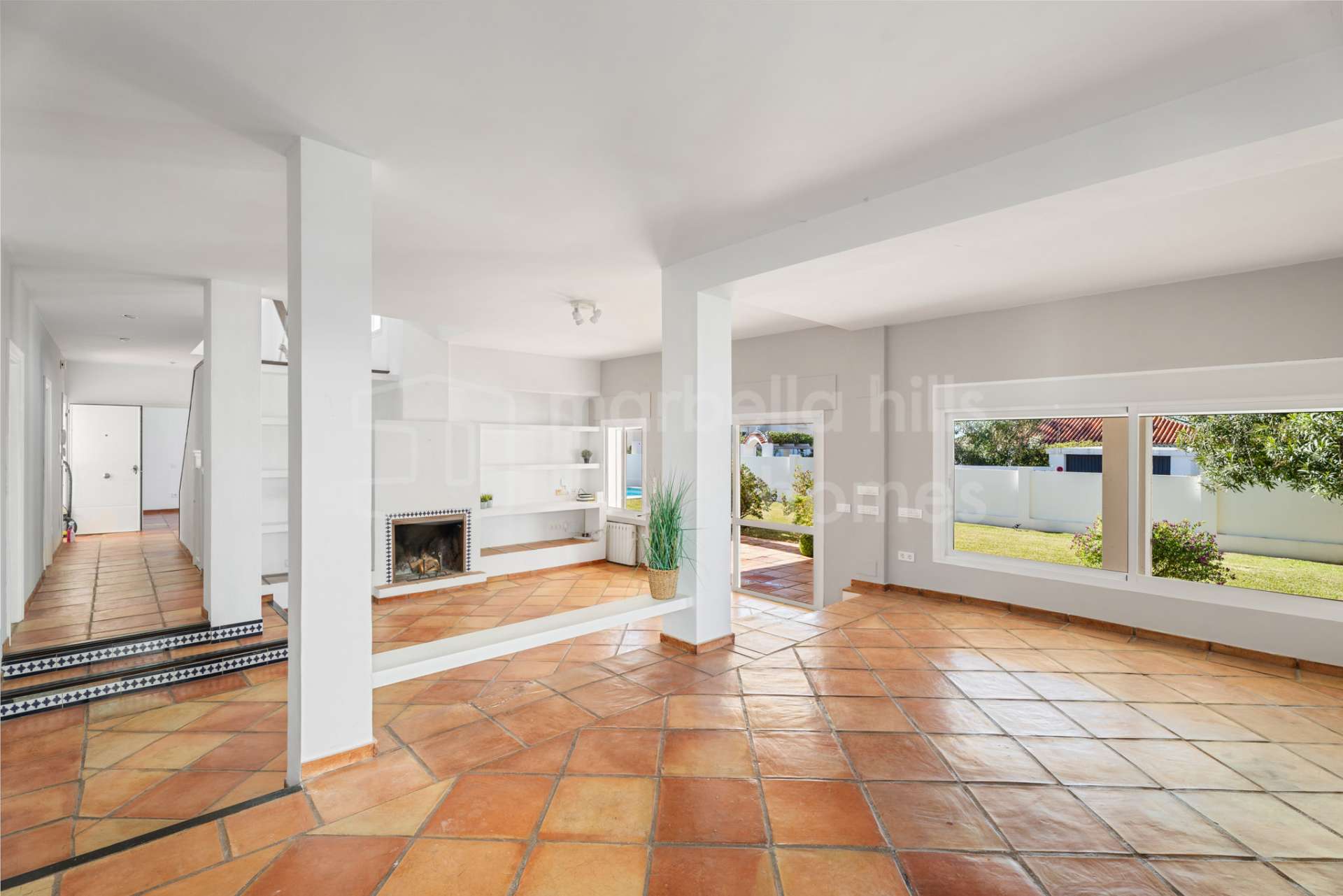 La propiedad dispone de cinco dormitorios y cinco baños, proporcionando amplitud y comodidad tanto para residencia habitual como para segunda vivienda en la Costa del Sol. Los espacios interiores son luminosos y funcionales, con salón con chimenea, suelos de mármol y grandes ventanales que conectan con las terrazas y el jardín.