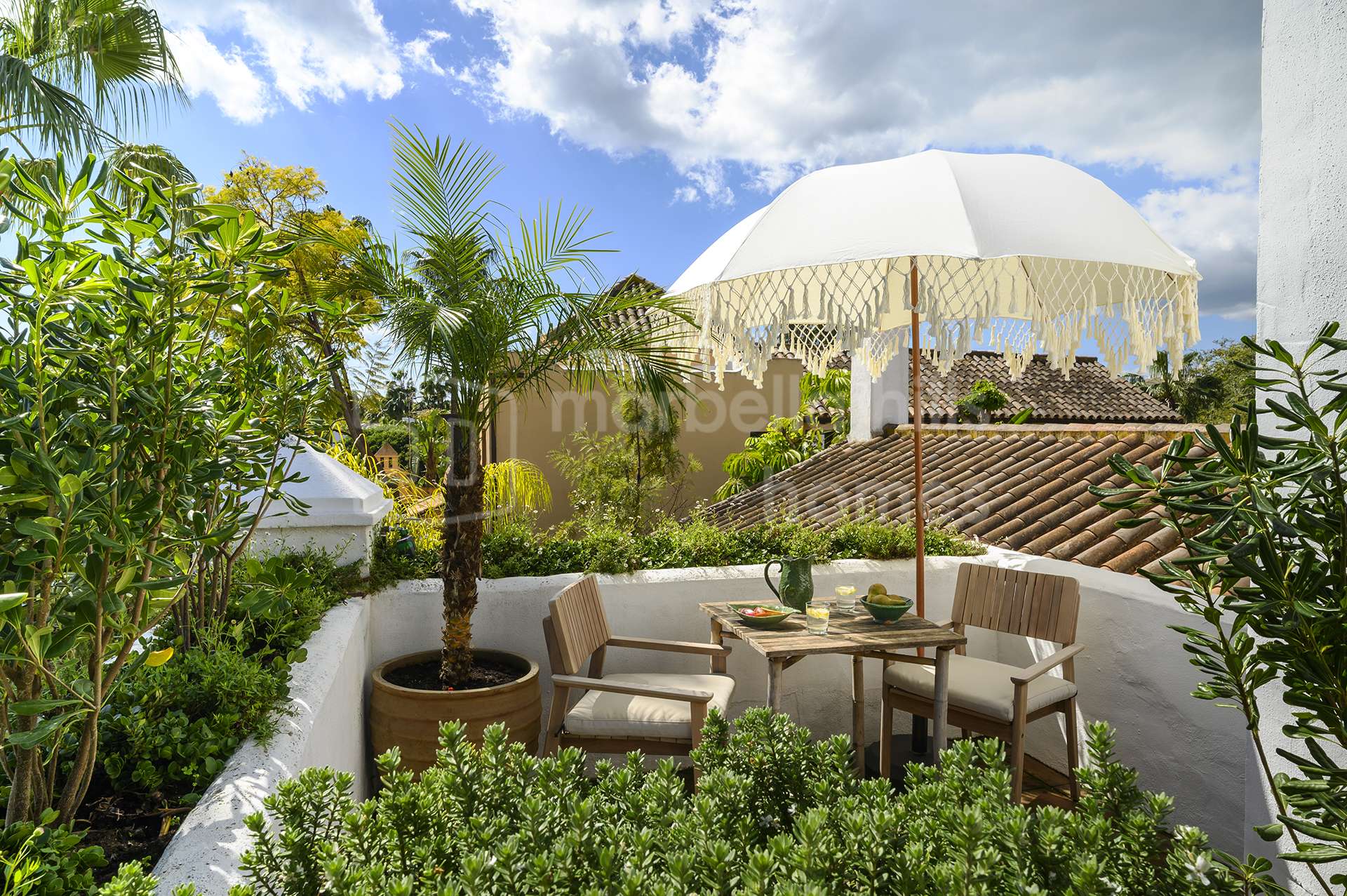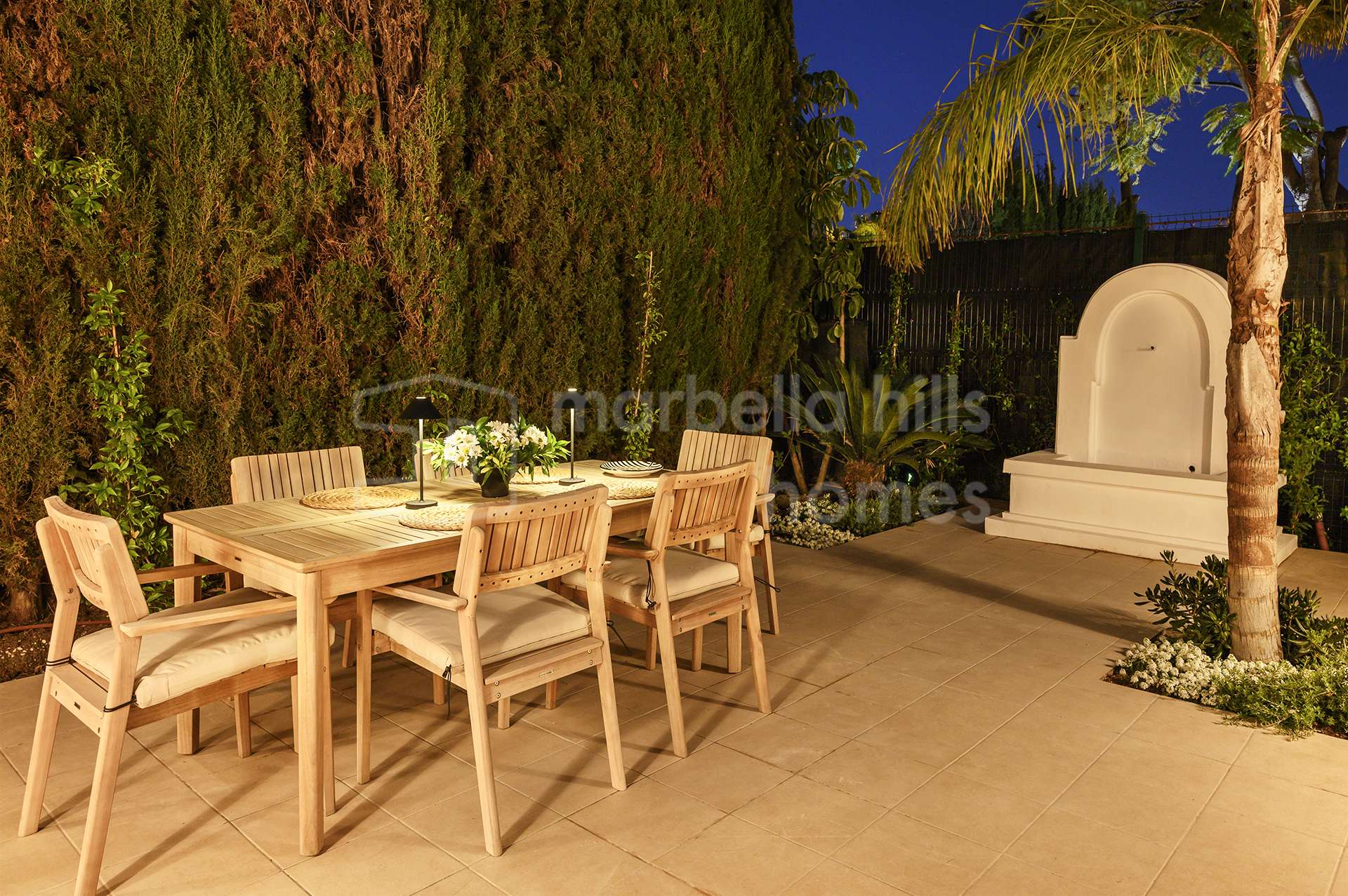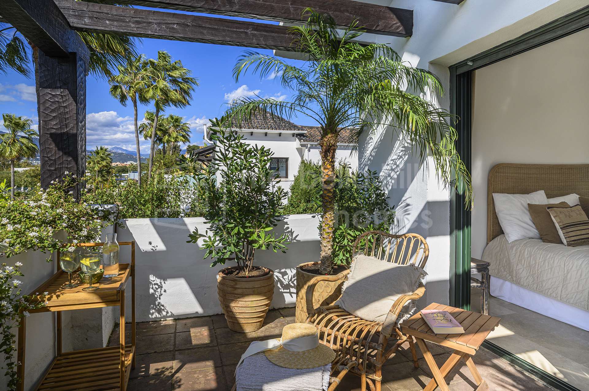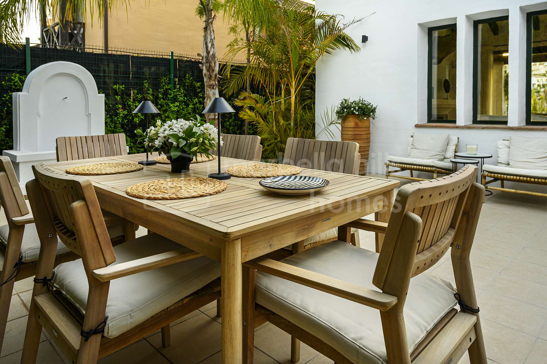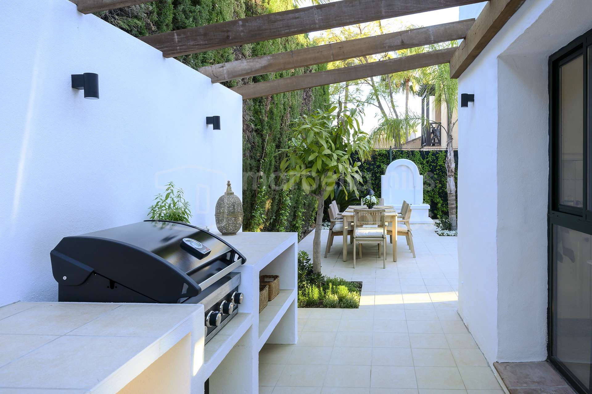 El exterior de la propiedad crea un ambiente de auténtico oasis privado. Senderos rodeados de vegetación, árboles maduros y jardines cuidadosamente diseñados aportan tranquilidad y privacidad. La piscina privada está rodeada por una elegante tarima de madera, creando un espacio perfecto para relajarse y disfrutar del clima mediterráneo.