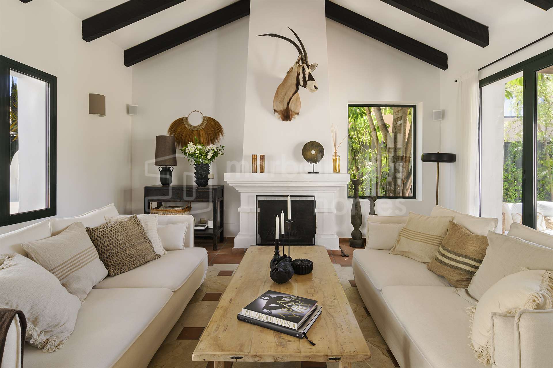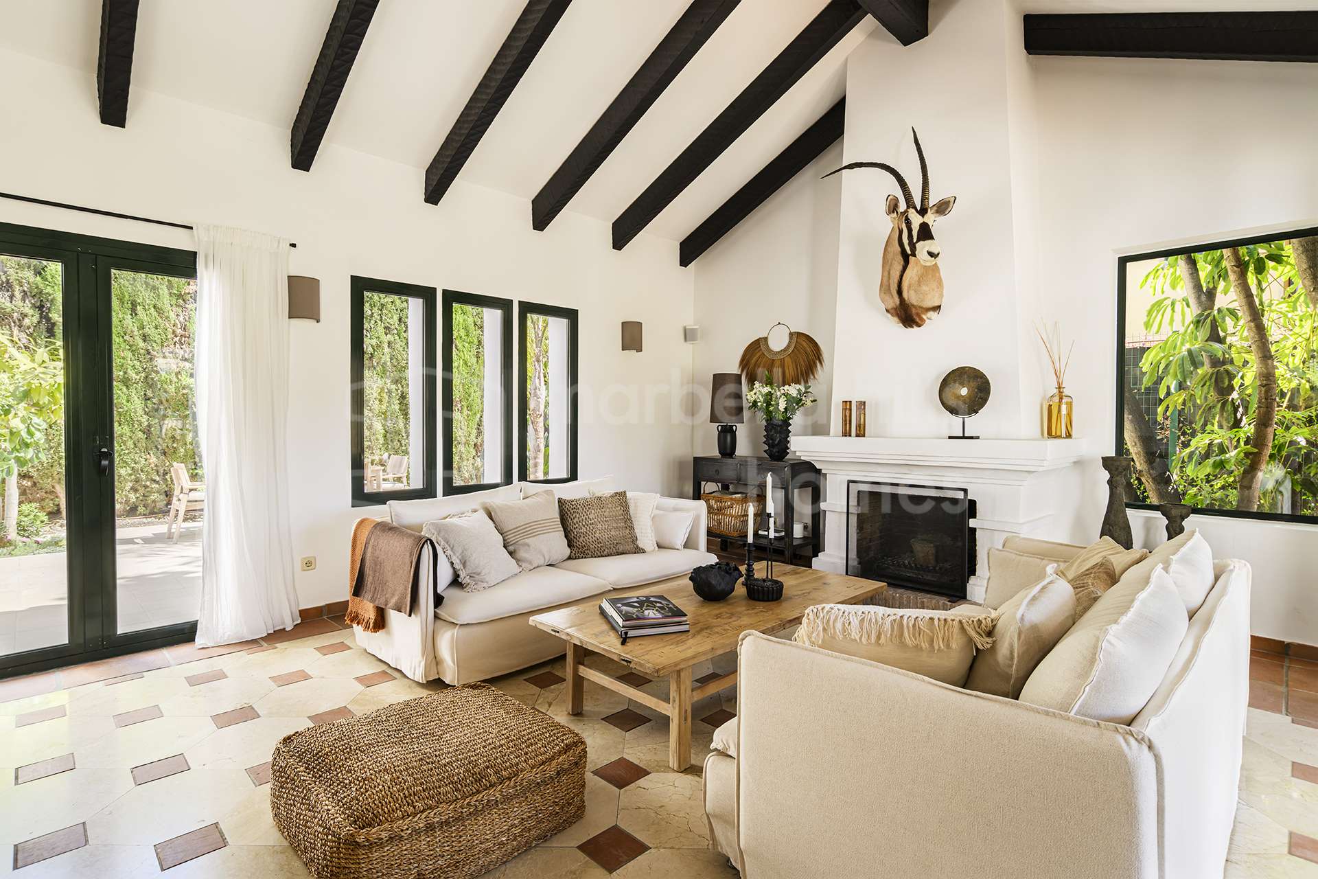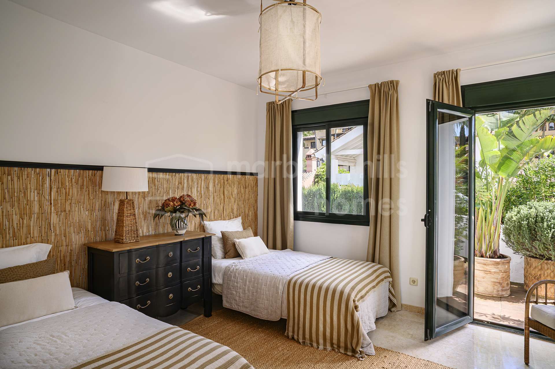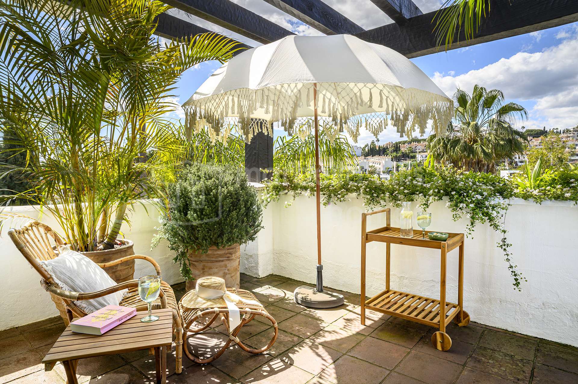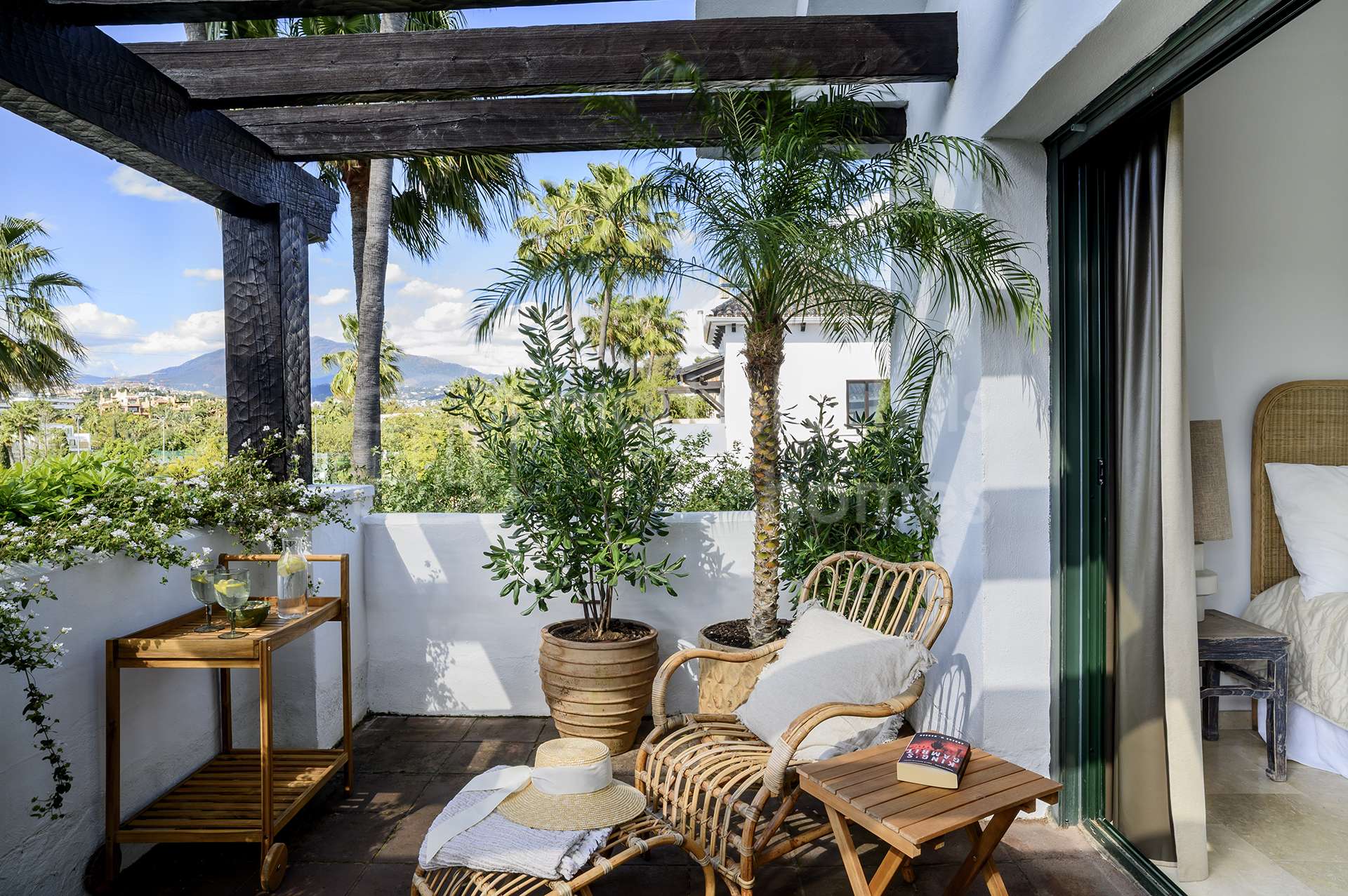 El exterior de la propiedad crea un ambiente de auténtico oasis privado. Senderos rodeados de vegetación, árboles maduros y jardines cuidadosamente diseñados aportan tranquilidad y privacidad. La piscina privada está rodeada por una elegante tarima de madera, creando un espacio perfecto para relajarse y disfrutar del clima mediterráneo.