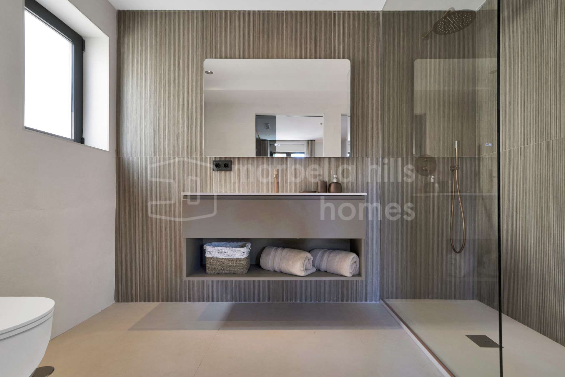 En la primera planta se ubican dos amplios dormitorios en suite, ambos con baños modernos y acabados de alta calidad que garantizan privacidad y confort. La segunda planta está dedicada a la suite principal, diseñada como un espacio privado con su propio baño en suite y una distribución pensada para mayor tranquilidad y comodidad.