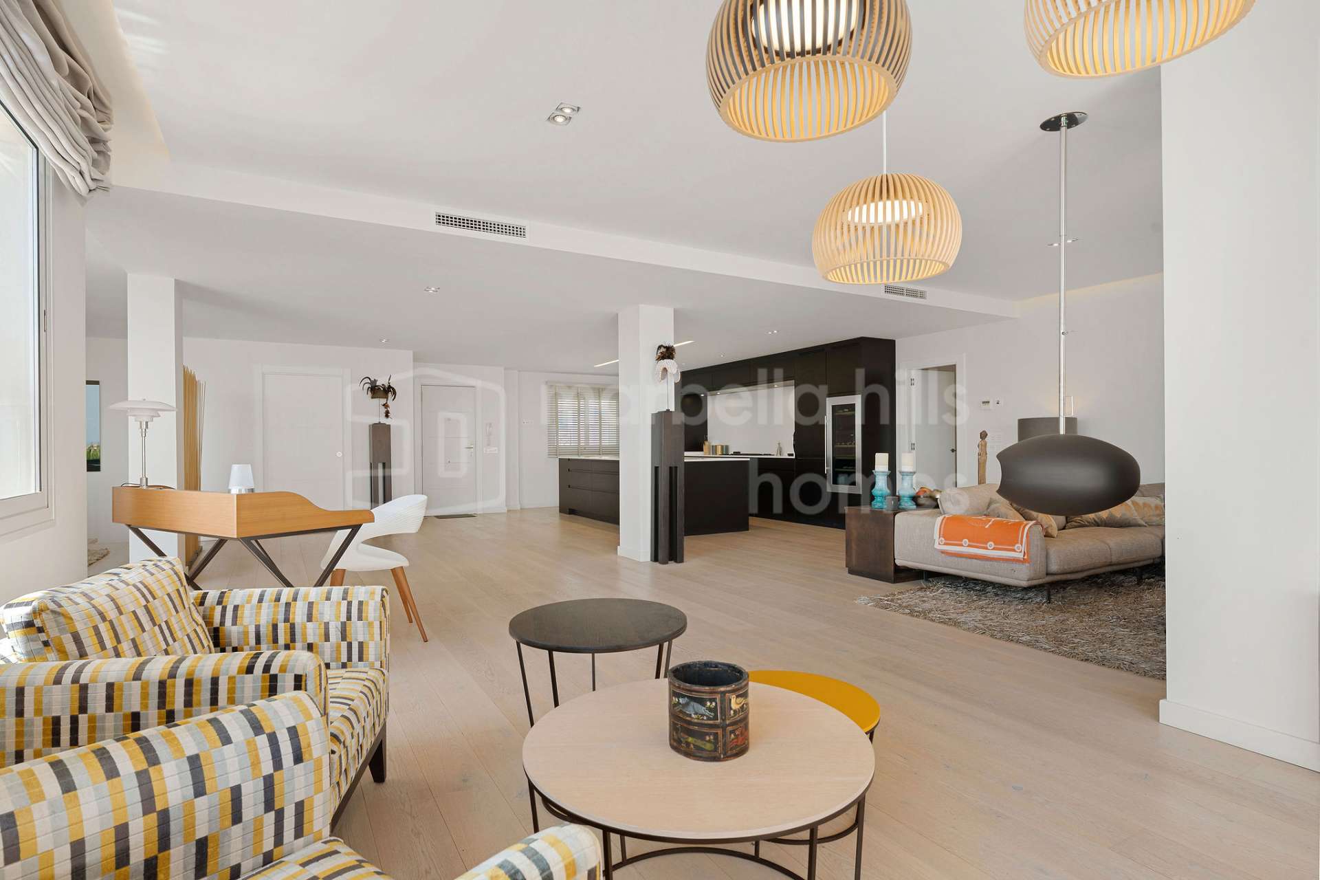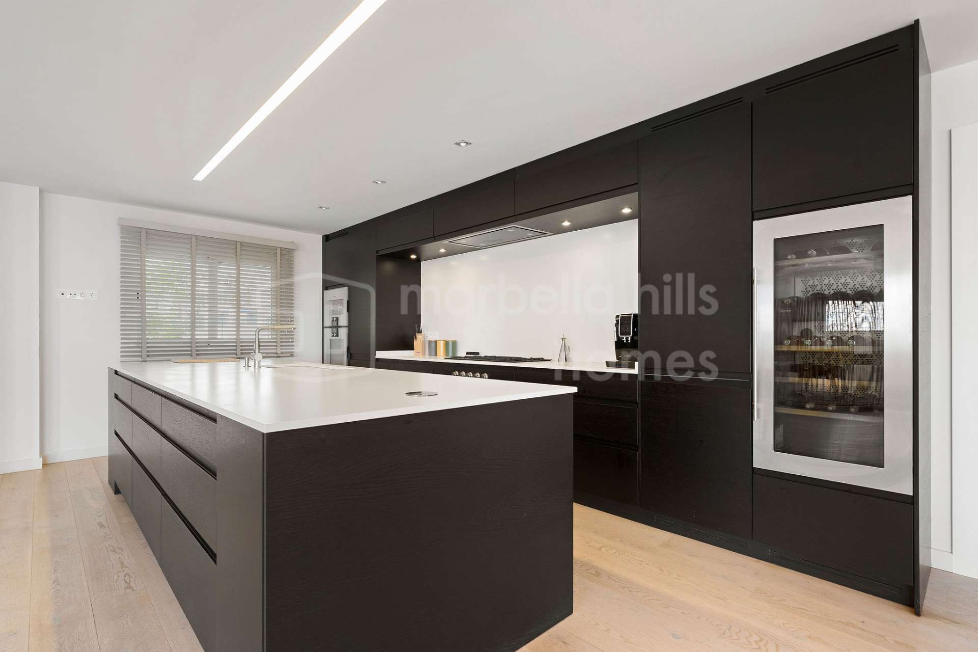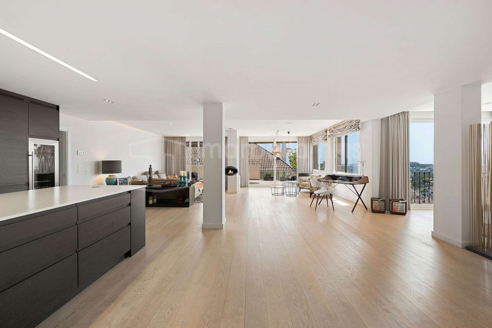 En la planta principal se encuentra una luminosa zona de salón, comedor y cocina de concepto abierto. La cocina contemporánea está equipada con electrodomésticos de alta gama Gaggenau y se integra perfectamente con el salón y el comedor. Grandes puertas correderas conducen a una amplia terraza desde donde se pueden disfrutar impresionantes vistas panorámicas al mar Mediterráneo y a las montañas, creando el entorno perfecto para relajarse o disfrutar de cenas al aire libre.
