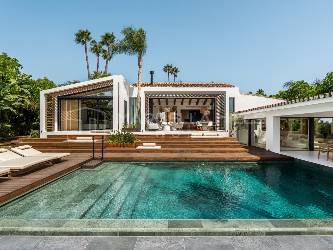 La propiedad combina a la perfección el encanto andaluz tradicional con interiores modernos de estilo boho-chic. La fachada encalada, las terrazas arqueadas y los jardines cuidados evocan elegancia atemporal, mientras que los interiores han sido actualizados con materiales de alta calidad, colores neutros y techos de doble altura que aportan luminosidad y amplitud.