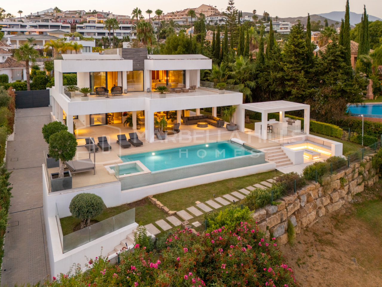 El exterior de la villa es igualmente impresionante, con una amplia terraza, jardines paisajísticos, piscina privada y una azotea ideal para disfrutar de las vistas y las puestas de sol.