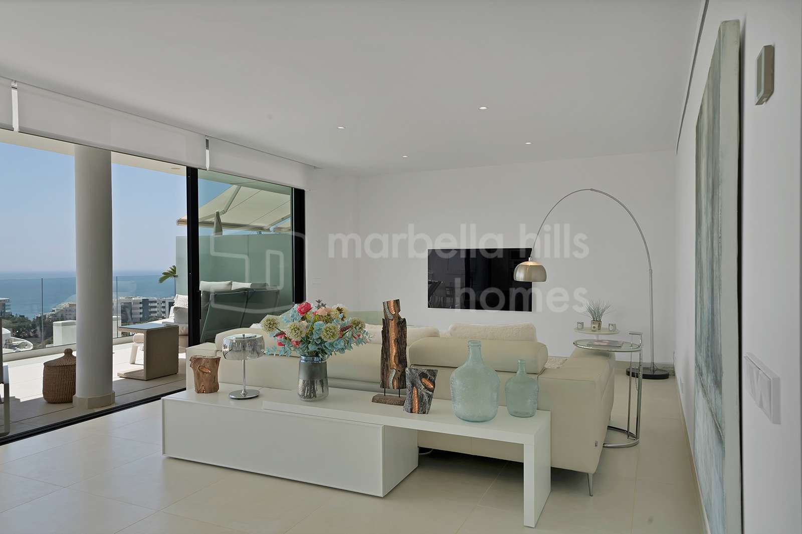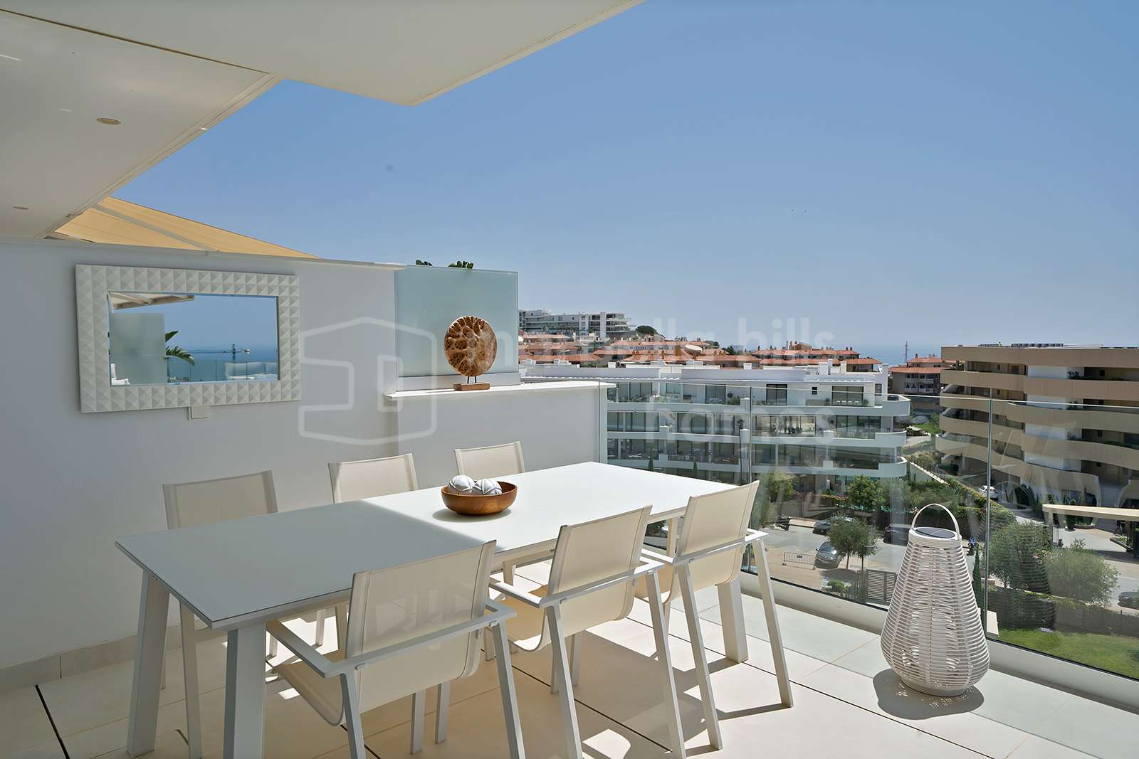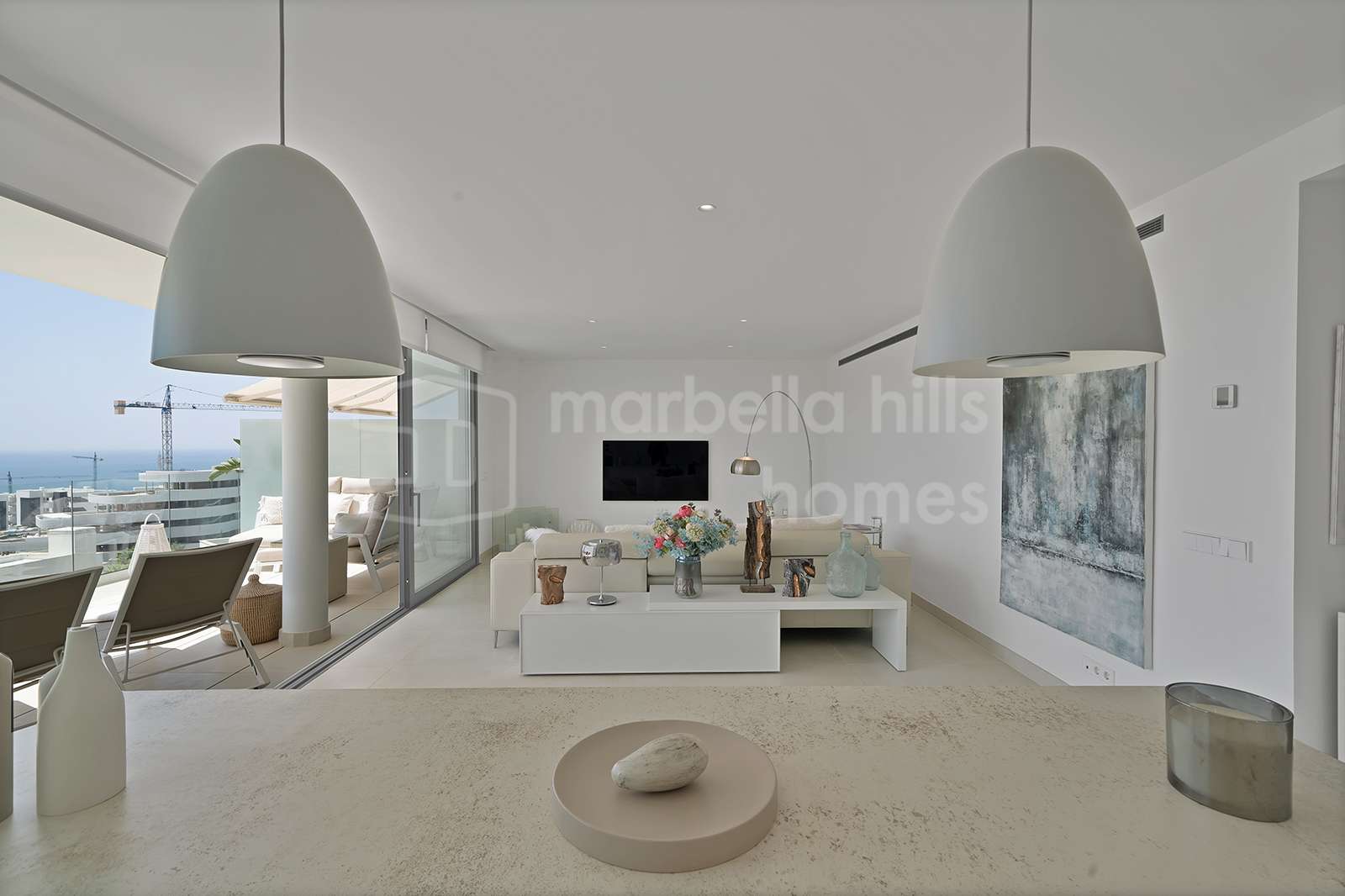 Avec 102 m² habitables et 41 m² de terrasses privées, cet appartement spacieux comprend 2 chambres, 2 salles de bains modernes, dont une en suite avec chauffage au sol. L’un des grands atouts est sa configuration exclusive avec deux terrasses offrant des vues panoramiques sur la mer, les montagnes et les couchers de soleil.
