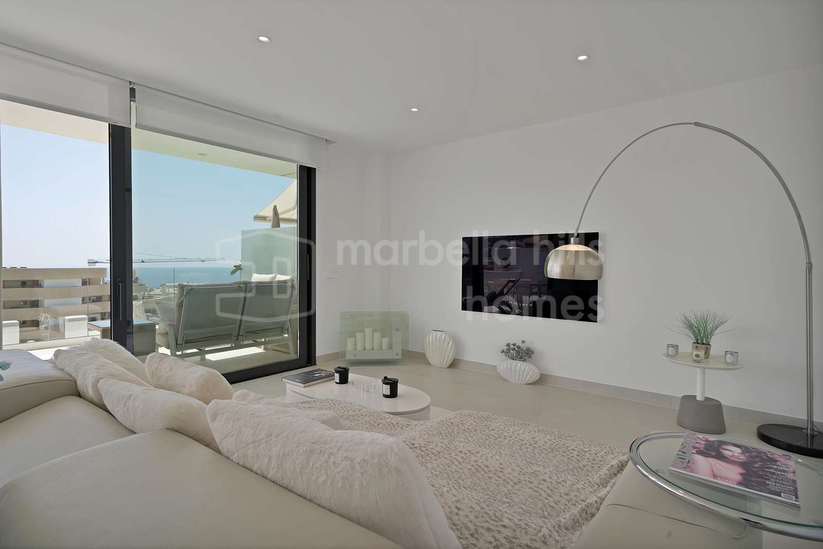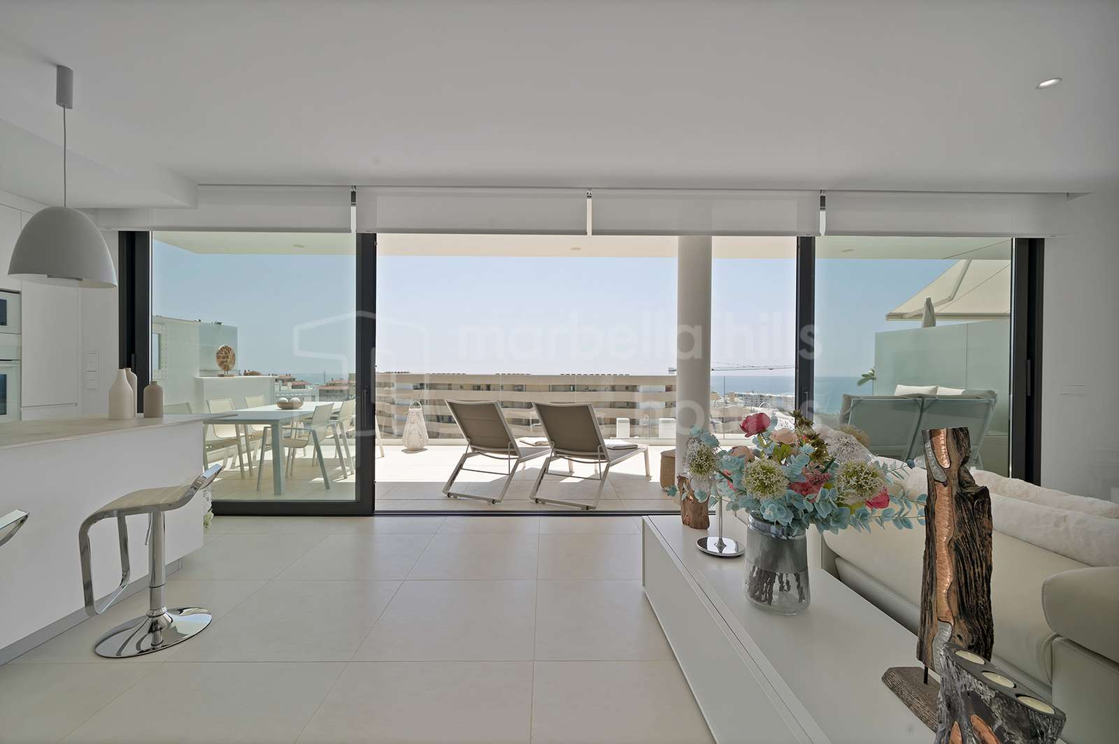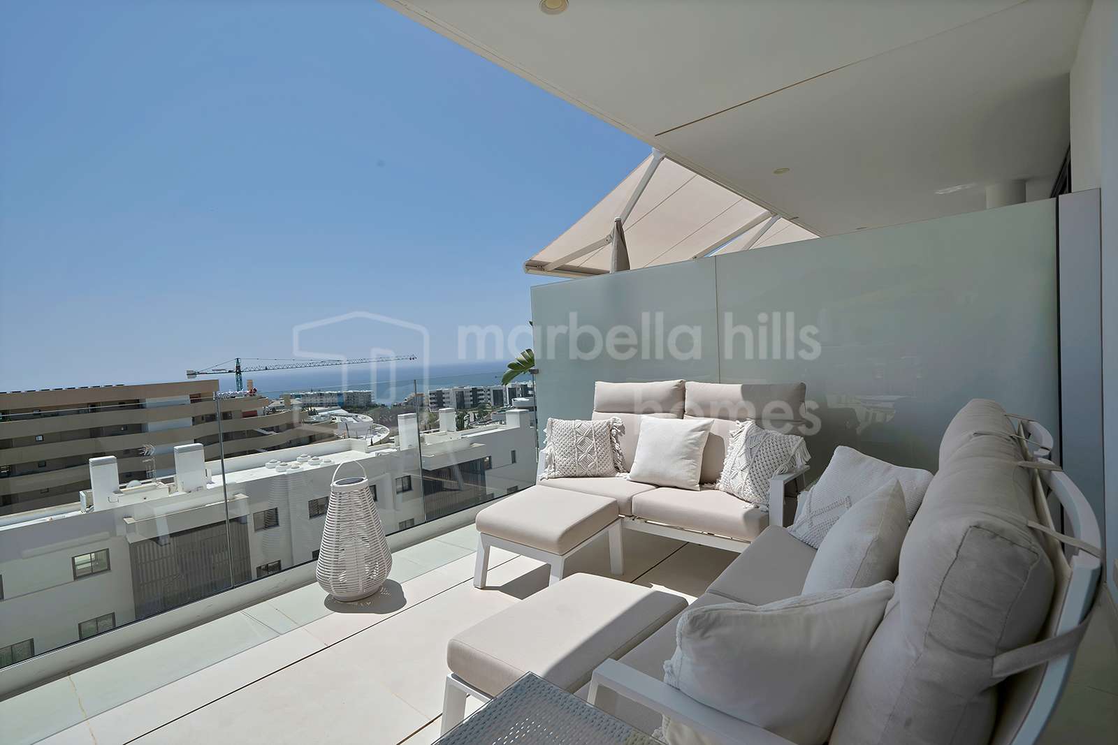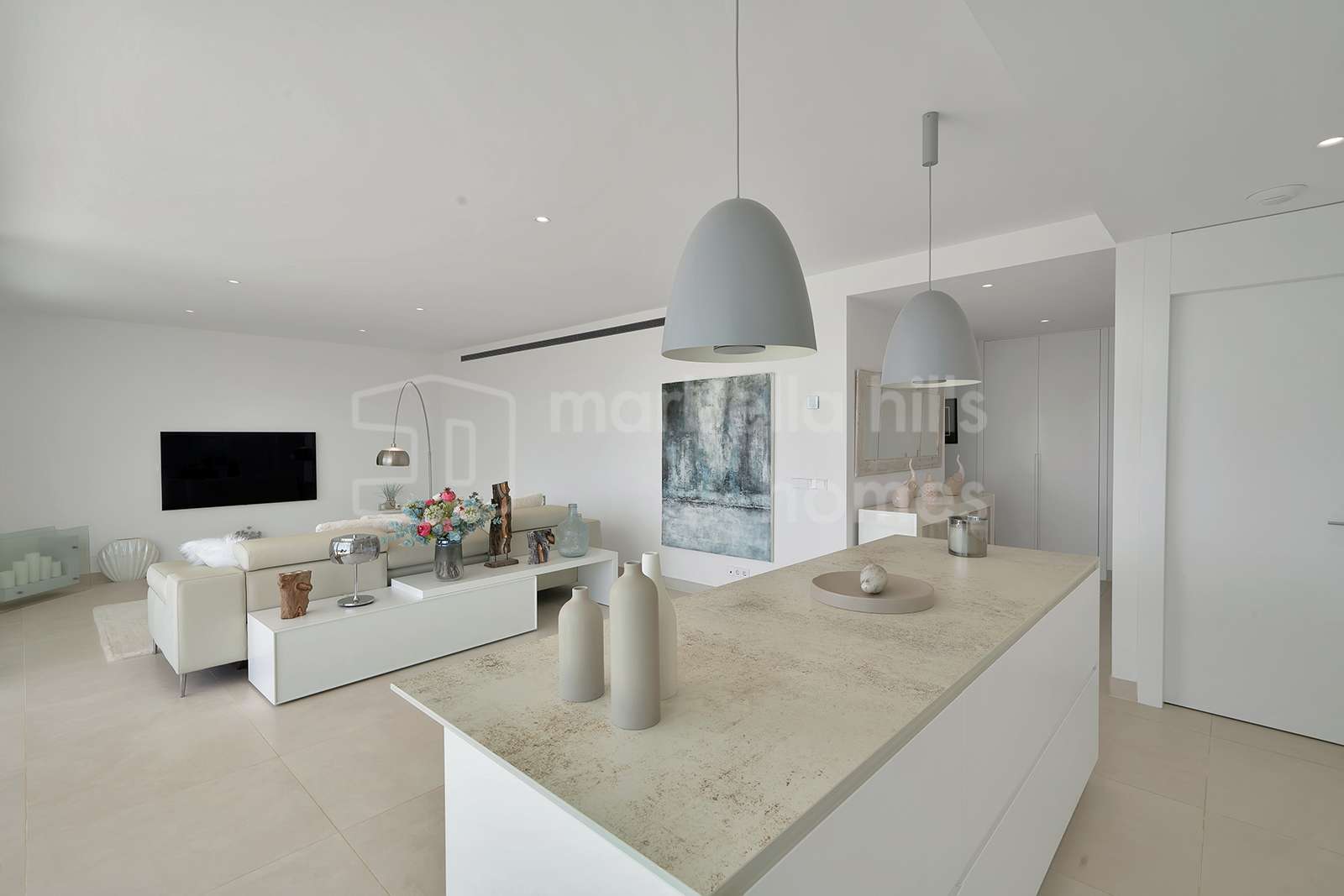 Avec 102 m² habitables et 41 m² de terrasses privées, cet appartement spacieux comprend 2 chambres, 2 salles de bains modernes, dont une en suite avec chauffage au sol. L’un des grands atouts est sa configuration exclusive avec deux terrasses offrant des vues panoramiques sur la mer, les montagnes et les couchers de soleil.