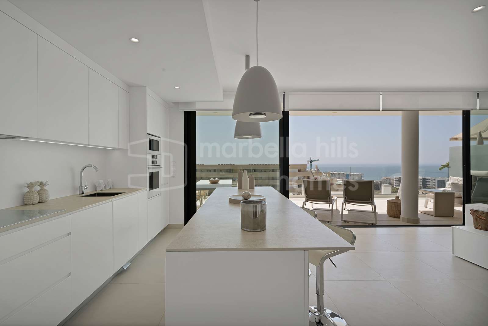 L’espace de vie ouvert avec cuisine intégrée est le plus vaste de toute la promotion, conçu pour maximiser la lumière naturelle et offrir des finitions haut de gamme.