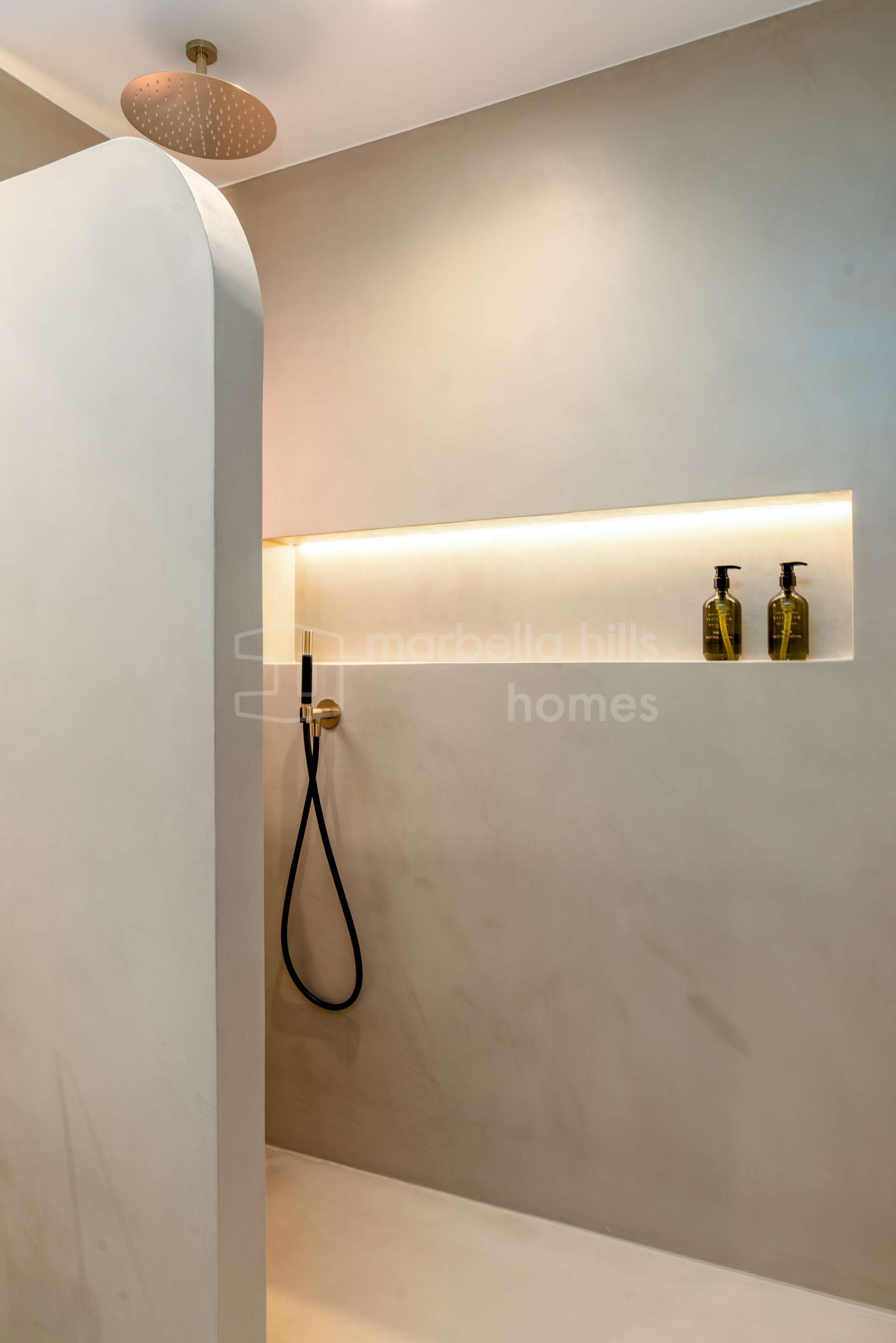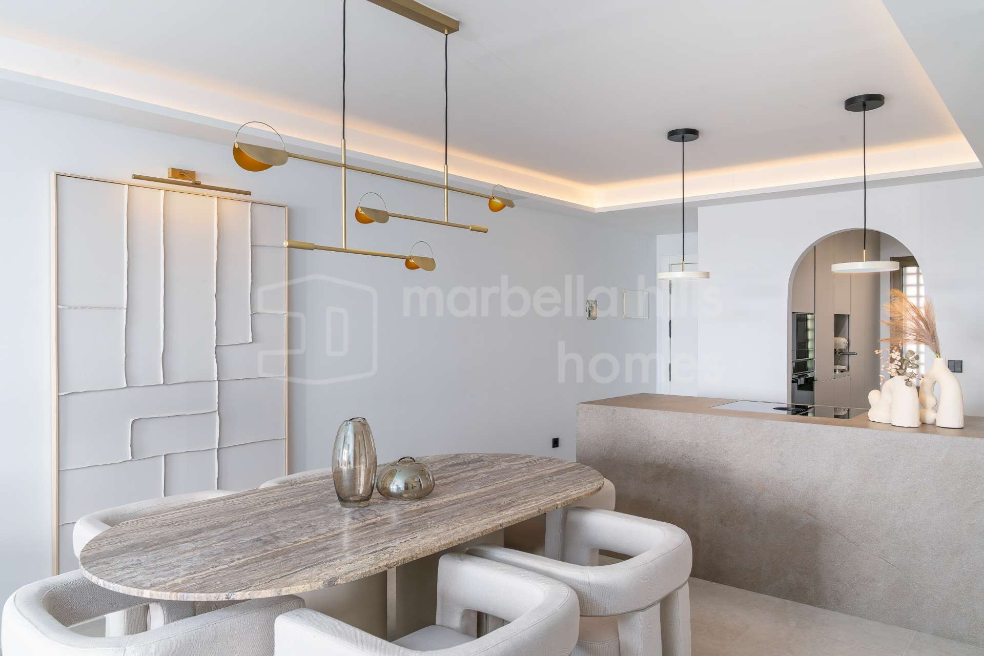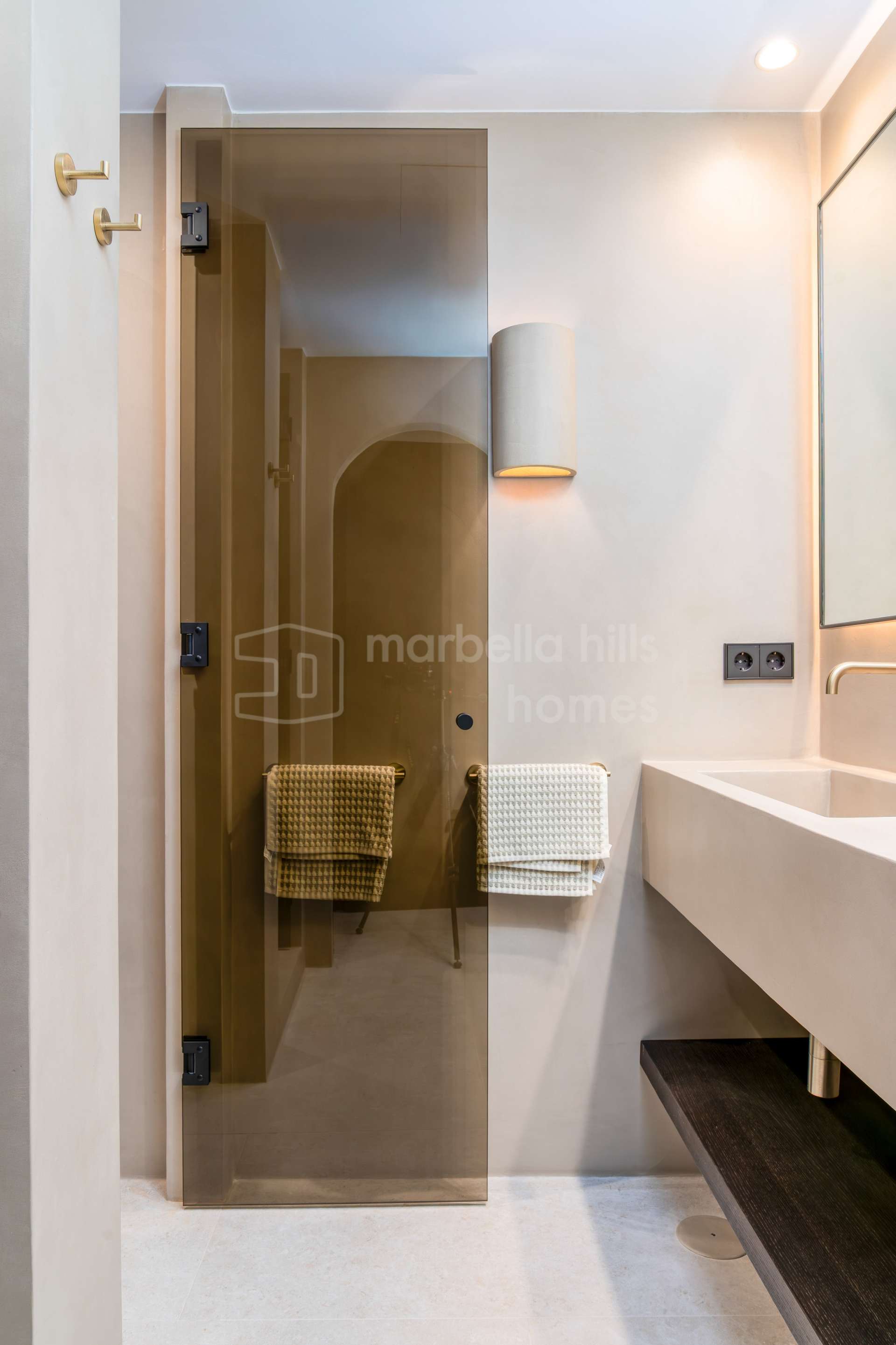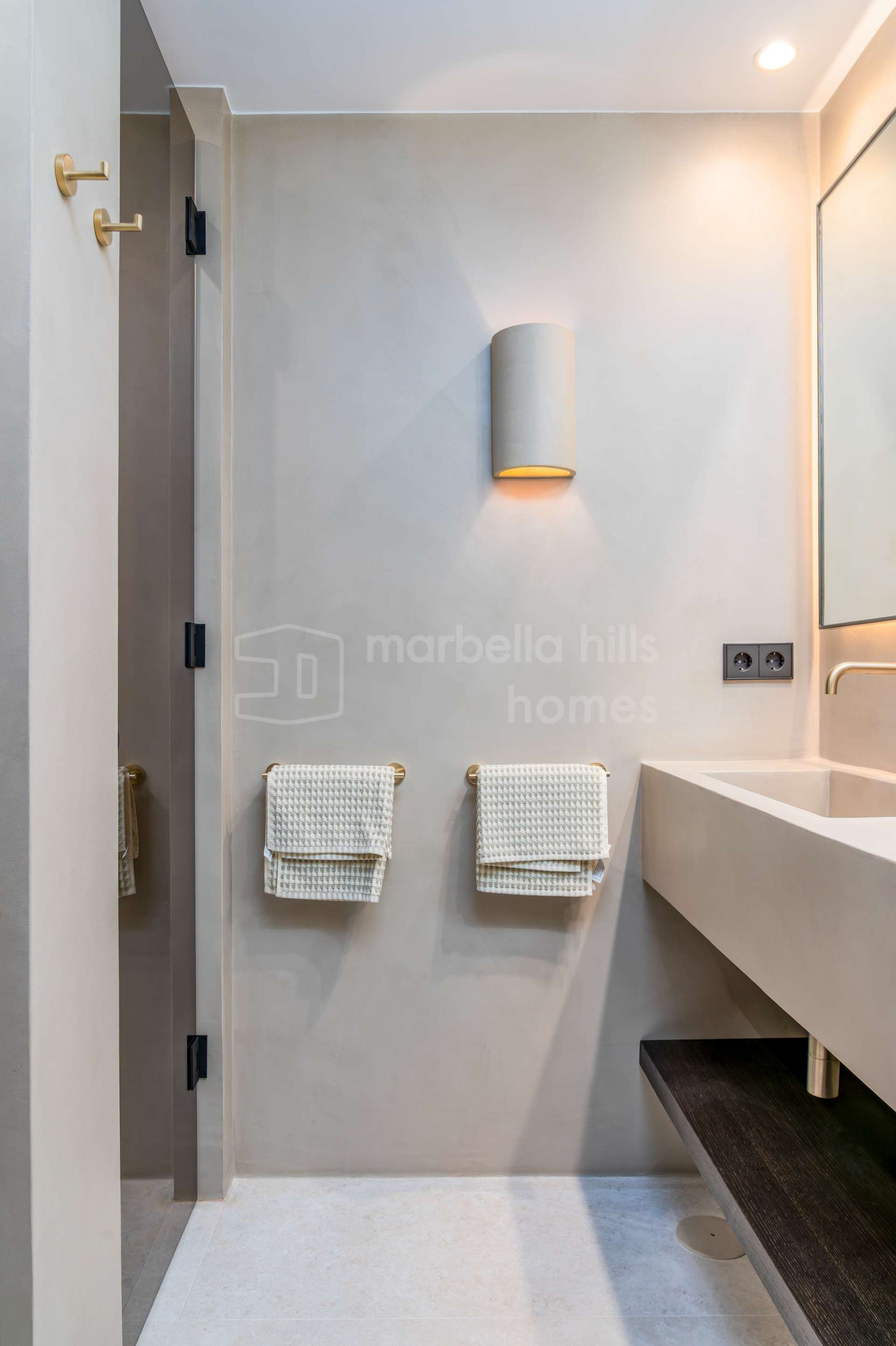 La cuisine ouverte est équipée d’électroménagers Siemens, d’une plaque à induction Bora avec hotte intégrée, et d’un élégant plan de travail en porcelaine Inalco Jasper. L’éclairage indirect apporte une touche de raffinement supplémentaire. Les deux salles de bains, réalisées en microciment chaleureux, sont équipées de robinetterie finition champagne mat et d’un éclairage décoratif discret et moderne.