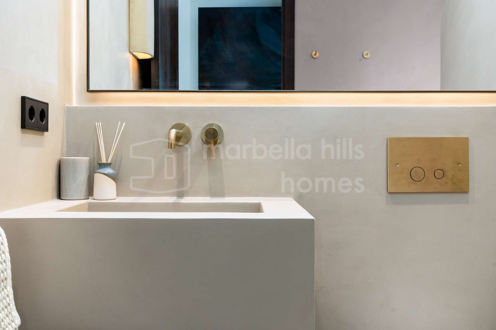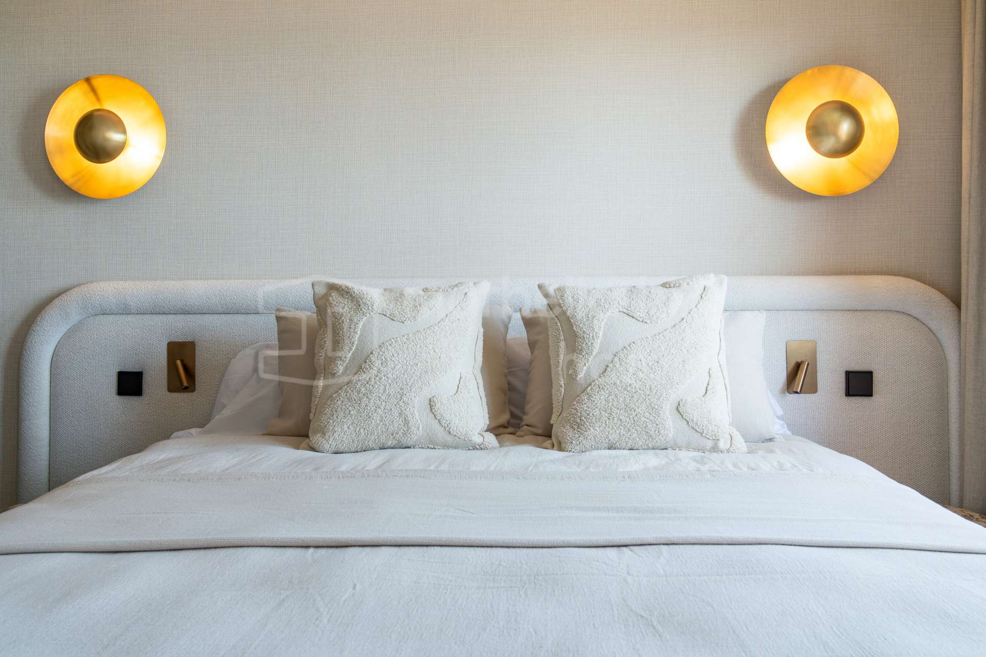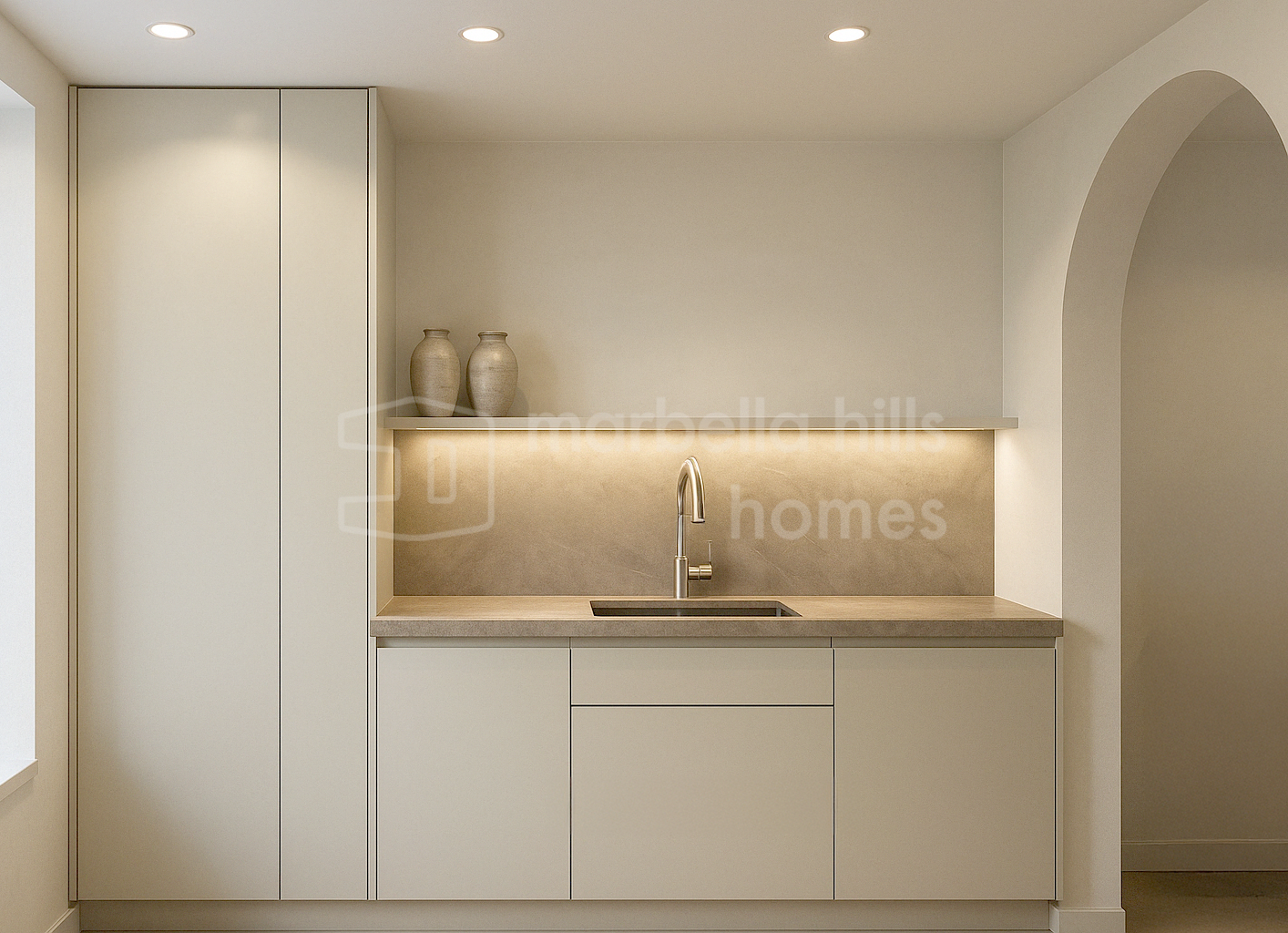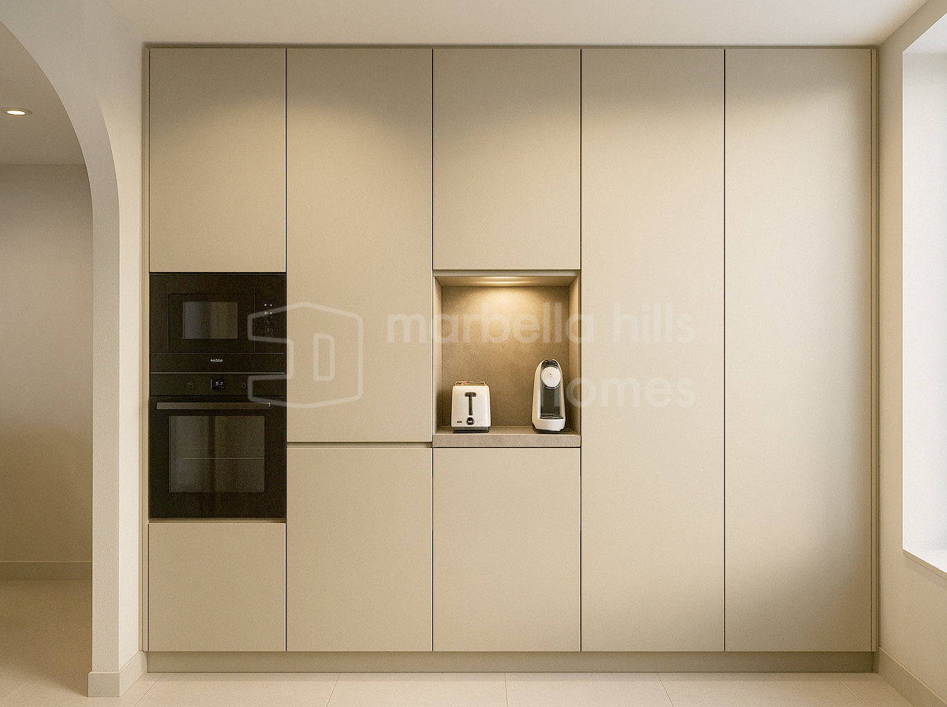 La cuisine ouverte est équipée d’électroménagers Siemens, d’une plaque à induction Bora avec hotte intégrée, et d’un élégant plan de travail en porcelaine Inalco Jasper. L’éclairage indirect apporte une touche de raffinement supplémentaire. Les deux salles de bains, réalisées en microciment chaleureux, sont équipées de robinetterie finition champagne mat et d’un éclairage décoratif discret et moderne.