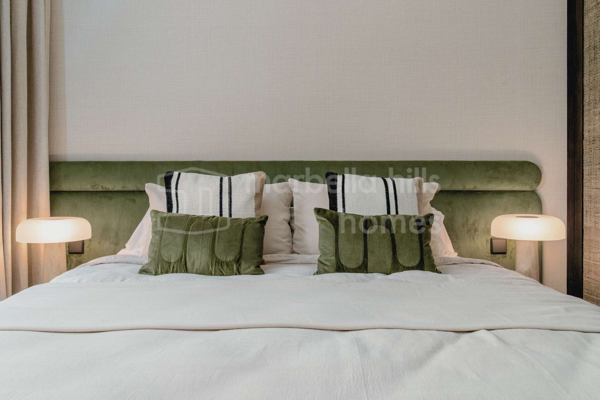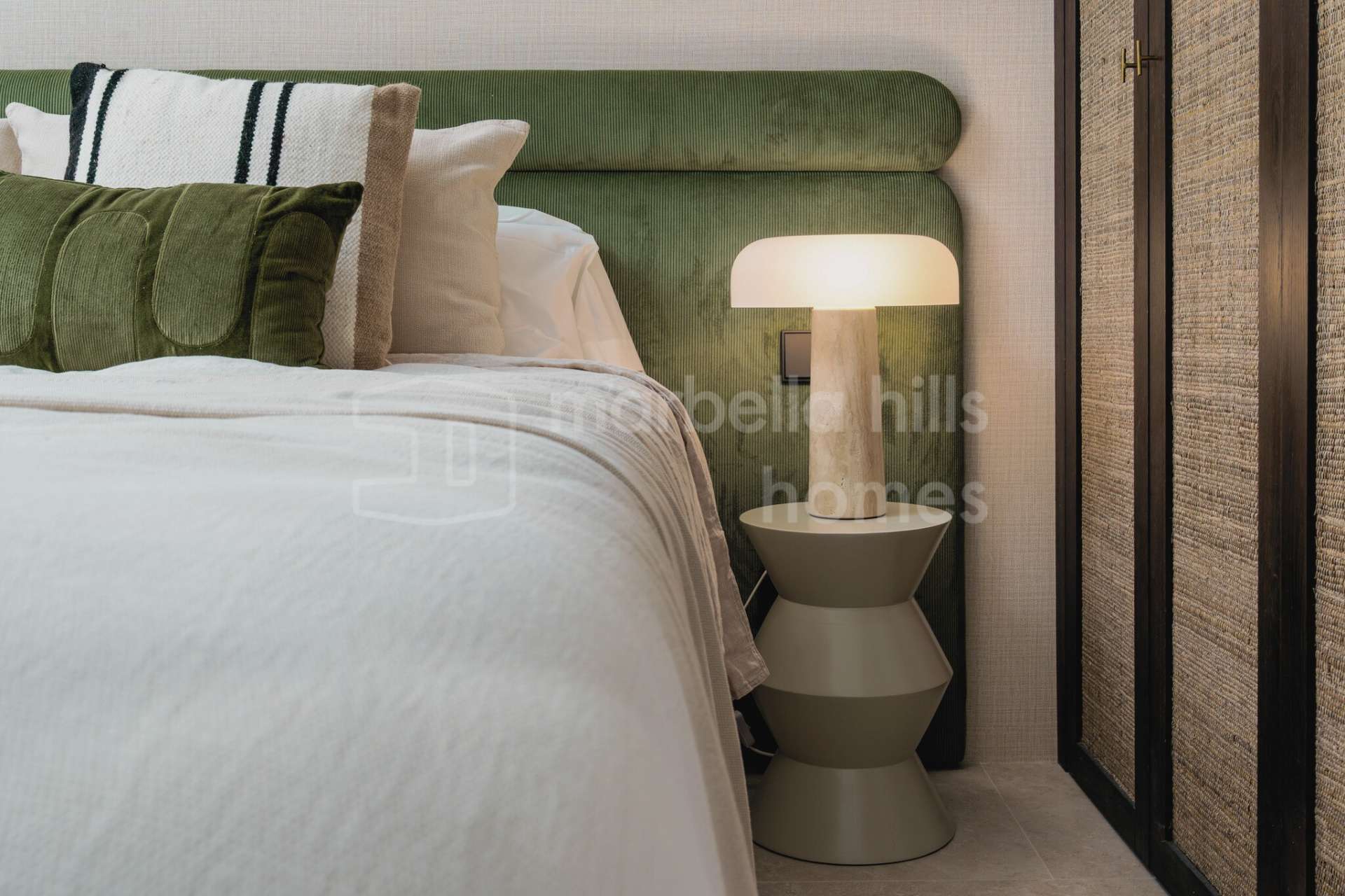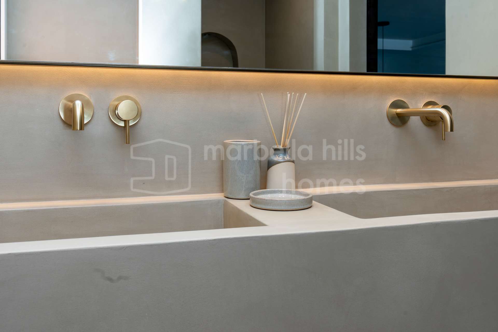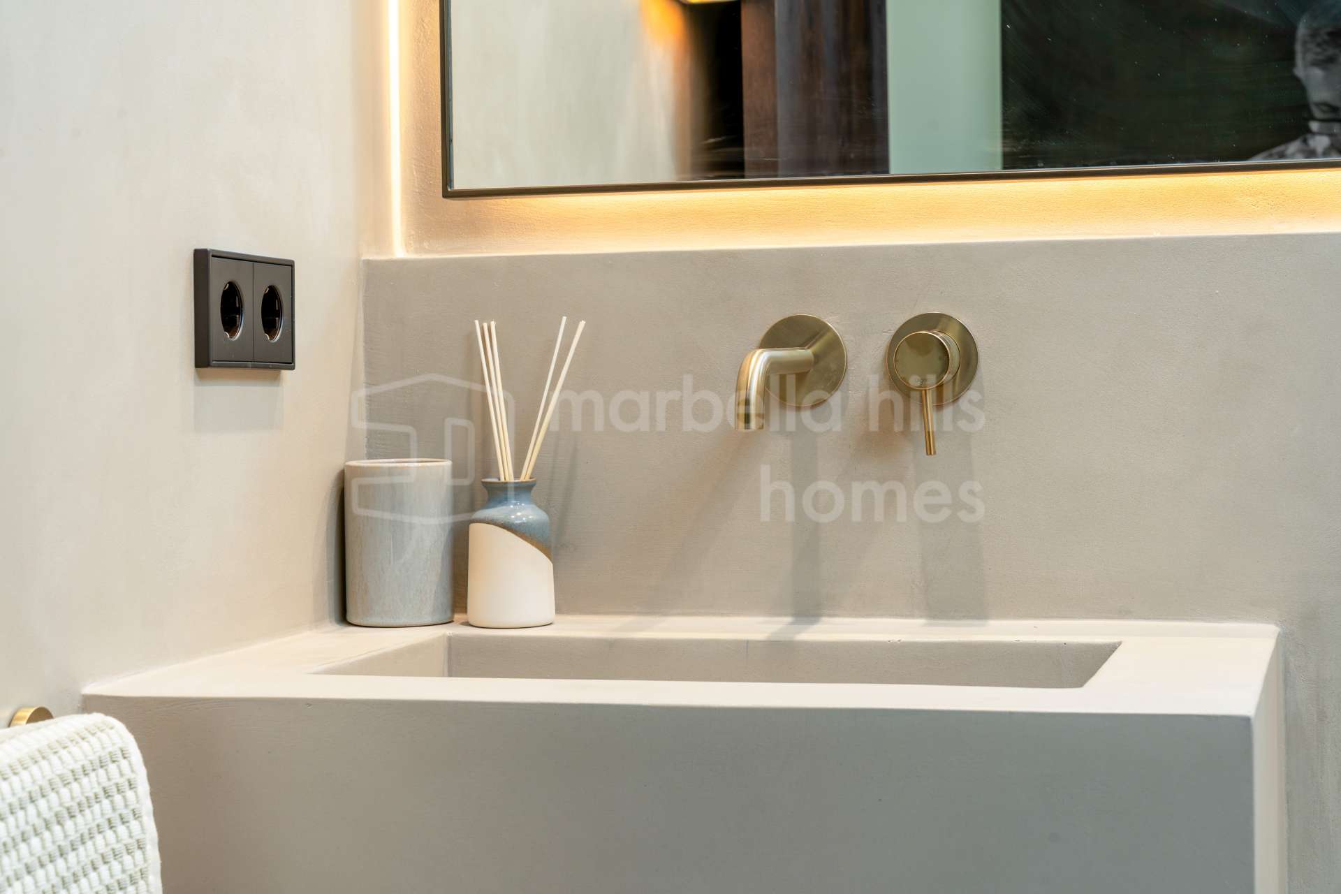La cuisine ouverte est équipée d’électroménagers Siemens, d’une plaque à induction Bora avec hotte intégrée, et d’un élégant plan de travail en porcelaine Inalco Jasper. L’éclairage indirect apporte une touche de raffinement supplémentaire. Les deux salles de bains, réalisées en microciment chaleureux, sont équipées de robinetterie finition champagne mat et d’un éclairage décoratif discret et moderne.