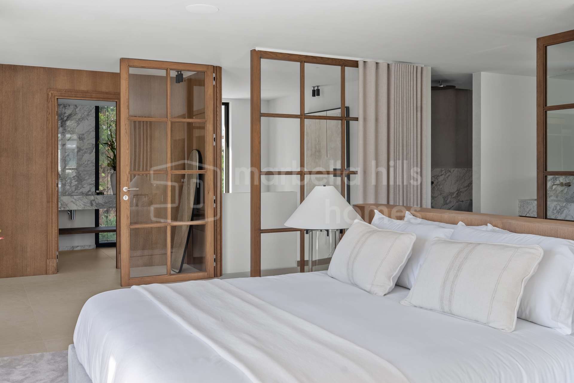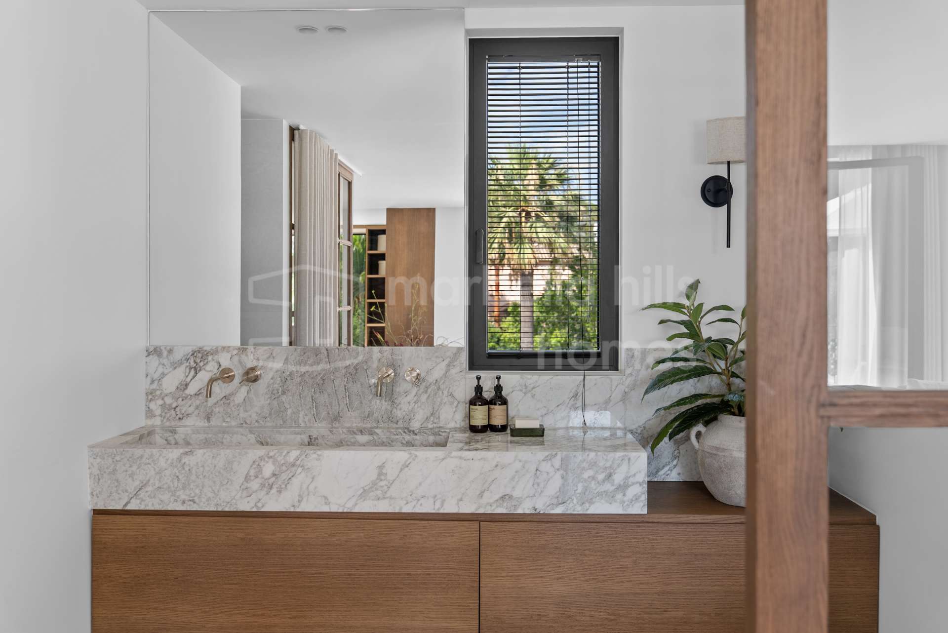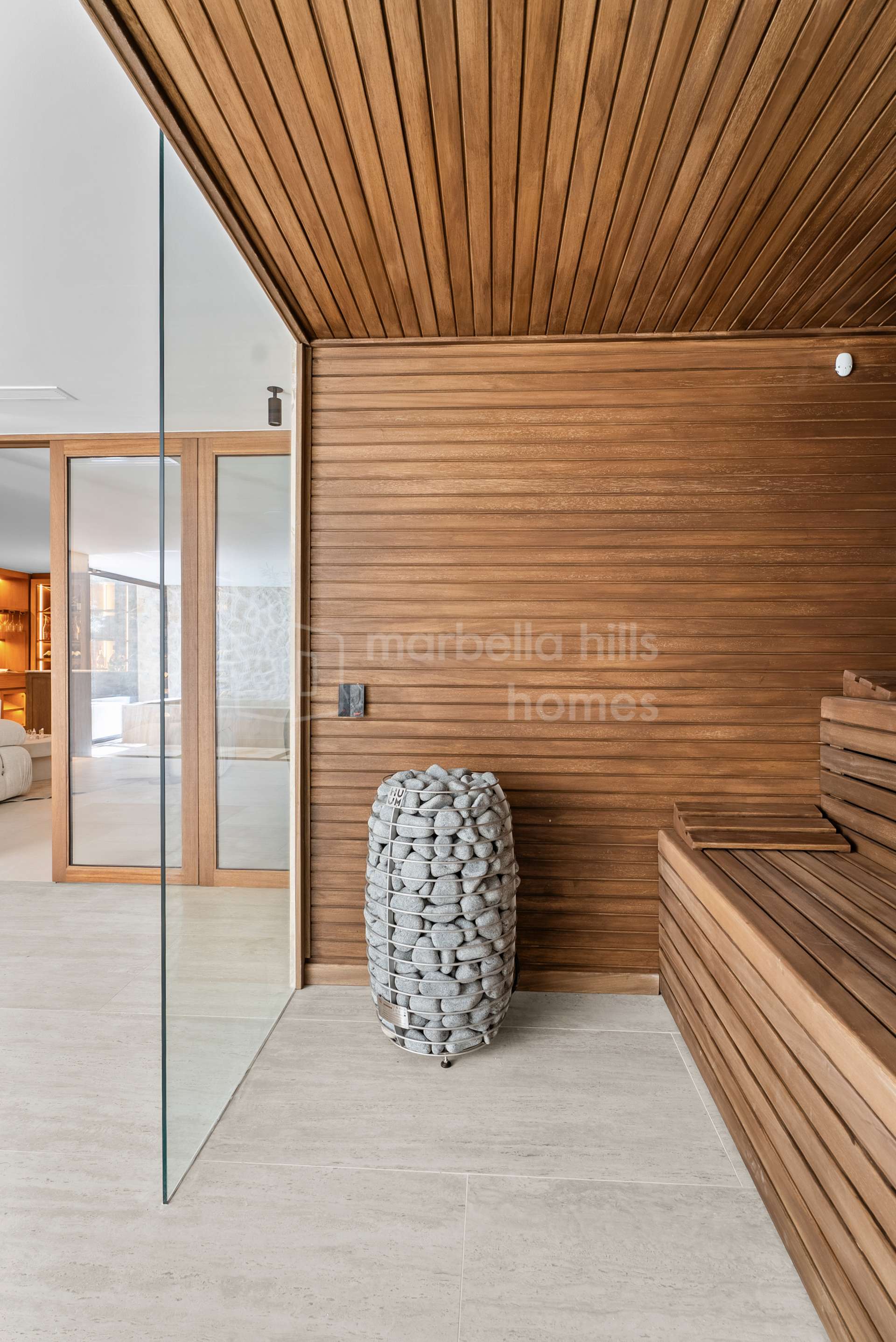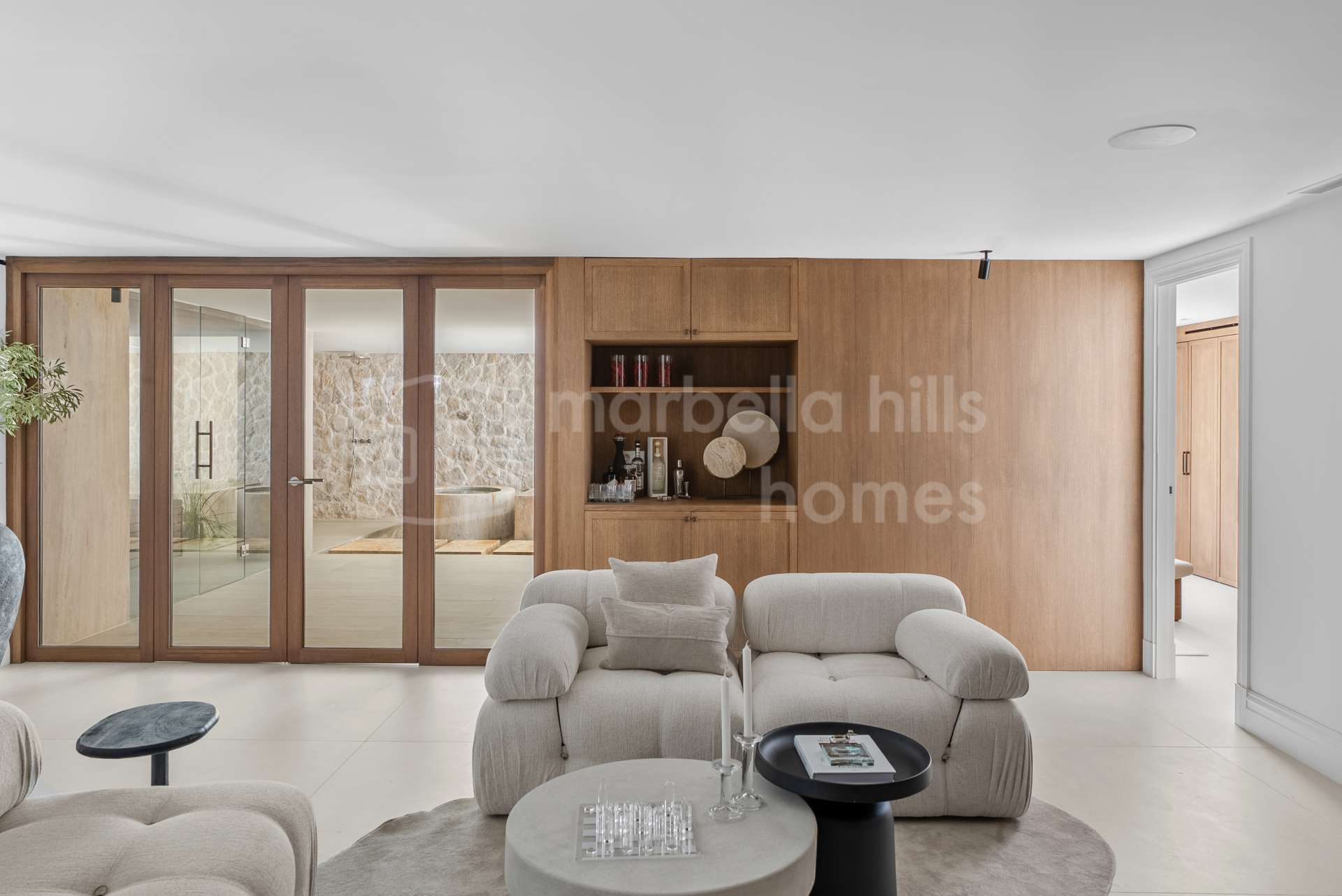 - Architecture contemporaine exclusive à Las Brisas, Nueva Andalucía – 480 m² construits sur un terrain de 1.239 m² – 4 chambres | 6 salles de bains – Salle de cinéma et cave à vin privée – Espace spa avec sauna et chauffage au sol – Piscine d’eau salée, jardin privé et terrasses couvertes – Communauté sécurisée en front de golf, proche de la plage et de Puerto Banús