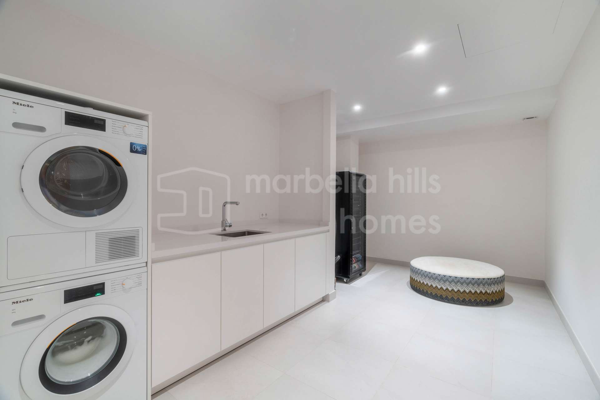 Les intérieurs, entièrement meublés par Ambience, associent élégance et fonctionnalité. Le chauffage au sol dans toute la villa, les systèmes audio et TV intégrés Bang & Olufsen ainsi que le système domotique Lutron garantissent un niveau de confort et de technologie attendu dans une villa de luxe à Marbella.
