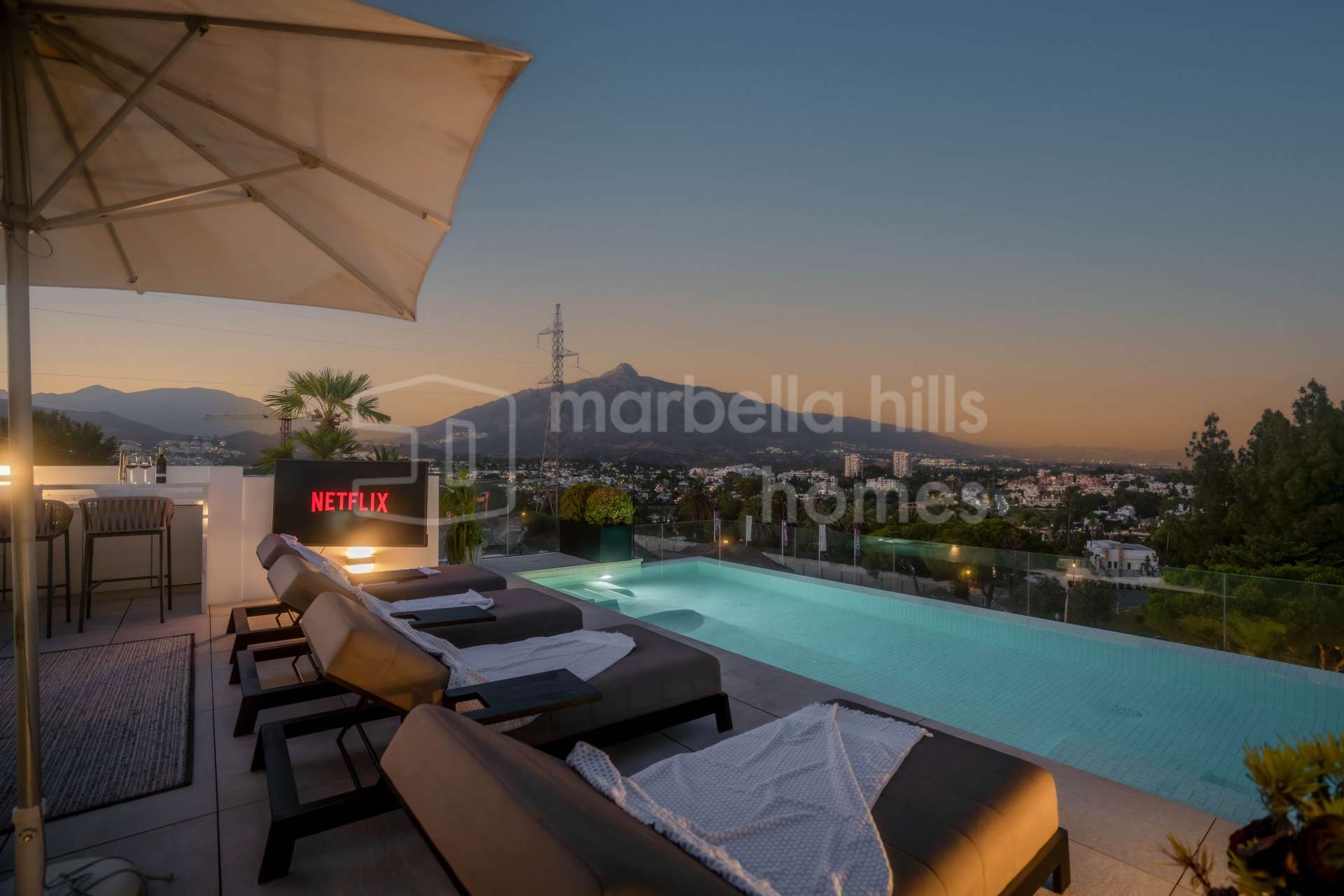 Au sommet, un solarium sur le toit conçu sur mesure, avec une piscine privée de type plunge pool, offre des vues panoramiques sur le Golf Valley de Marbella et l’emblématique montagne de La Concha — une signature des villas haut de gamme à Marbella.