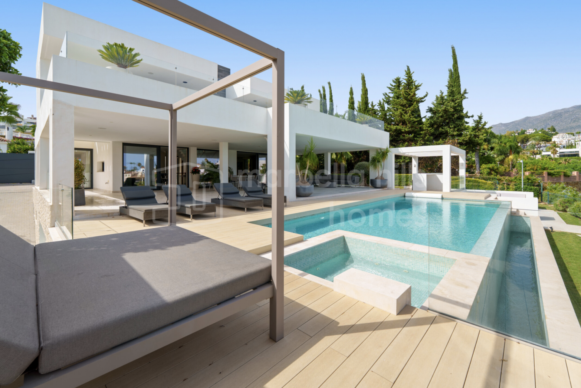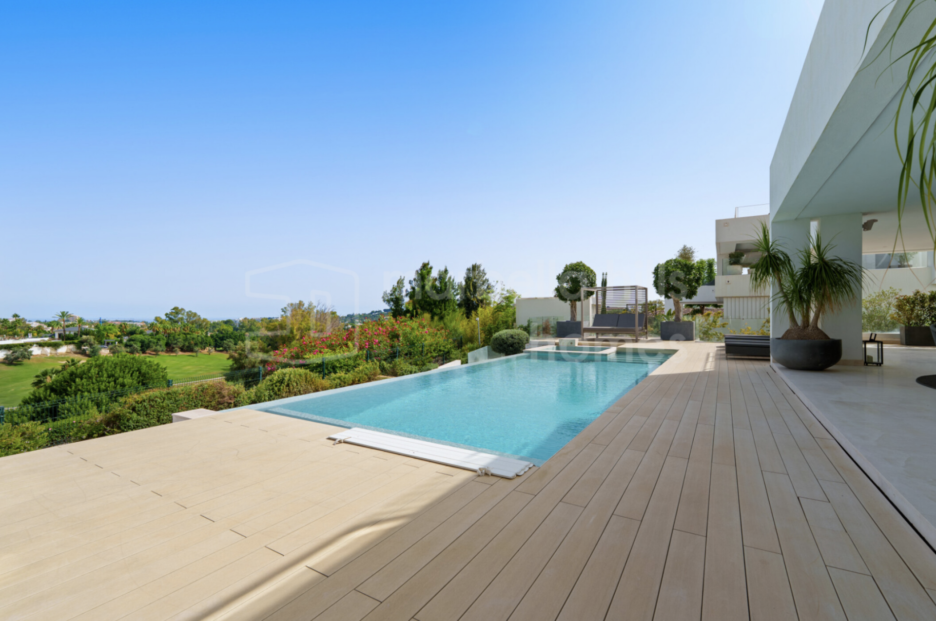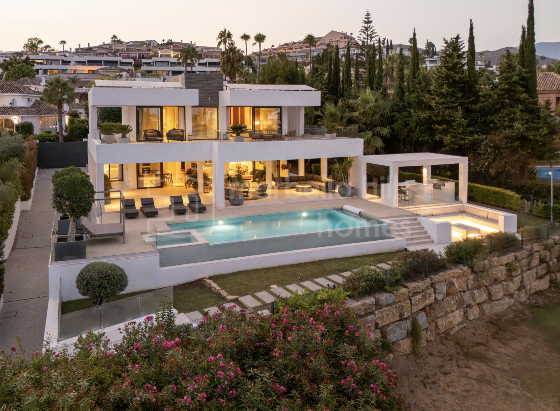 - Chambres : 6 – Salles de bains : 8 – Niveaux : 3 – Garage privé – Piscine à débordement – Système domotique – Cave à vin, salle de sport et espaces lounge